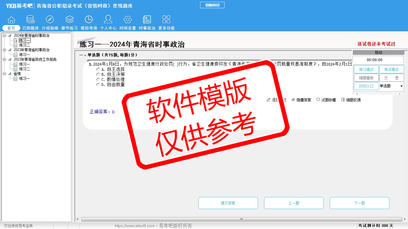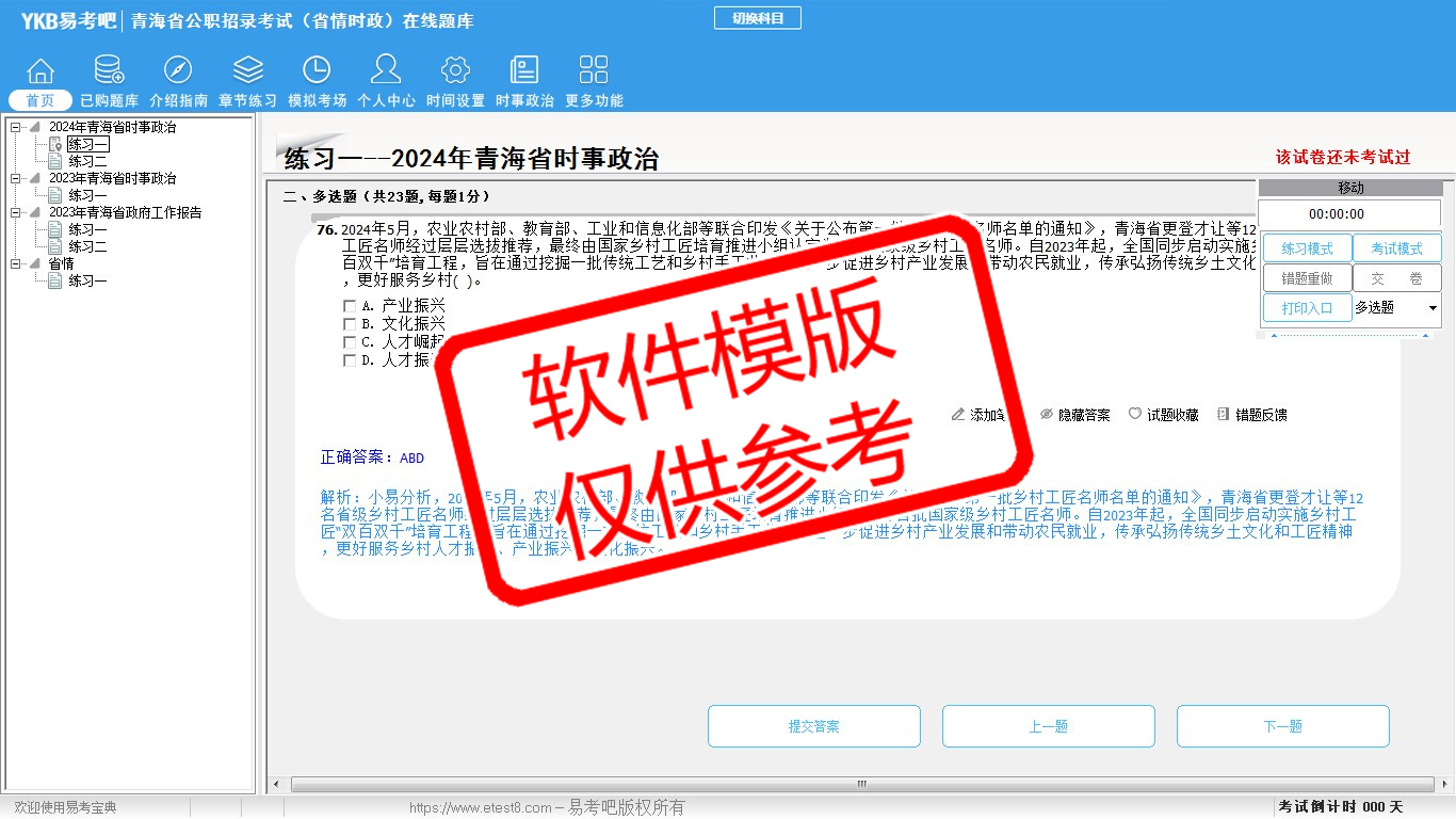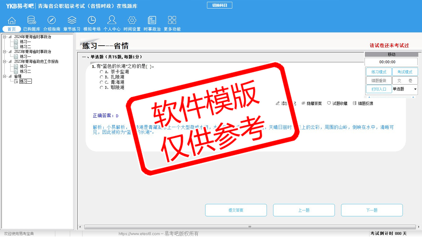 2026年青海省公职招录考试时政热点(省情时政)易考宝典软件(手机/网页版)是《易考宝典》考试系列软件之一,是专门为参加“时政省情职业资格考试”的朋友量身定做的自我测试系统,是个人、培训学校进行考试前训练、备考冲刺的提分技巧考试平台,题型丰富,图文并茂,内容全面,题库设计符合考试新大纲,海量试题。软件包括了富有价值的模拟考场,有计时打分等功能,就像亲身体会考试一样。