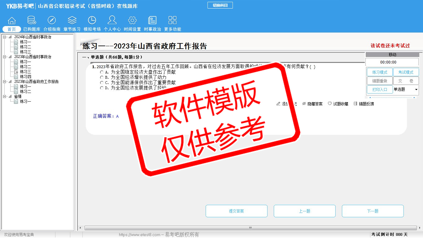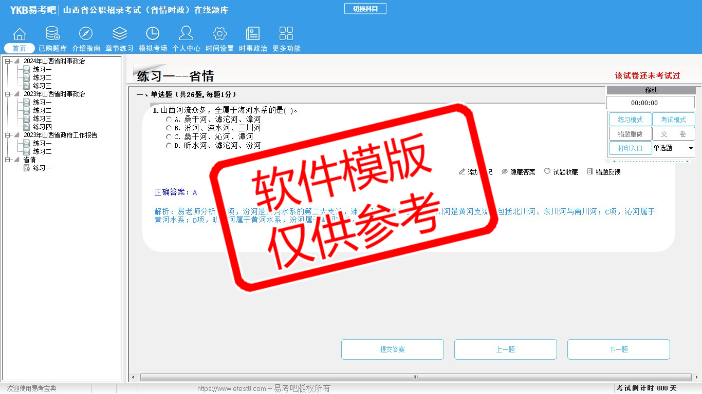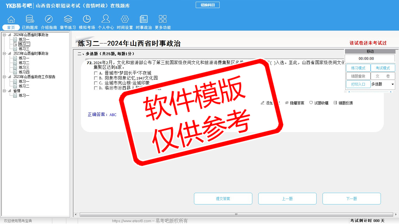 2026年山西省公职招录考试时政热点(省情时政)易考宝典软件(手机/网页版)是《易考宝典》考试系列软件之一,是专门为参加“时政省情职业资格考试”的朋友量身定做的自我测试系统,是个人、培训学校进行考试前训练、备考冲刺的提分技巧考试平台,题型丰富,图文并茂,内容全面,题库设计符合考试新大纲,海量试题。软件包括了富有价值的模拟考场,有计时打分等功能,就像亲身体会考试一样。