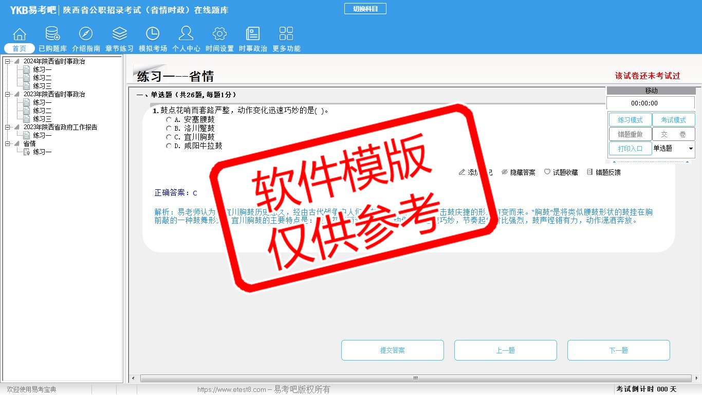 2026年陕西省公职招录考试时政热点(省情时政)易考宝典软件(手机/网页版)是《易考宝典》考试系列软件之一,是专门为参加“时政省情职业资格考试”的朋友量身定做的自我测试系统,是个人、培训学校进行考试前训练、备考冲刺的提分技巧考试平台,题型丰富,图文并茂,内容全面,题库设计符合考试新大纲,海量试题。软件包括了富有价值的模拟考场,有计时打分等功能,就像亲身体会考试一样。