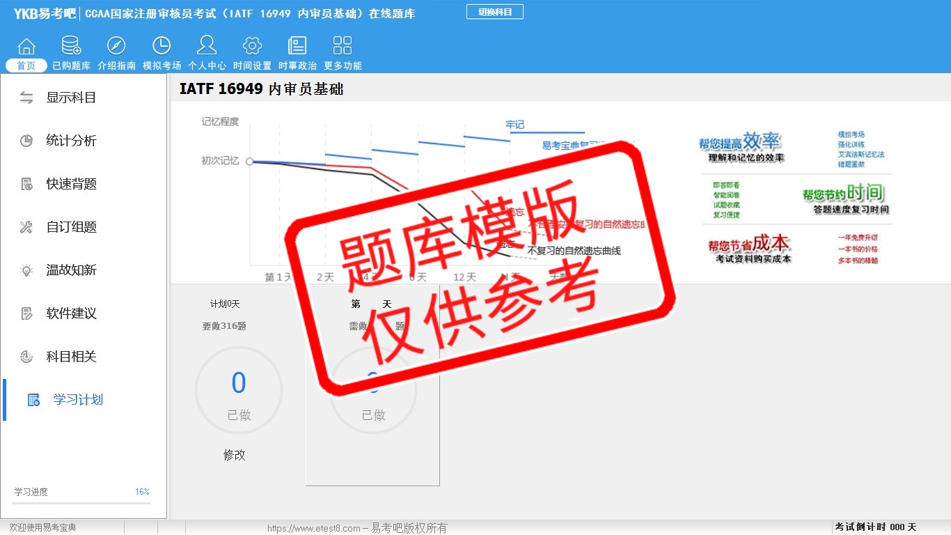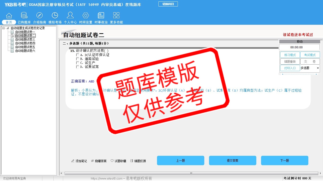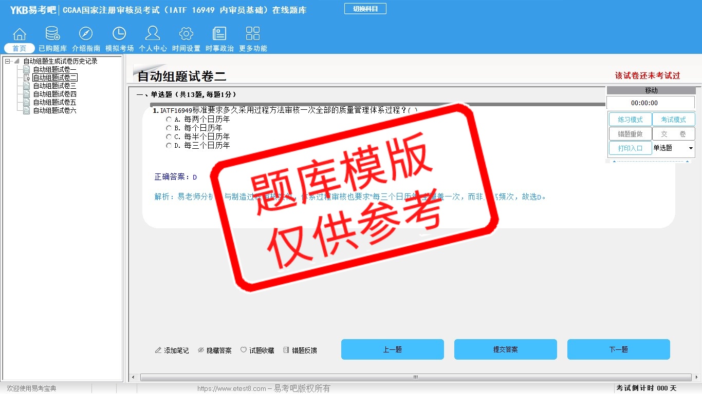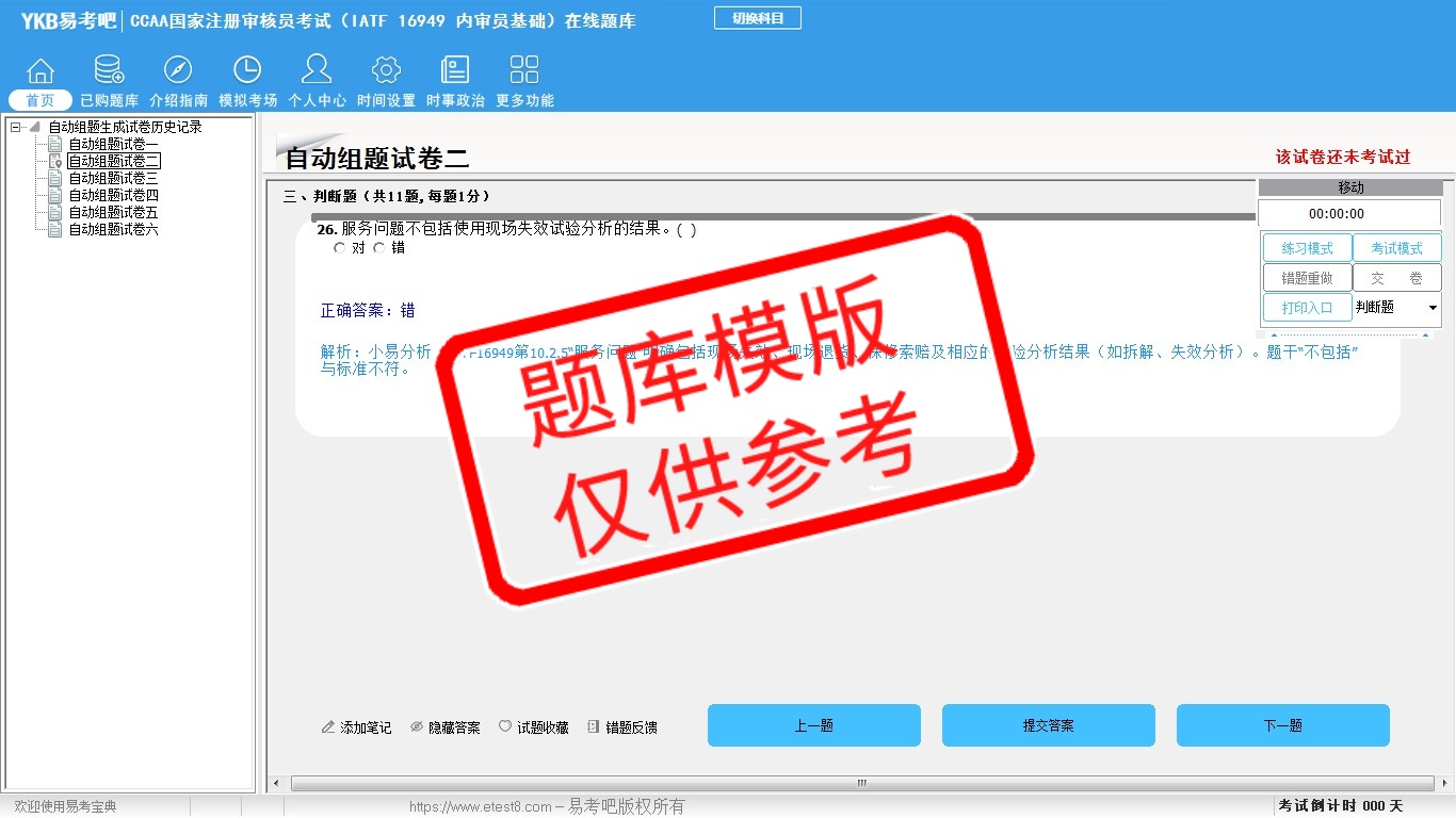 2026年CCAA国家注册审核员考试(IATF 16949 内审员基础)易考宝典软件(手机/网页版)是《易考宝典》考试系列软件之一,是专门为参加“CCAA审核员职业资格考试”的朋友量身定做的自我测试系统,是个人、培训学校进行考试前训练、备考冲刺的提分技巧考试平台,题型丰富,图文并茂,内容全面,题库设计符合考试新大纲,海量试题。软件包括了富有价值的模拟考场,有计时打分等功能,就像亲身体会考试一样。