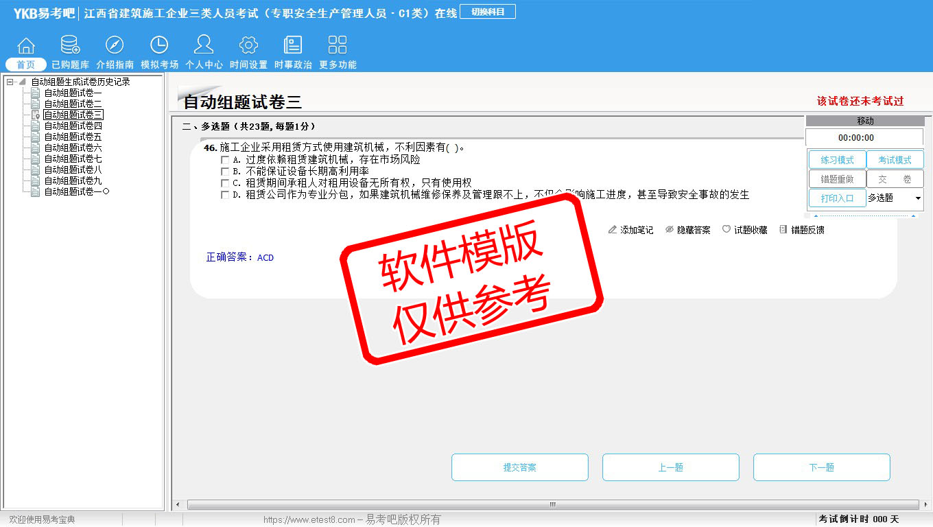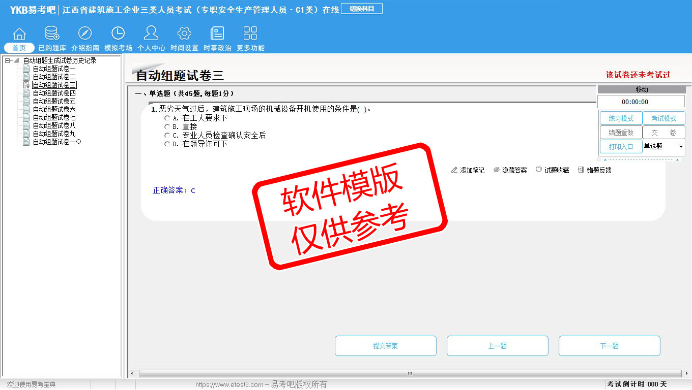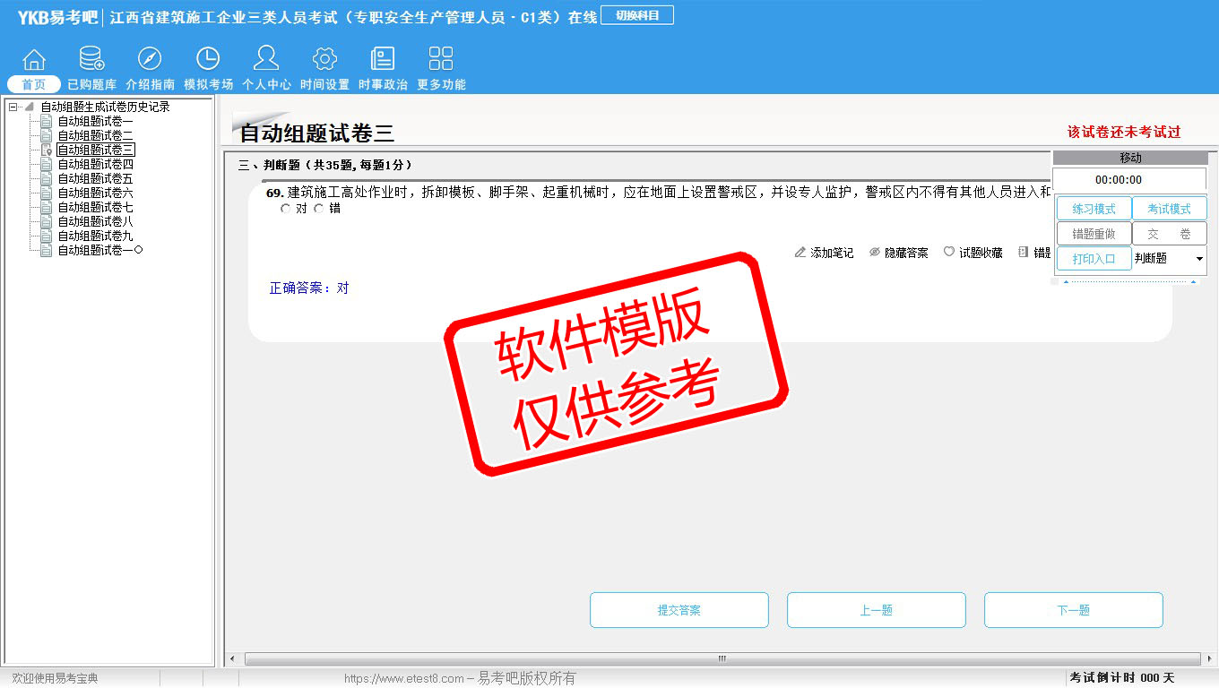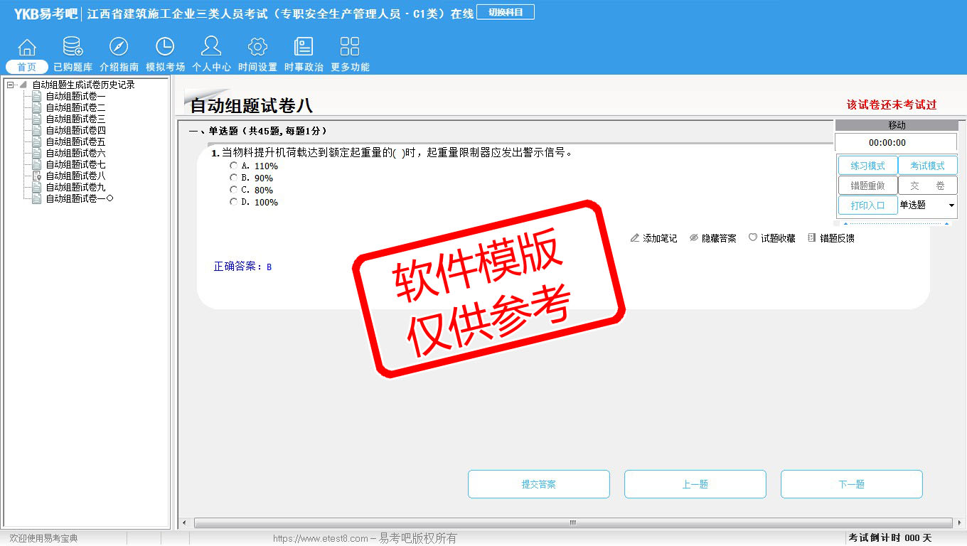 2026年江西省建筑施工企业三类人员考试(专职安全生产管理人员·C1类)易考宝典软件(机械类)(手机/网页版)是《易考宝典》考试系列软件之一,是专门为参加“安管人员职业资格考试”的朋友量身定做的自我测试系统,是个人、培训学校进行考试前训练、备考冲刺的提分技巧考试平台,题型丰富,图文并茂,内容全面,题库设计符合考试新大纲,海量试题。软件包括了富有价值的模拟考场,有计时打分等功能,就像亲身体会考试一样。