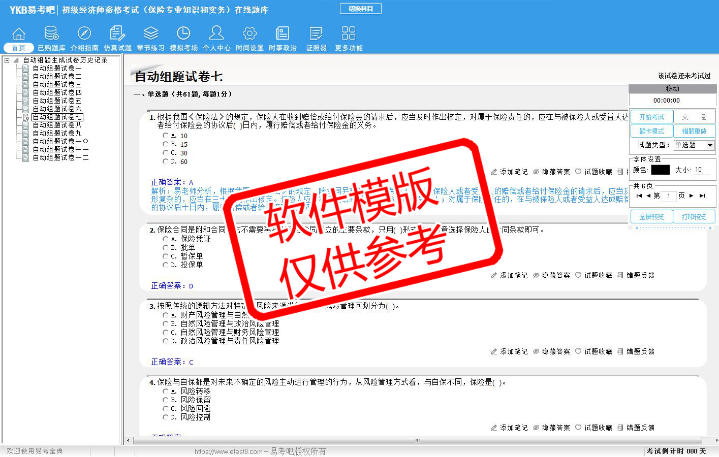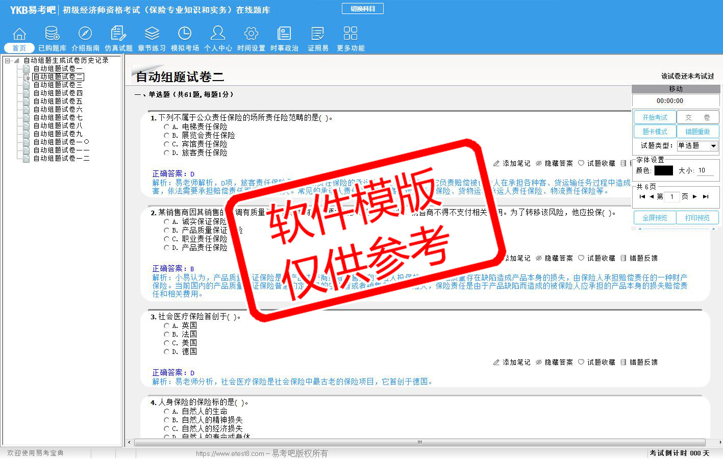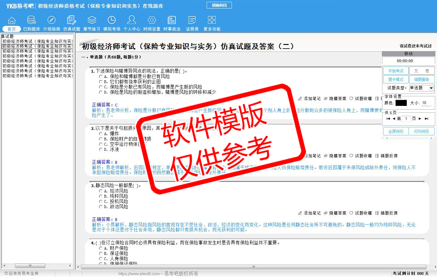 2026年初级经济师资格考试(经济基础知识+保险专业知识与实务)易考宝典软件(手机/网页版)是《易考宝典》考试系列软件之一,是专门为参加“经济师职业资格考试”的朋友量身定做的自我测试系统,是个人、培训学校进行考试前训练、备考冲刺的提分技巧考试平台,题型丰富,图文并茂,内容全面,题库设计符合考试新大纲,海量试题。软件包括了富有价值的模拟考场,有计时打分等功能,就像亲身体会考试一样。