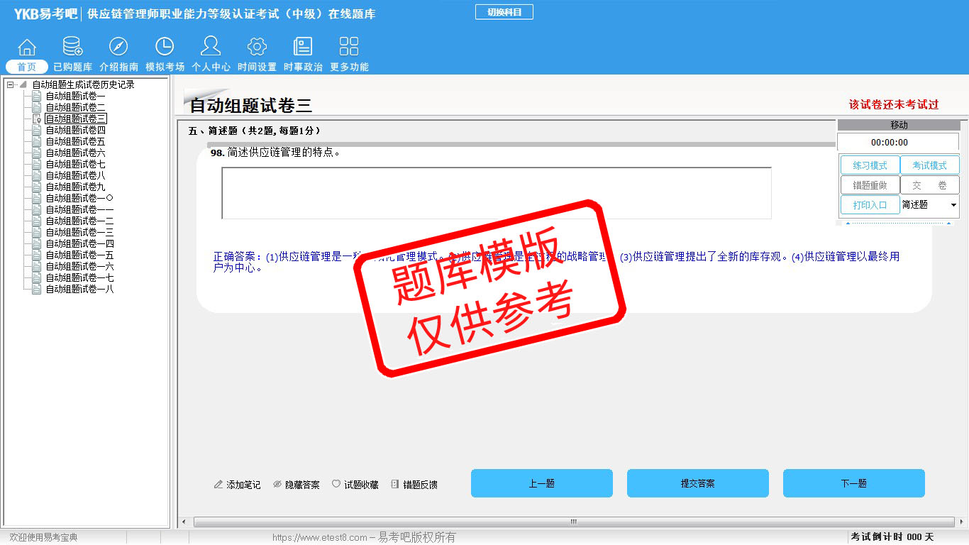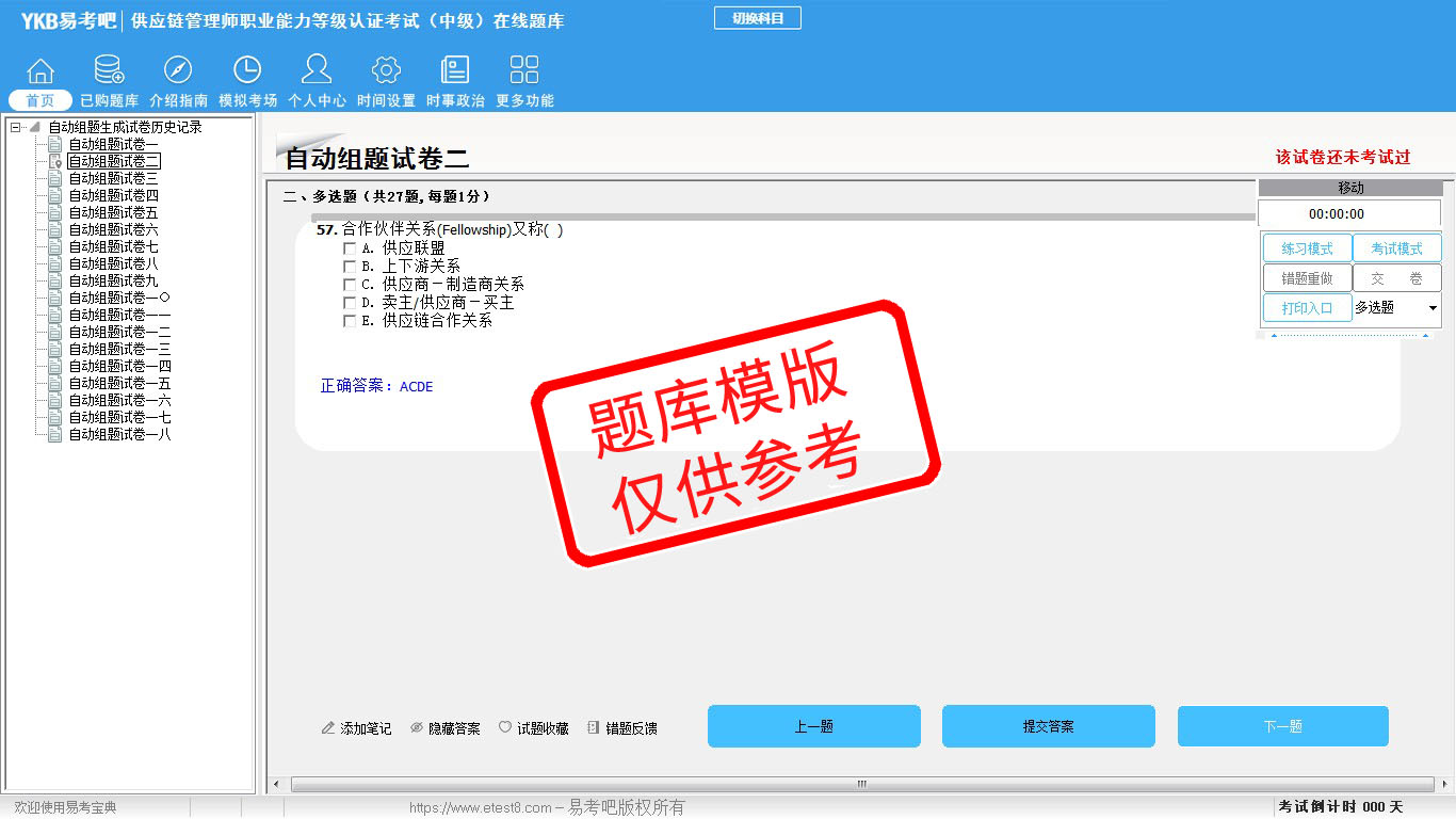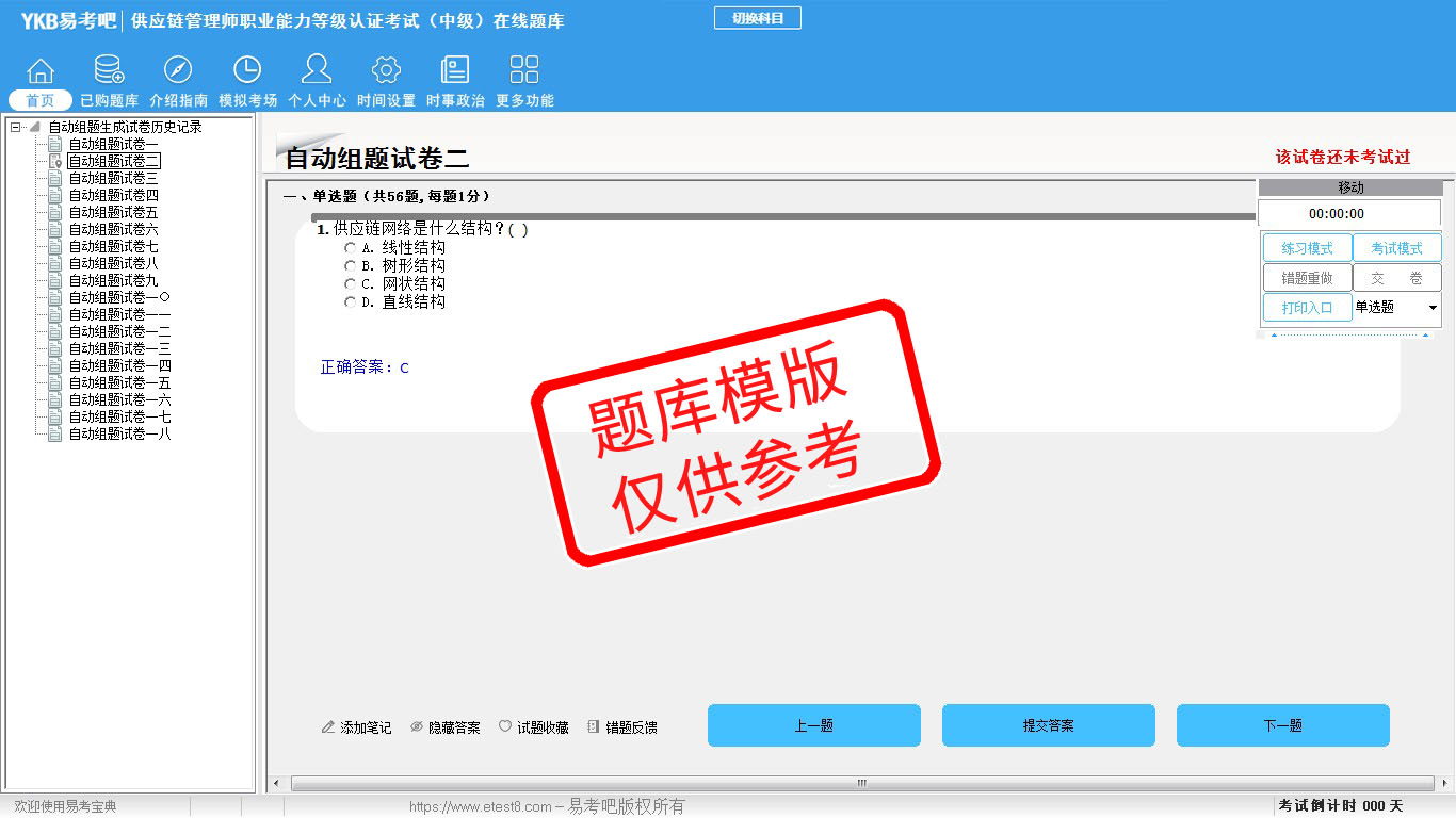 2026年供应链管理师职业能力等级认证考试(中级)易考宝典软件(手机/网页版)是《易考宝典》考试系列软件之一,是专门为参加“物流职业资格考试”的朋友量身定做的自我测试系统,是个人、培训学校进行考试前训练、备考冲刺的提分技巧考试平台,题型丰富,图文并茂,内容全面,题库设计符合考试新大纲,海量试题。软件包括了富有价值的模拟考场,有计时打分等功能,就像亲身体会考试一样。