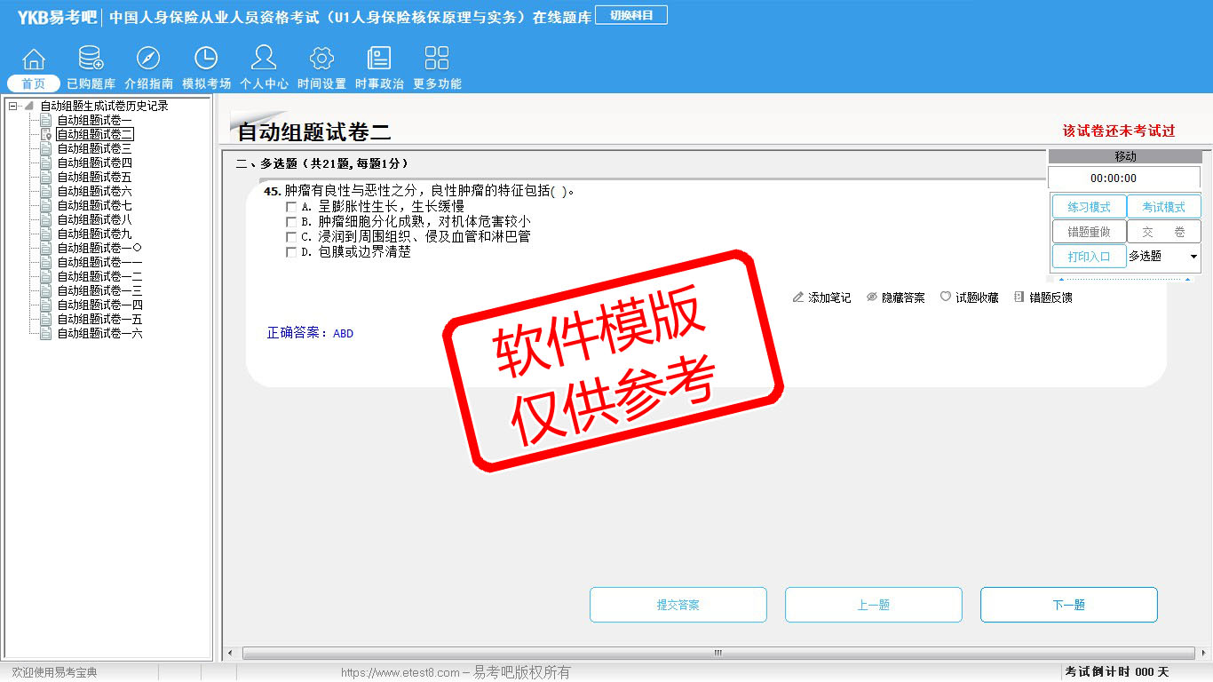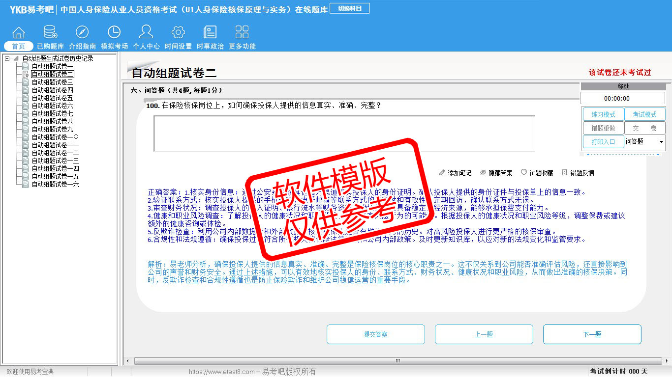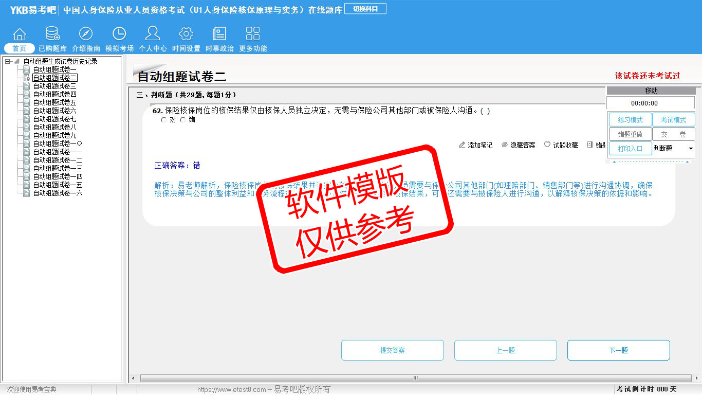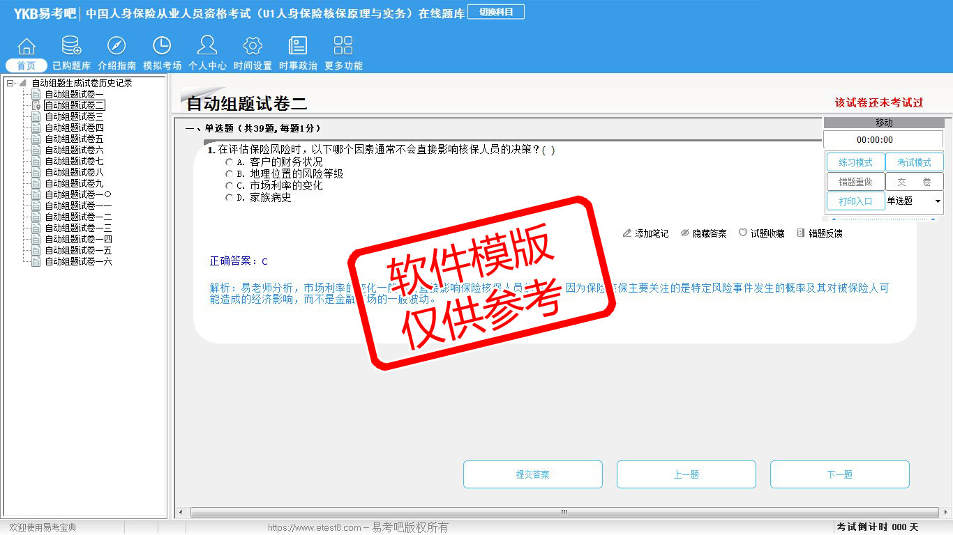 2026年中国人身保险从业人员资格考试(U1人身保险核保原理与实务)易考宝典软件(手机/网页版)是《易考宝典》考试系列软件之一,是专门为参加“中国人身保险职业资格考试”的朋友量身定做的自我测试系统,是个人、培训学校进行考试前训练、备考冲刺的提分技巧考试平台,题型丰富,图文并茂,内容全面,题库设计符合考试新大纲,海量试题。软件包括了富有价值的模拟考场,有计时打分等功能,就像亲身体会考试一样。