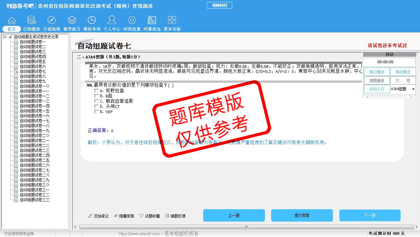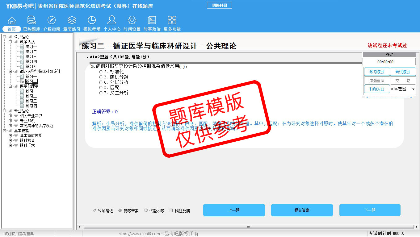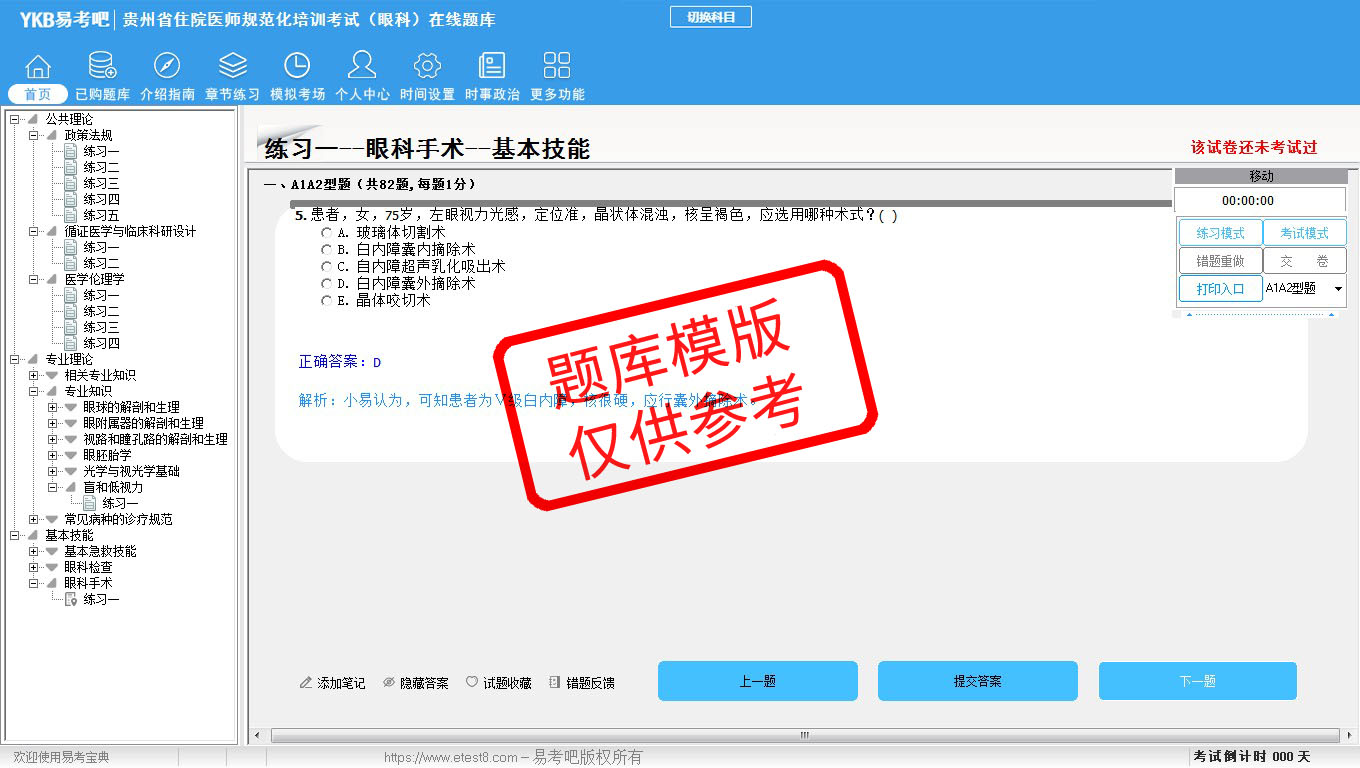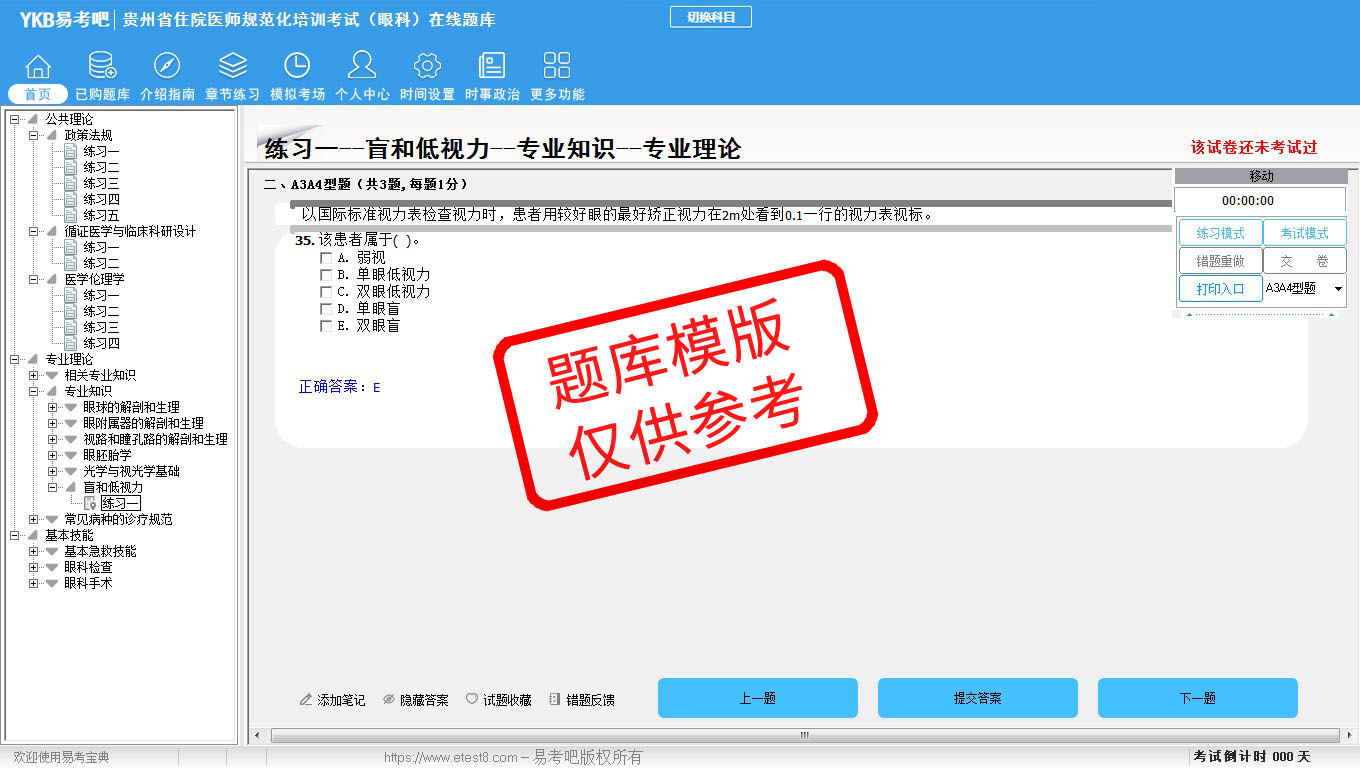 2026年贵州省住院医师规范化培训考试(眼科)易考宝典软件(手机/网页版)是《易考宝典》考试系列软件之一,是专门为参加“住院医师职业资格考试”的朋友量身定做的自我测试系统,是个人、培训学校进行考试前训练、备考冲刺的提分技巧考试平台,题型丰富,图文并茂,内容全面,题库设计符合考试新大纲,海量试题。软件包括了富有价值的模拟考场,有计时打分等功能,就像亲身体会考试一样。