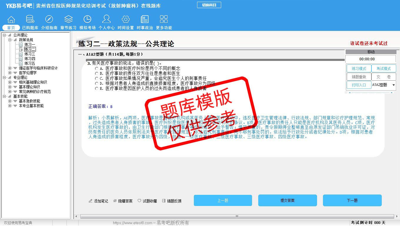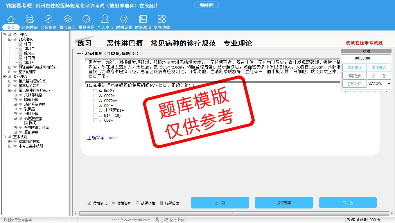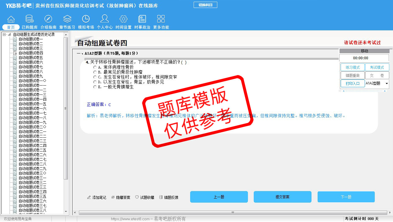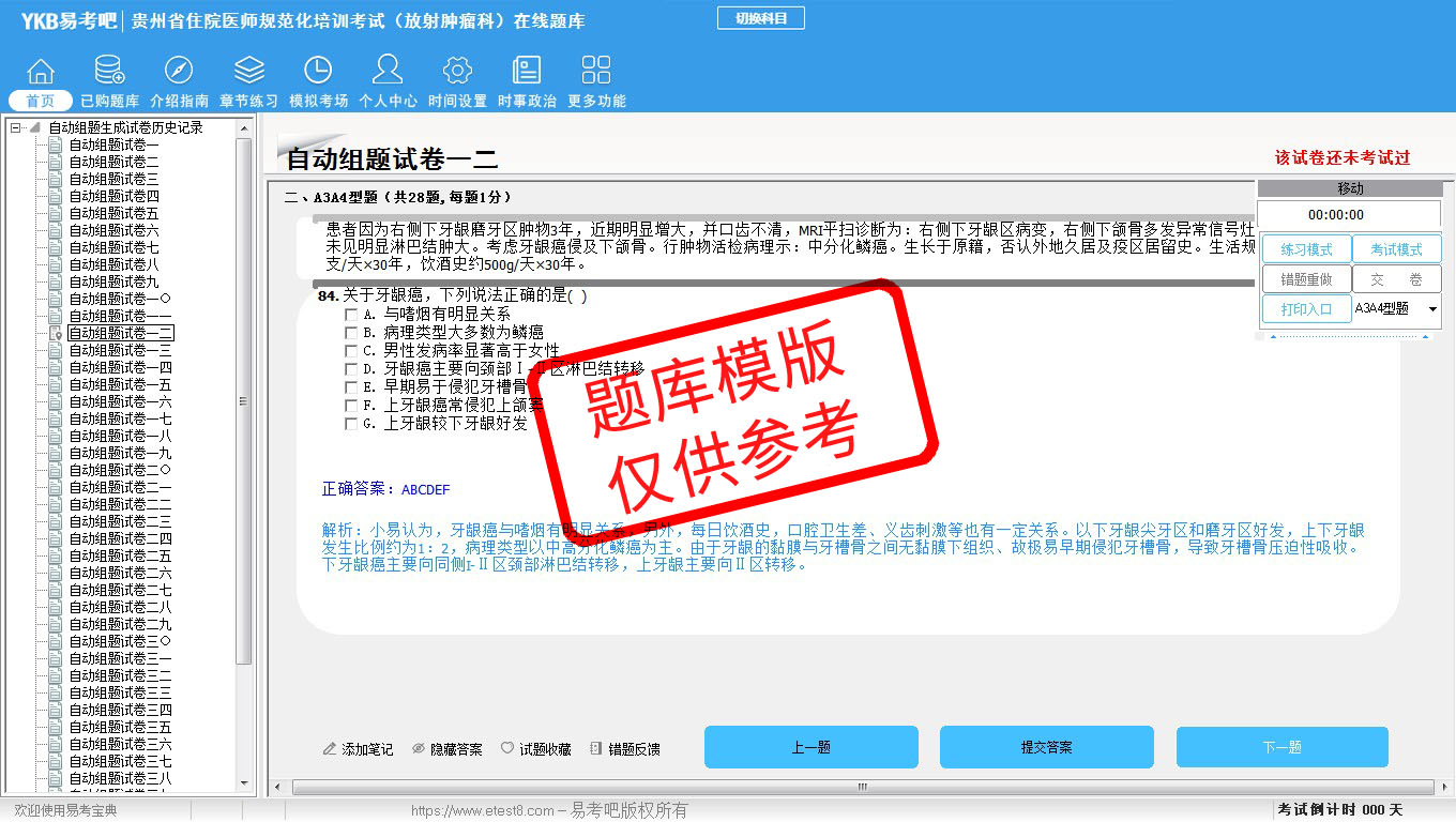 2026年贵州省住院医师规范化培训考试(放射肿瘤科)易考宝典软件(手机/网页版)是《易考宝典》考试系列软件之一,是专门为参加“住院医师职业资格考试”的朋友量身定做的自我测试系统,是个人、培训学校进行考试前训练、备考冲刺的提分技巧考试平台,题型丰富,图文并茂,内容全面,题库设计符合考试新大纲,海量试题。软件包括了富有价值的模拟考场,有计时打分等功能,就像亲身体会考试一样。