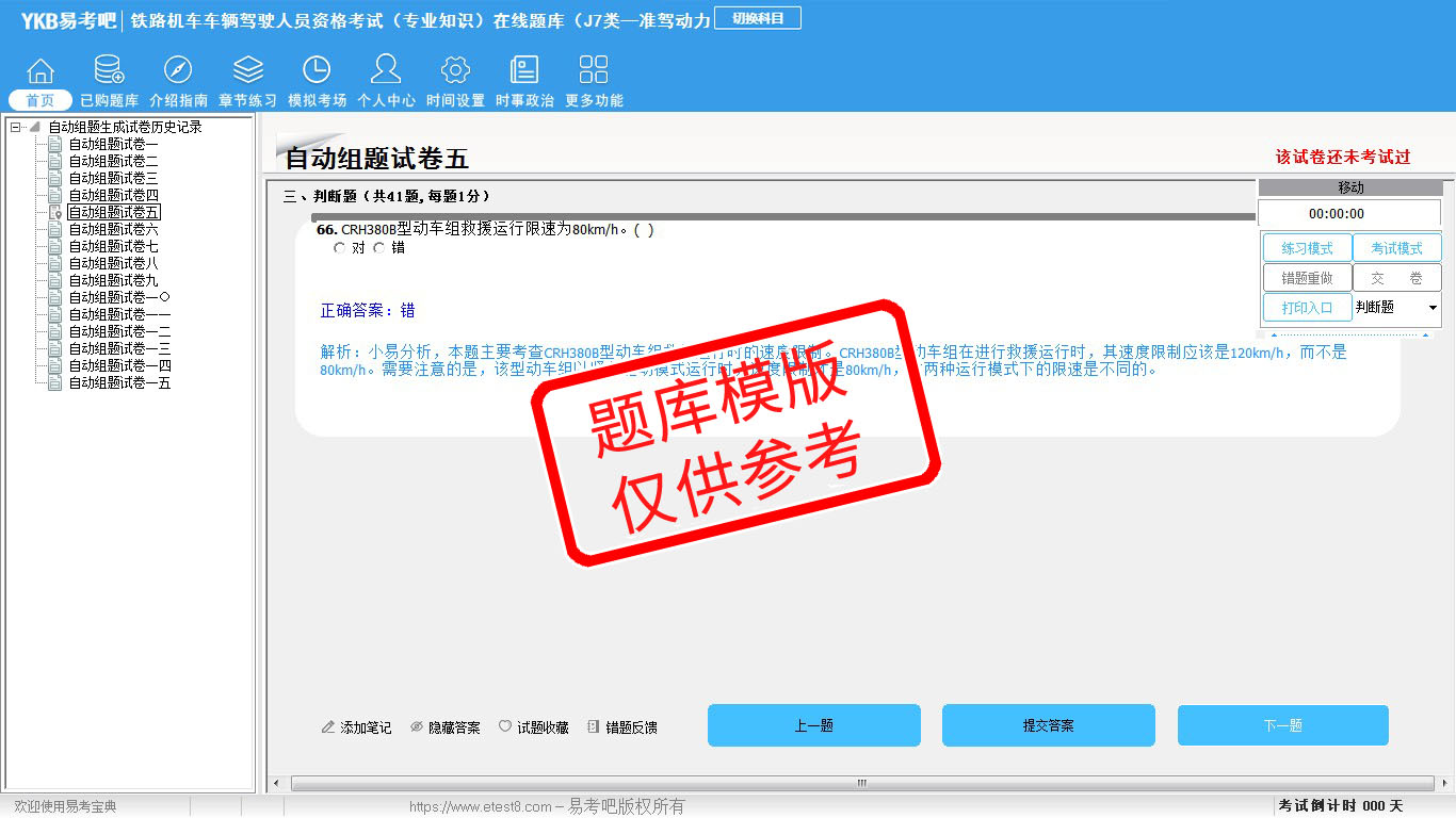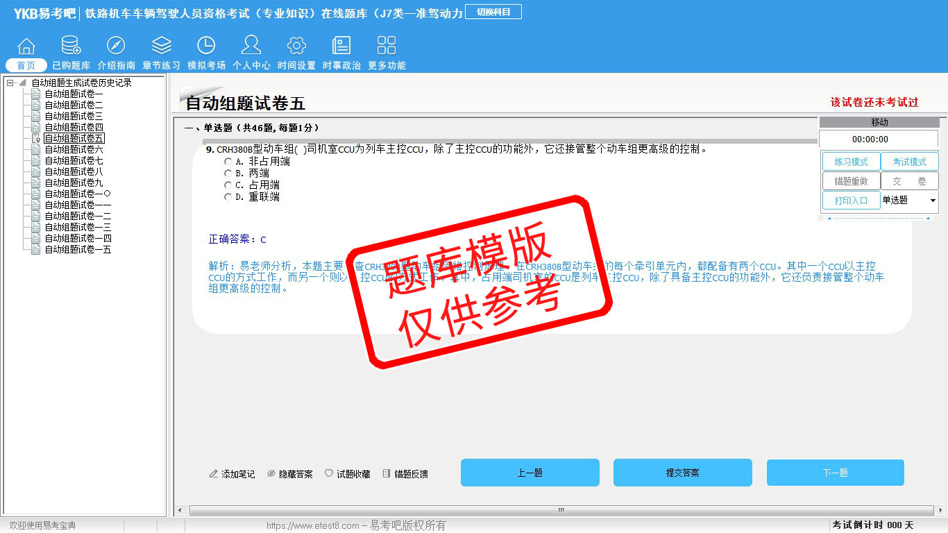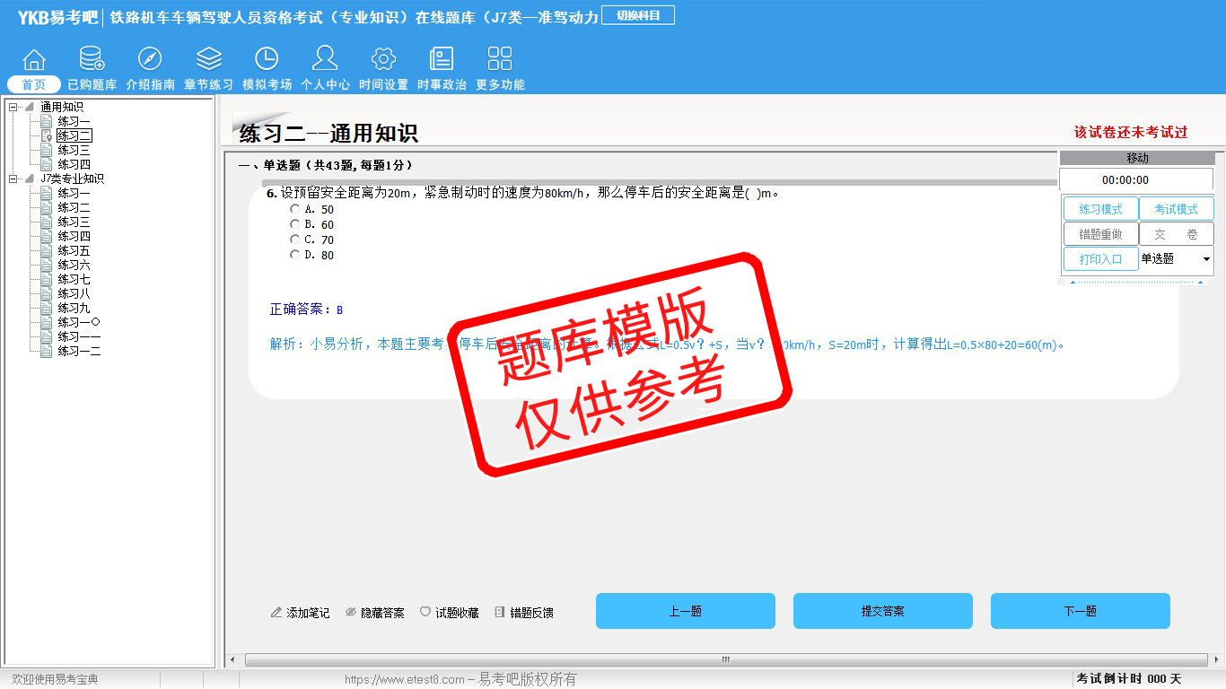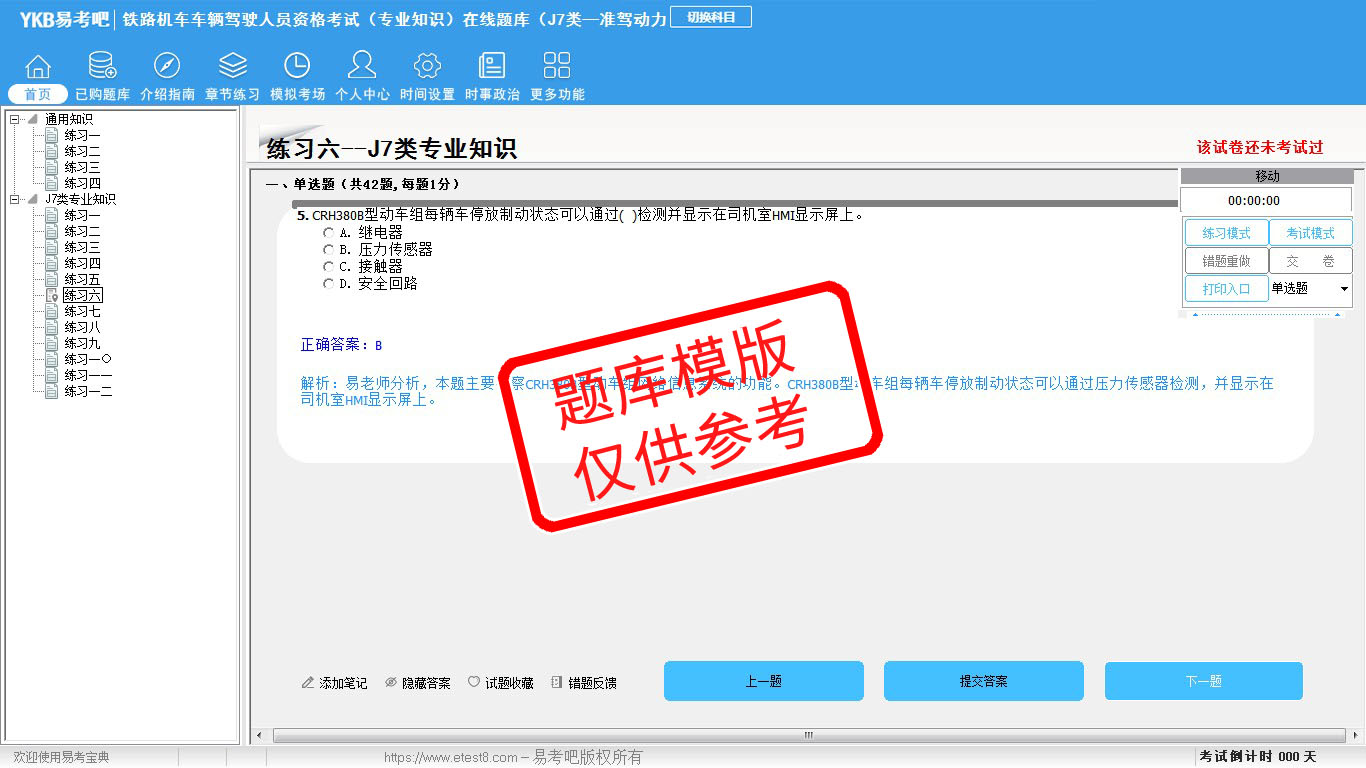 2026年铁路机车车辆驾驶人员资格考试(专业知识)易考宝典软件(J7类—准驾动力分散型电力动车组)(手机/网页版)是《易考宝典》考试系列软件之一,是专门为参加“驾驶员职业资格考试”的朋友量身定做的自我测试系统,是个人、培训学校进行考试前训练、备考冲刺的提分技巧考试平台,题型丰富,图文并茂,内容全面,题库设计符合考试新大纲,海量试题。软件包括了富有价值的模拟考场,有计时打分等功能,就像亲身体会考试一样。