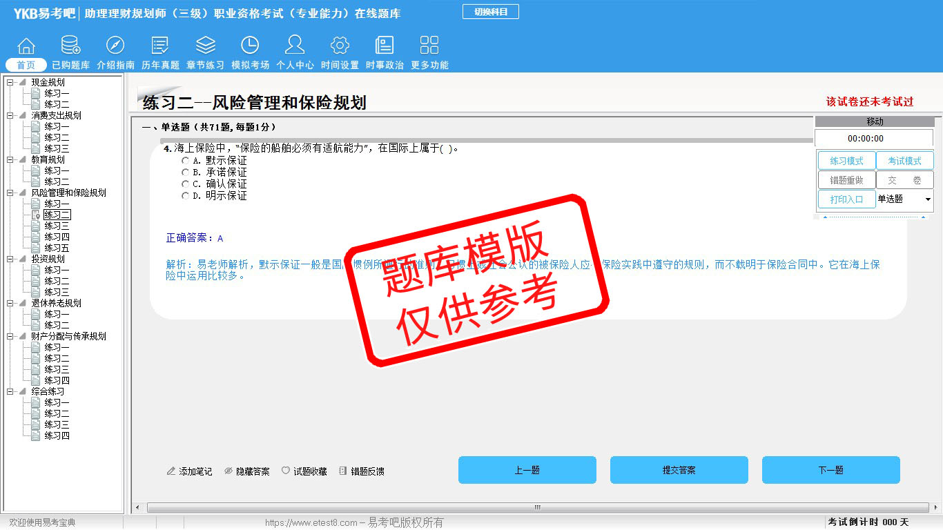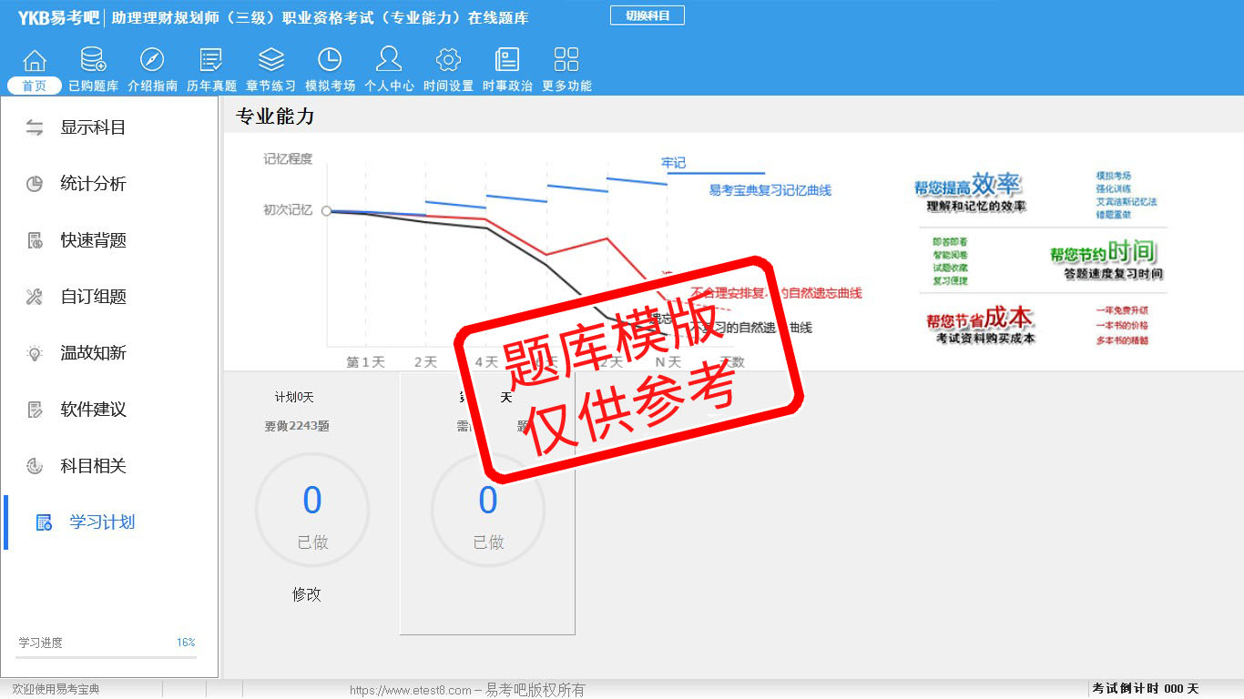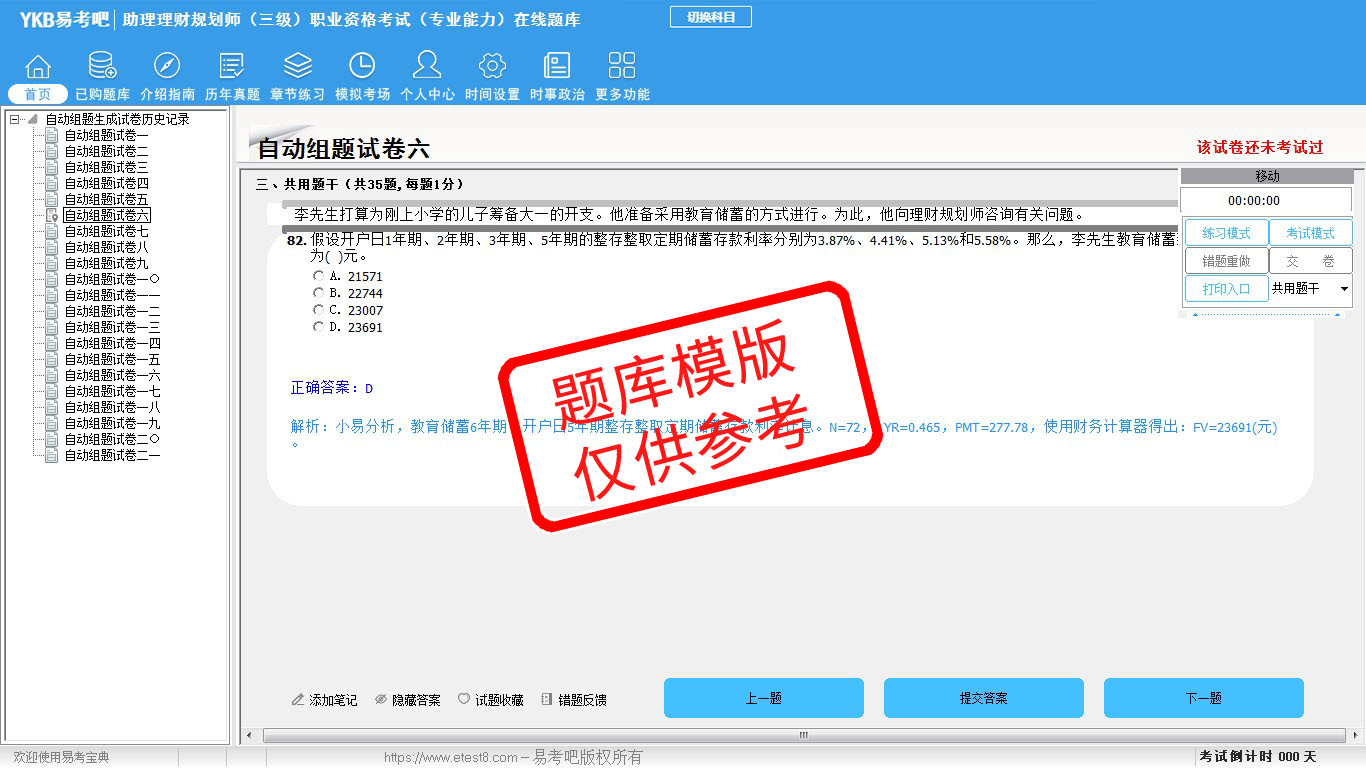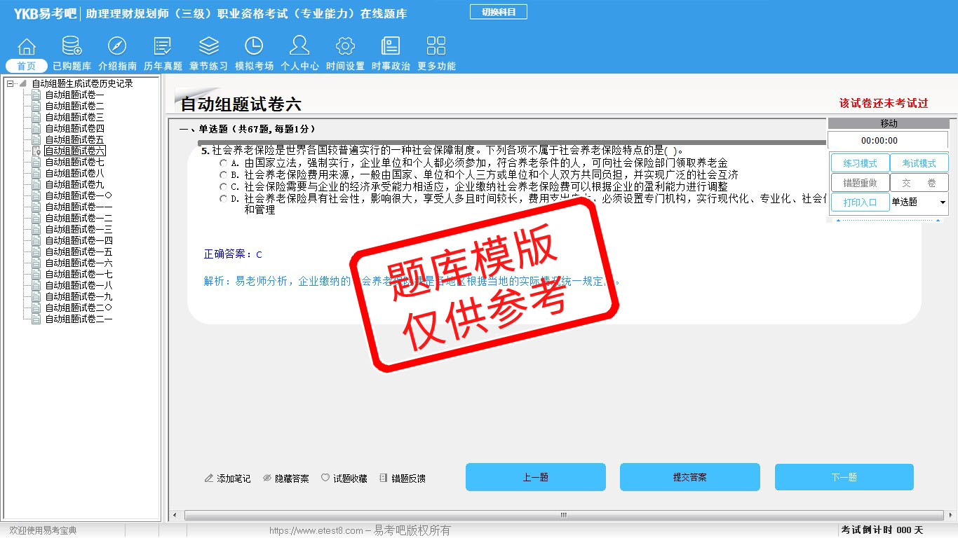 2026年助理理财规划师(三级)职业资格考试(专业能力)易考宝典软件(手机/网页版)是《易考宝典》考试系列软件之一,是专门为参加“理财规划师职业资格考试”的朋友量身定做的自我测试系统,是个人、培训学校进行考试前训练、备考冲刺的提分技巧考试平台,题型丰富,图文并茂,内容全面,题库设计符合考试新大纲,海量试题。软件包括了富有价值的模拟考场,有计时打分等功能,就像亲身体会考试一样。