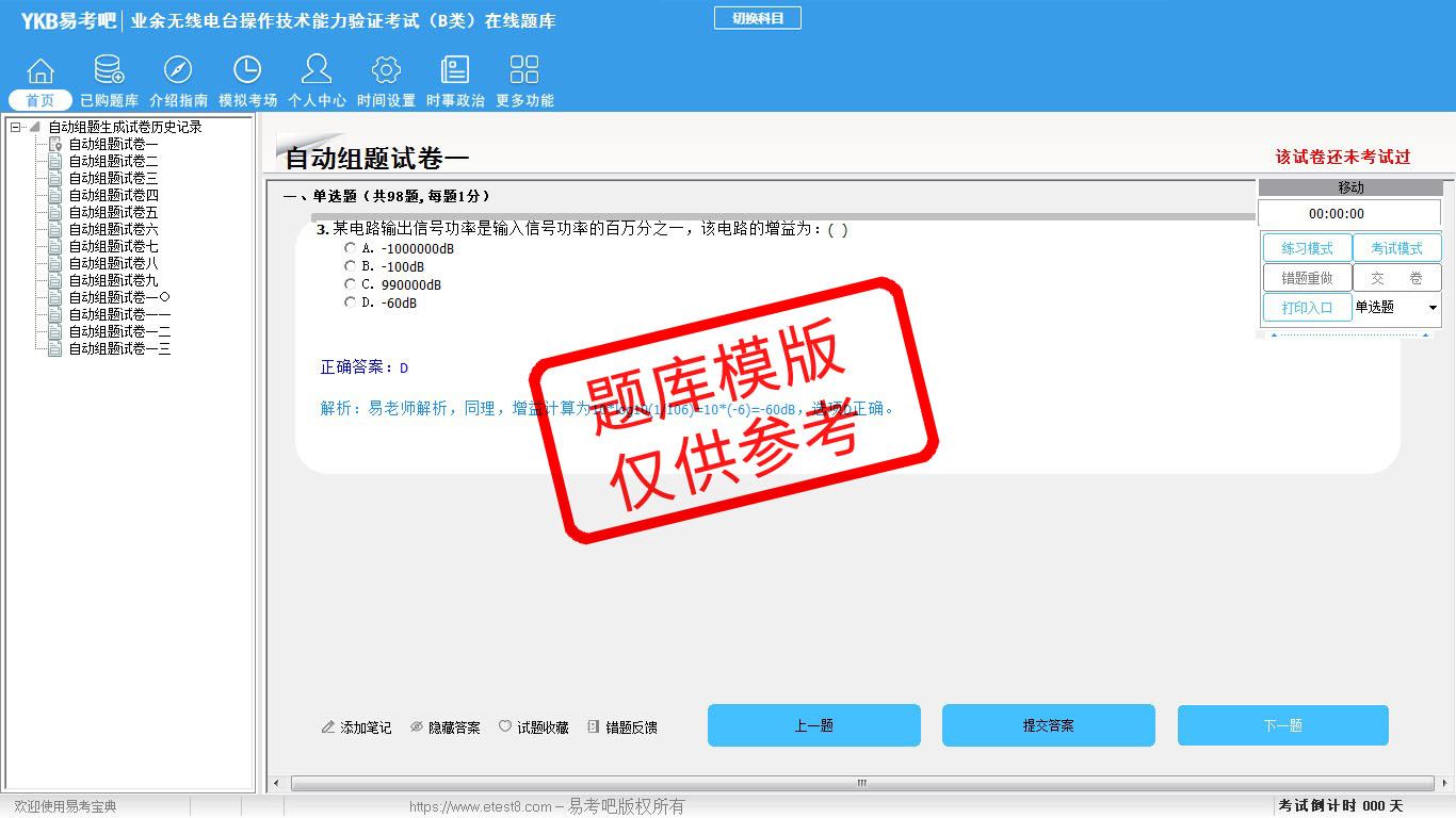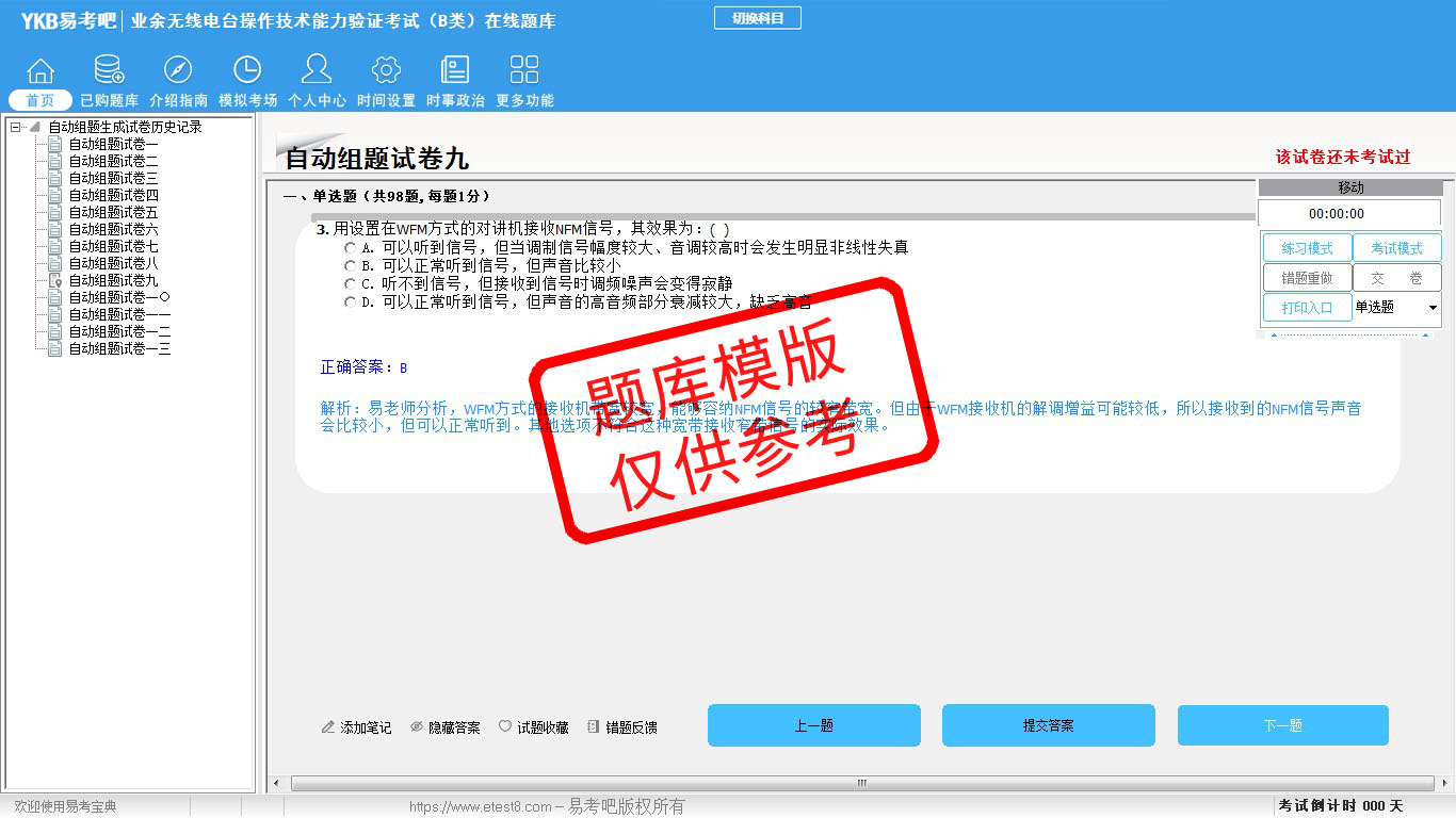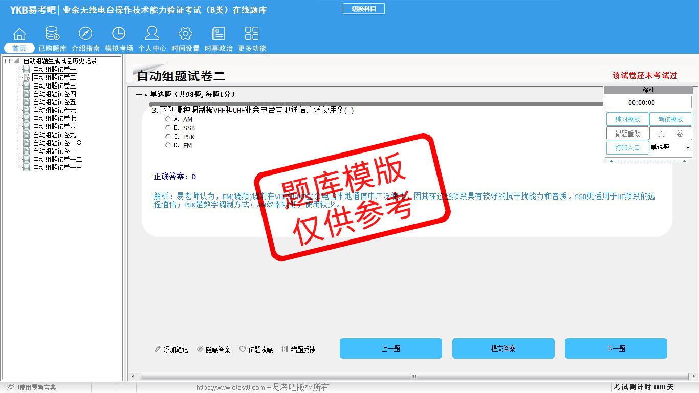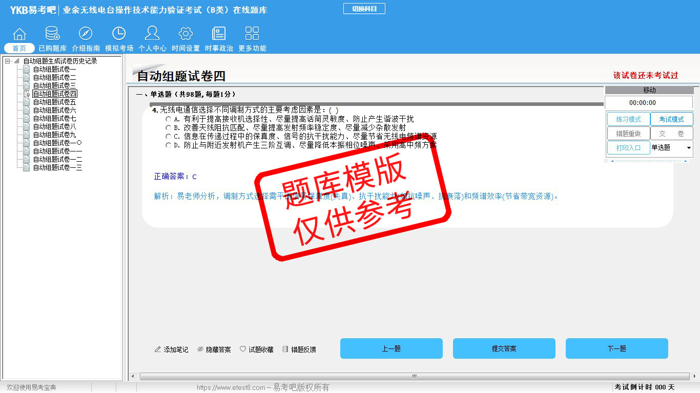 2026年业余无线电台操作技术能力验证考试(B类)易考宝典软件(手机/网页版)是《易考宝典》考试系列软件之一,是专门为参加“通信职业资格考试”的朋友量身定做的自我测试系统,是个人、培训学校进行考试前训练、备考冲刺的提分技巧考试平台,题型丰富,图文并茂,内容全面,题库设计符合考试新大纲,海量试题。软件包括了富有价值的模拟考场,有计时打分等功能,就像亲身体会考试一样。
