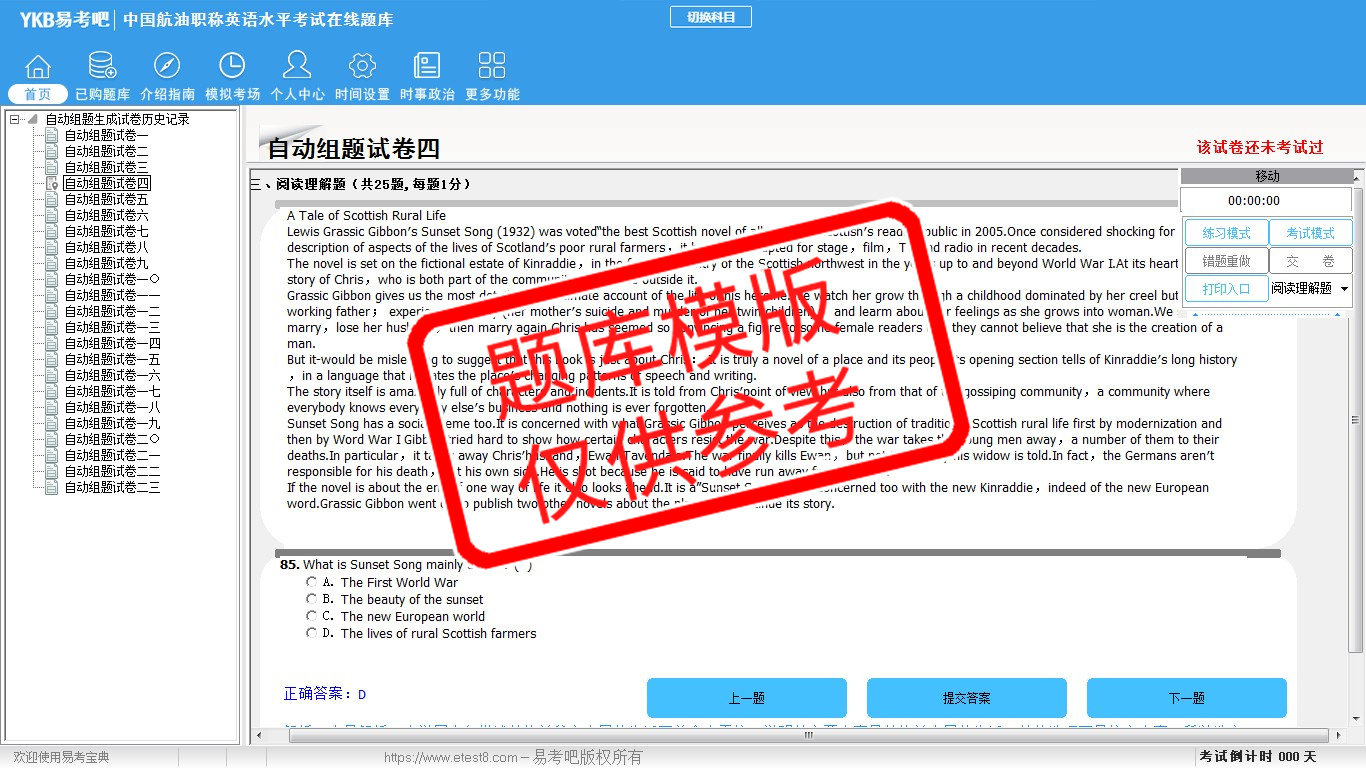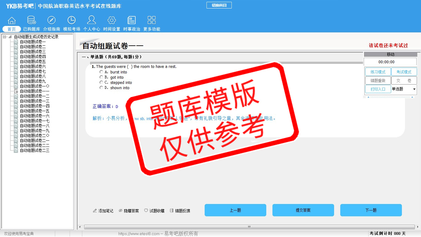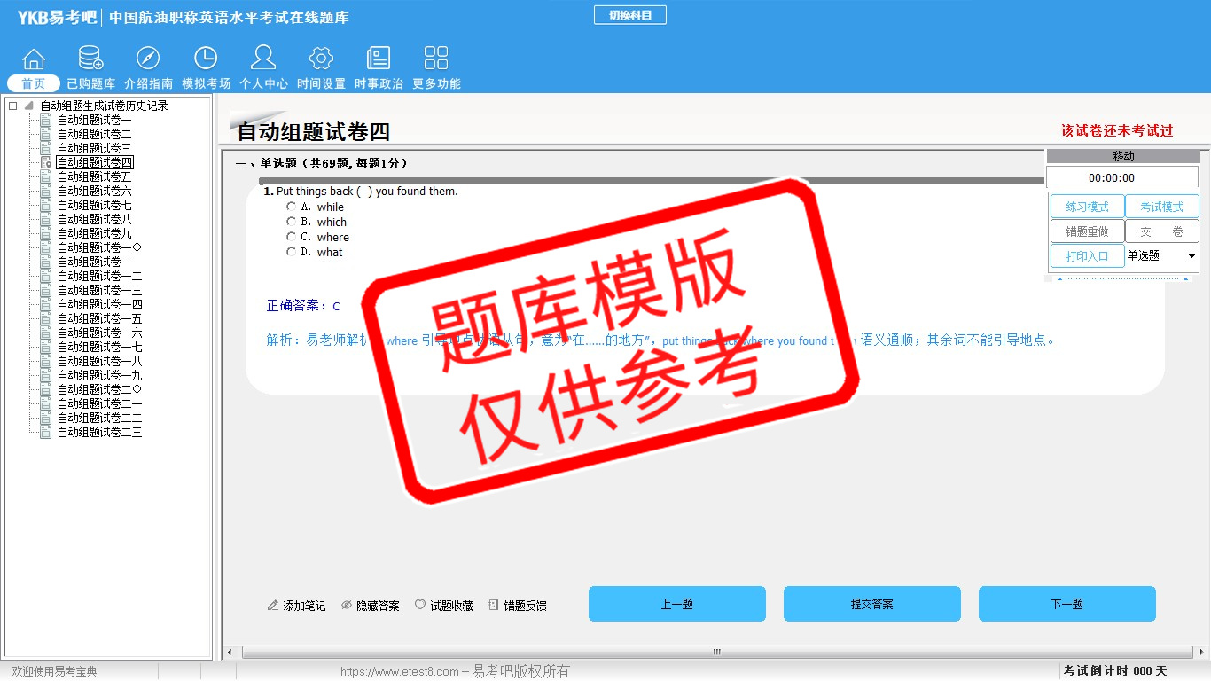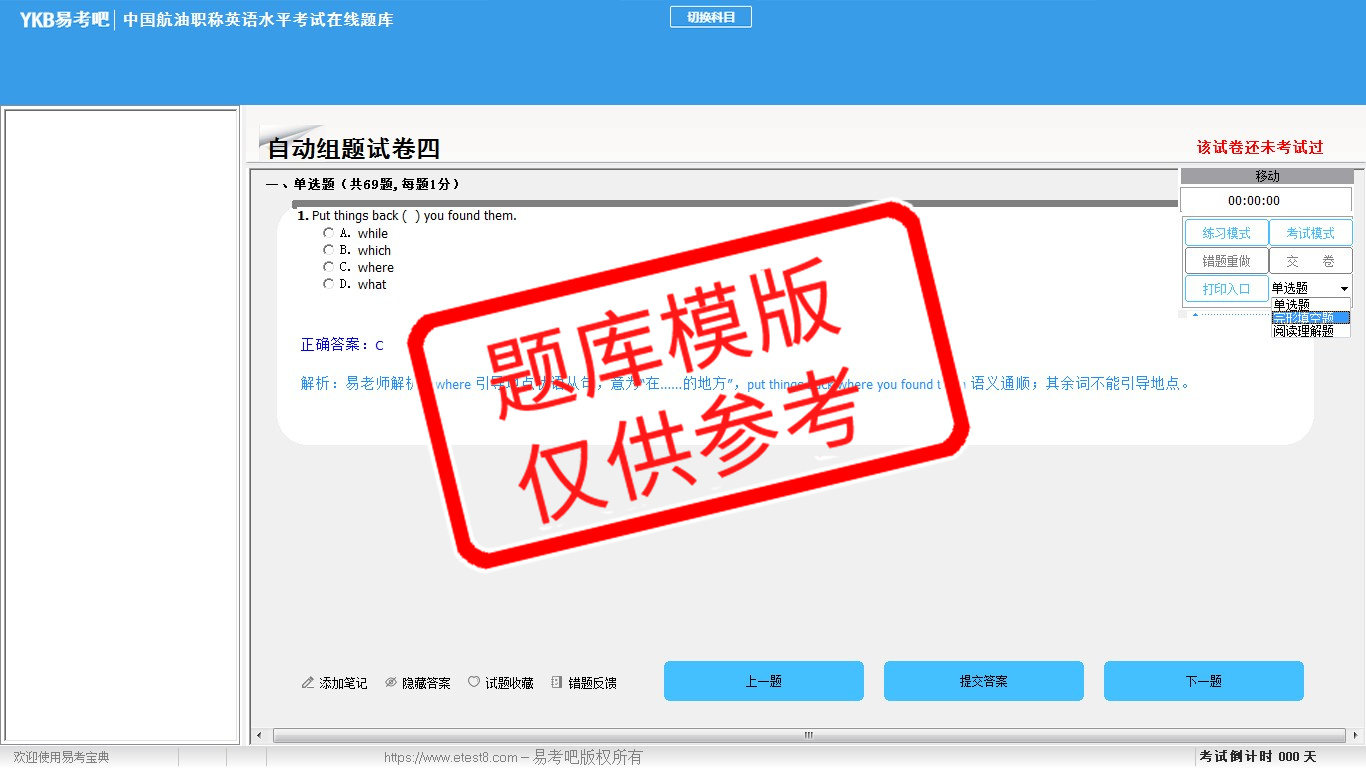 2026年中国航油职称英语水平考试易考宝典软件(手机/网页版)是《易考宝典》考试系列软件之一,是专门为参加“职称英语职业资格考试”的朋友量身定做的自我测试系统,是个人、培训学校进行考试前训练、备考冲刺的提分技巧考试平台,题型丰富,图文并茂,内容全面,题库设计符合考试新大纲,海量试题。软件包括了富有价值的模拟考场,有计时打分等功能,就像亲身体会考试一样。