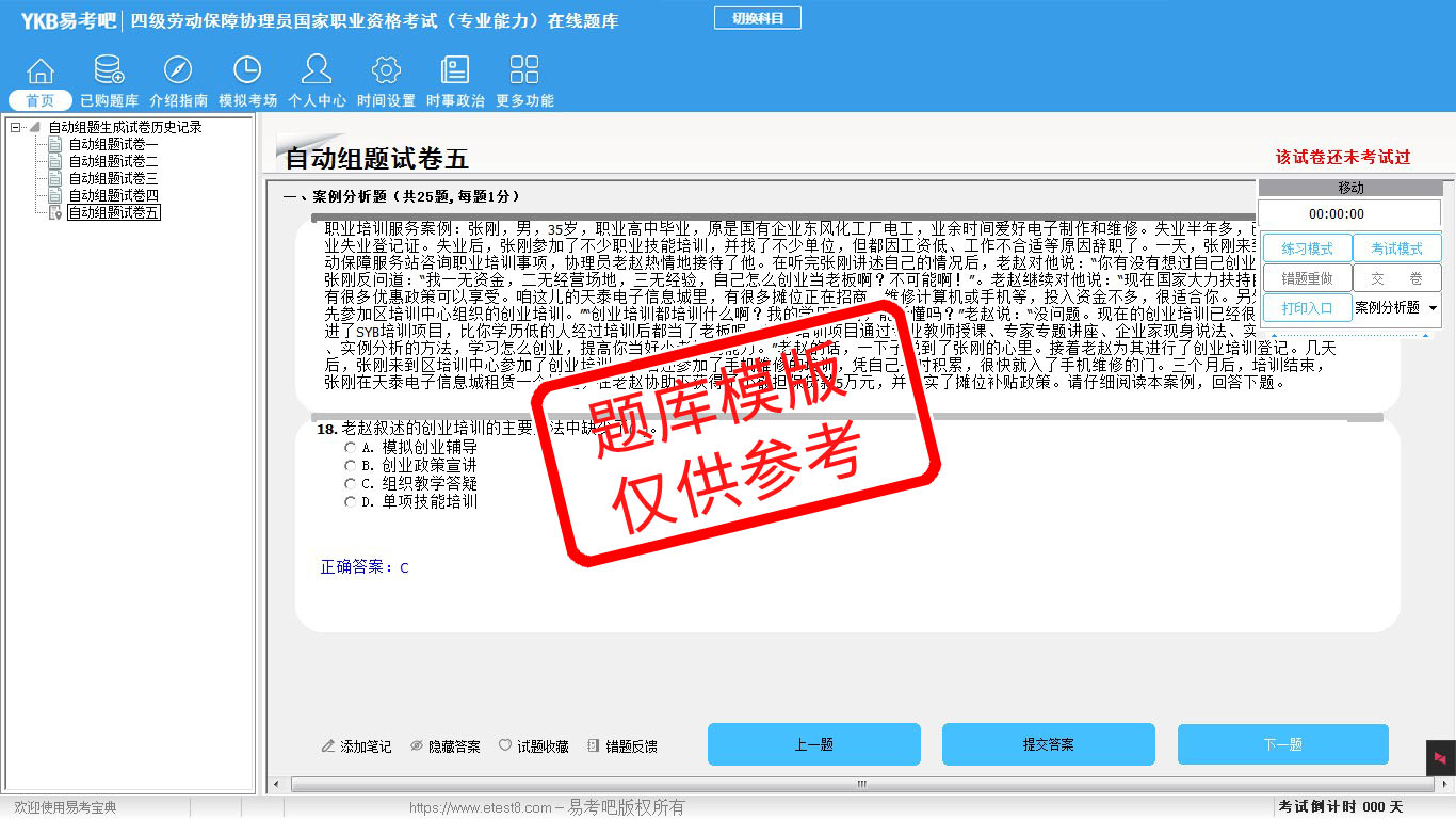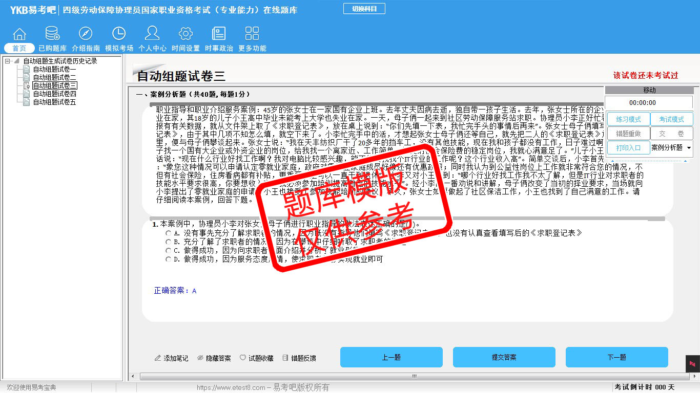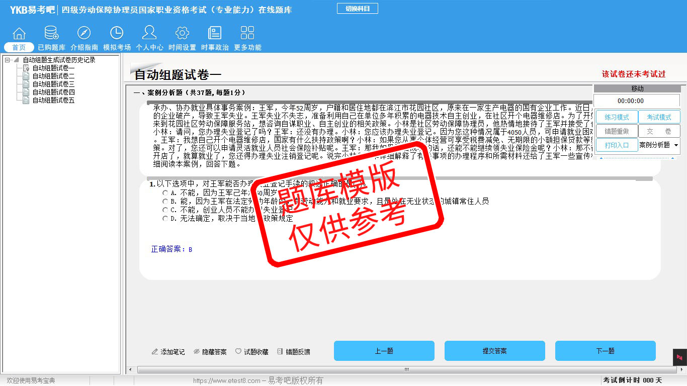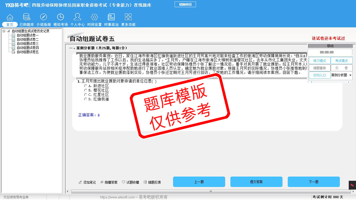 2026年四级劳动保障协理员国家职业资格考试(专业能力)易考宝典软件(手机/网页版)是《易考宝典》考试系列软件之一,是专门为参加“社会工作者职业资格考试”的朋友量身定做的自我测试系统,是个人、培训学校进行考试前训练、备考冲刺的提分技巧考试平台,题型丰富,图文并茂,内容全面,题库设计符合考试新大纲,海量试题。软件包括了富有价值的模拟考场,有计时打分等功能,就像亲身体会考试一样。