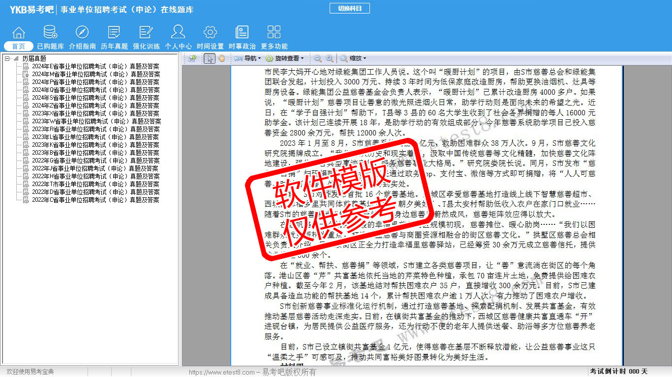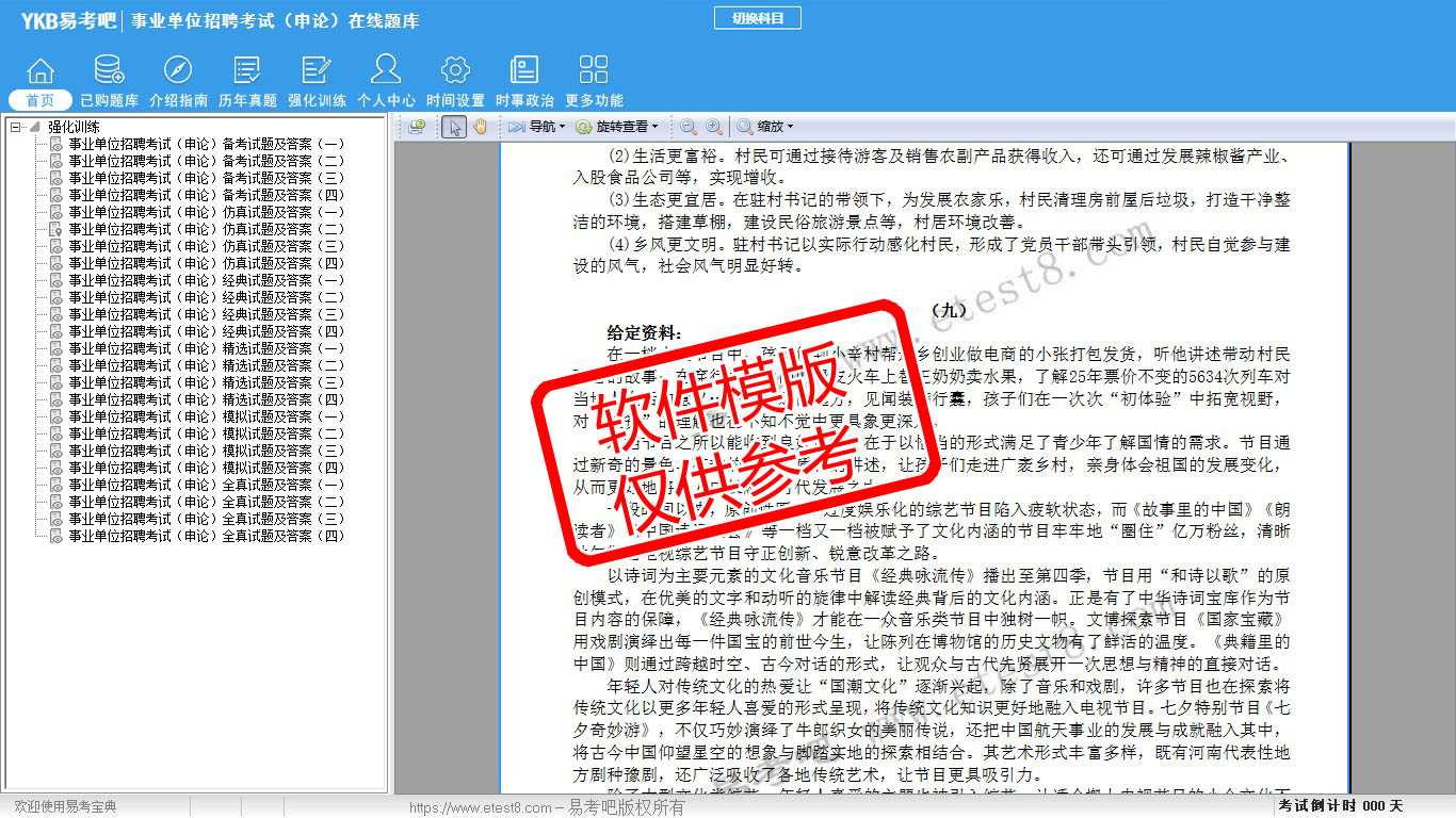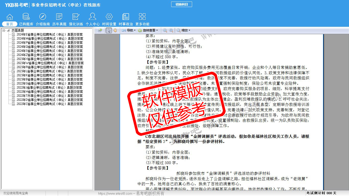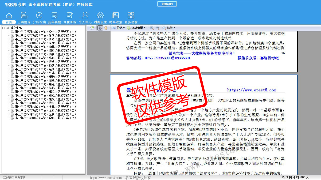 2026年事业单位招聘考试(公共基础知识+行政职业能力测验+申论)易考宝典软件(手机/网页版)是《易考宝典》考试系列软件之一,是专门为参加“事业单位职业资格考试”的朋友量身定做的自我测试系统,是个人、培训学校进行考试前训练、备考冲刺的提分技巧考试平台,题型丰富,图文并茂,内容全面,题库设计符合考试新大纲,海量试题。软件包括了富有价值的模拟考场,有计时打分等功能,就像亲身体会考试一样。