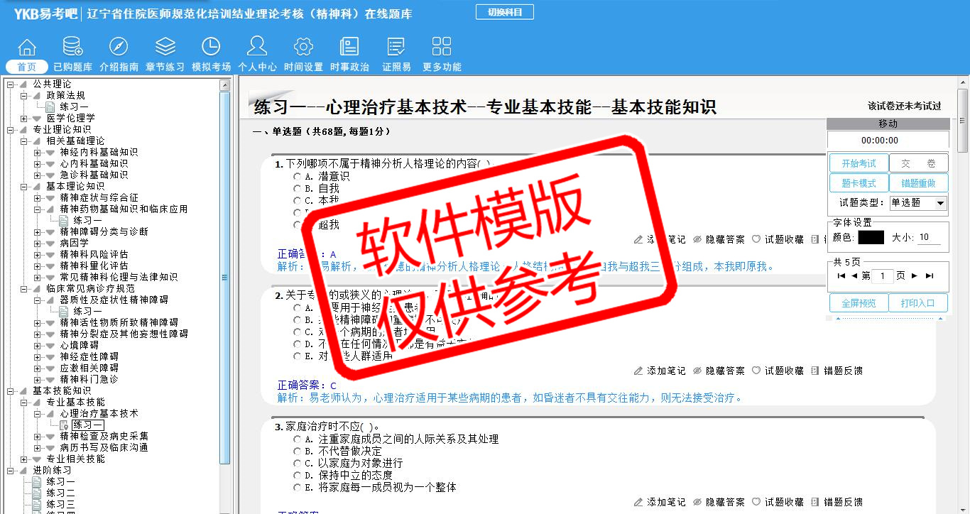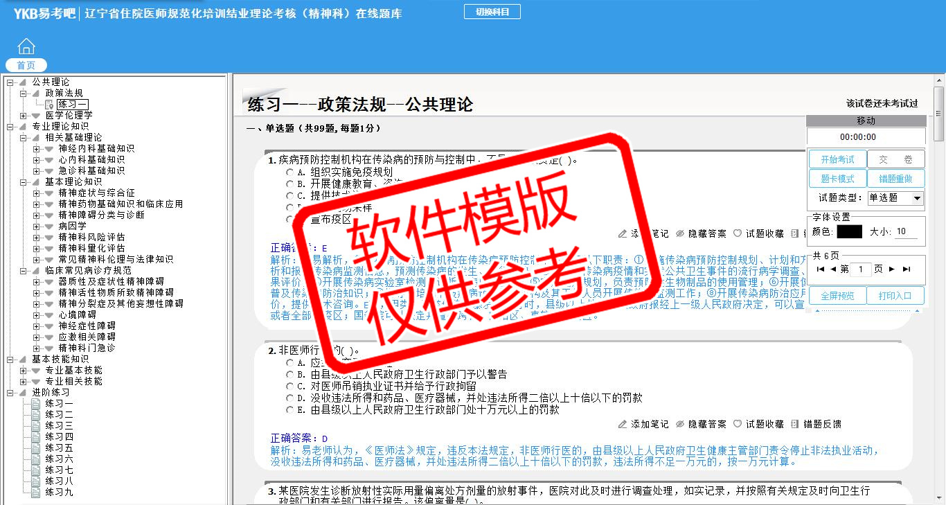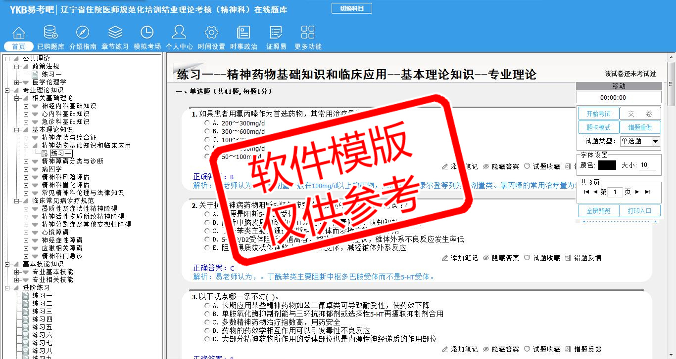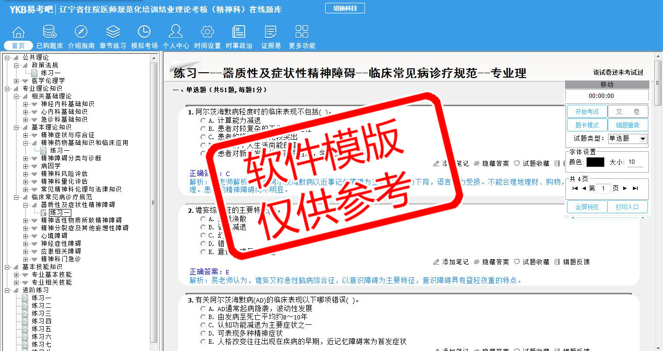 2026年辽宁省住院医师规范化培训结业理论考核(精神科)易考宝典软件(手机/网页版)是《易考宝典》考试系列软件之一,是专门为参加“住院医师职业资格考试”的朋友量身定做的自我测试系统,是个人、培训学校进行考试前训练、备考冲刺的提分技巧考试平台,题型丰富,图文并茂,内容全面,题库设计符合考试新大纲,海量试题。软件包括了富有价值的模拟考场,有计时打分等功能,就像亲身体会考试一样。