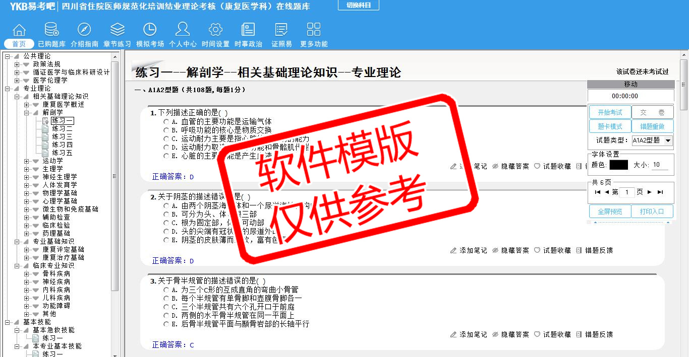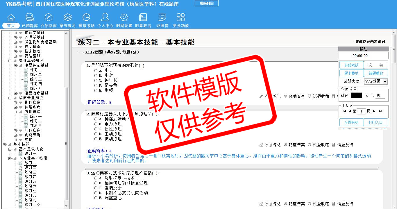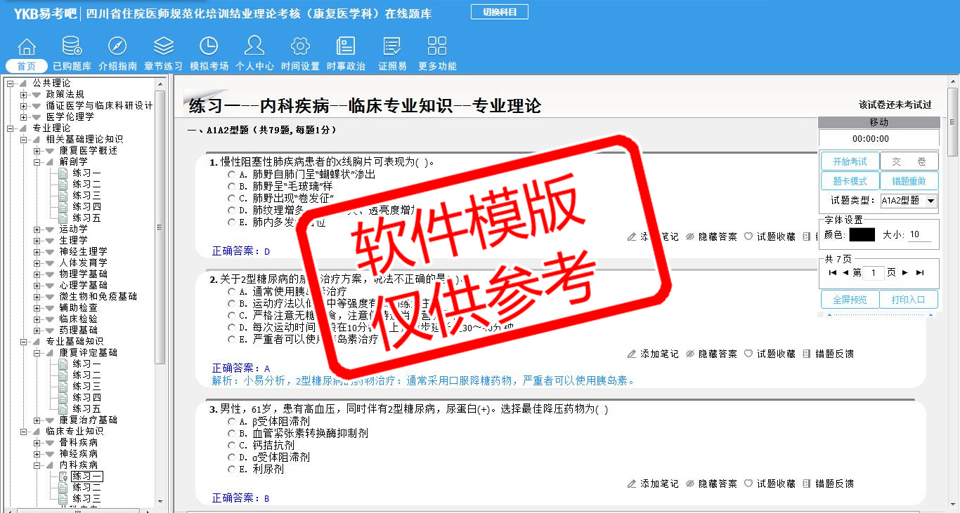 2026年四川省住院医师规范化培训结业理论考核(康复医学科)易考宝典软件(手机/网页版)是《易考宝典》考试系列软件之一,是专门为参加“住院医师职业资格考试”的朋友量身定做的自我测试系统,是个人、培训学校进行考试前训练、备考冲刺的提分技巧考试平台,题型丰富,图文并茂,内容全面,题库设计符合考试新大纲,海量试题。软件包括了富有价值的模拟考场,有计时打分等功能,就像亲身体会考试一样。
