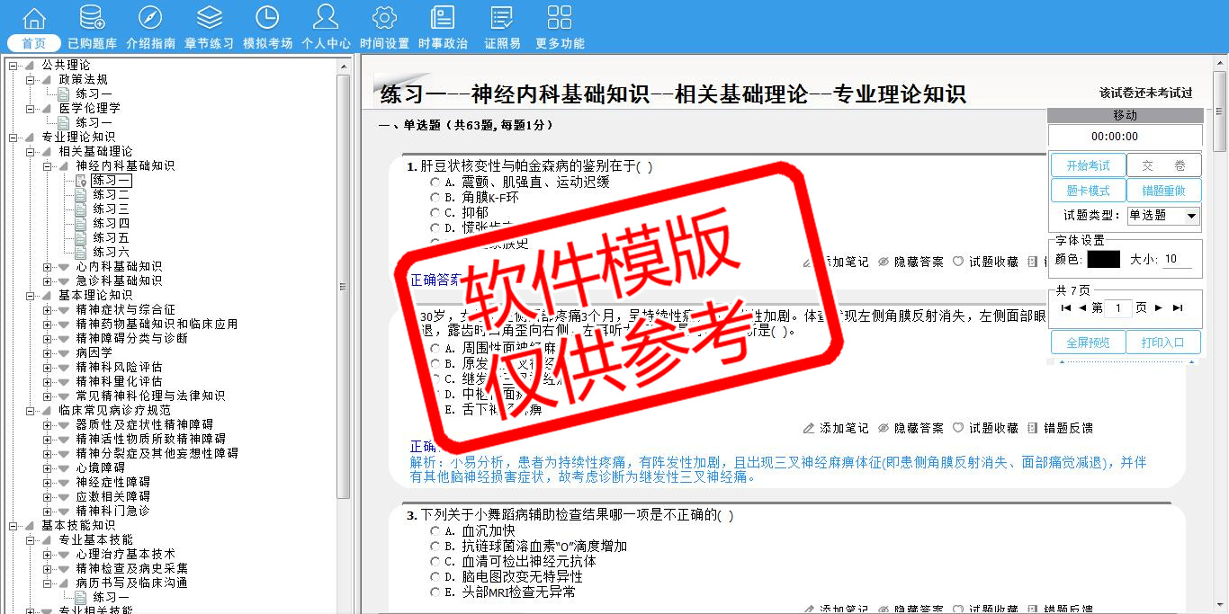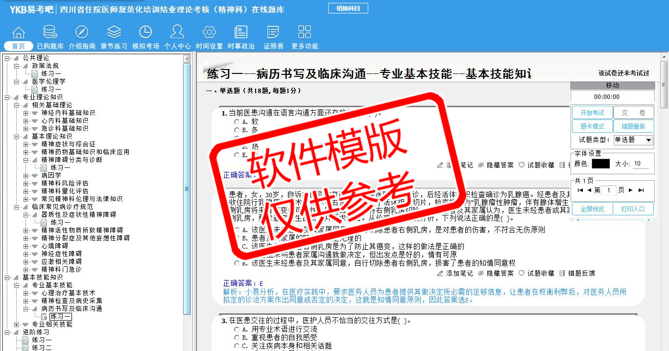 2026年四川省住院医师规范化培训结业理论考核(精神科)易考宝典软件(手机/网页版)是《易考宝典》考试系列软件之一,是专门为参加“住院医师职业资格考试”的朋友量身定做的自我测试系统,是个人、培训学校进行考试前训练、备考冲刺的提分技巧考试平台,题型丰富,图文并茂,内容全面,题库设计符合考试新大纲,海量试题。软件包括了富有价值的模拟考场,有计时打分等功能,就像亲身体会考试一样。