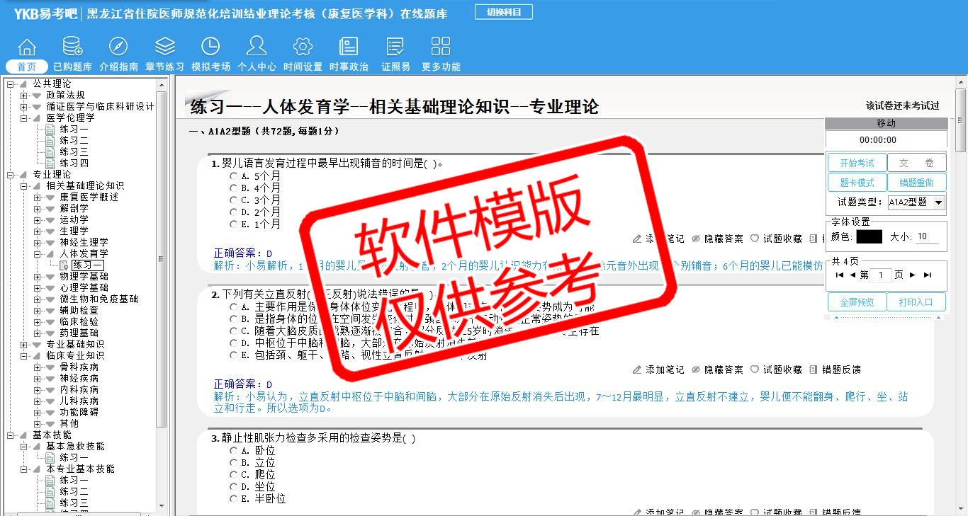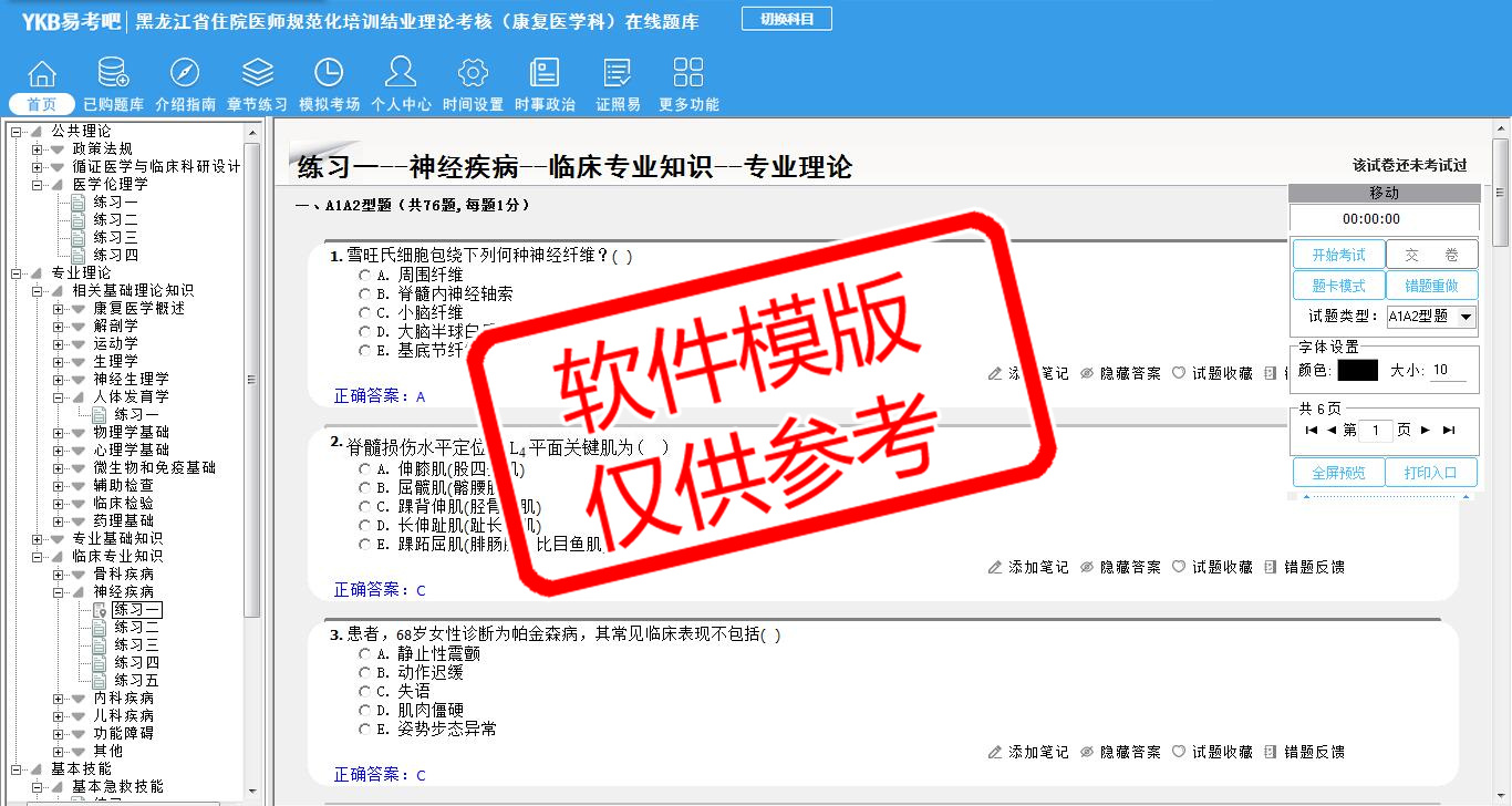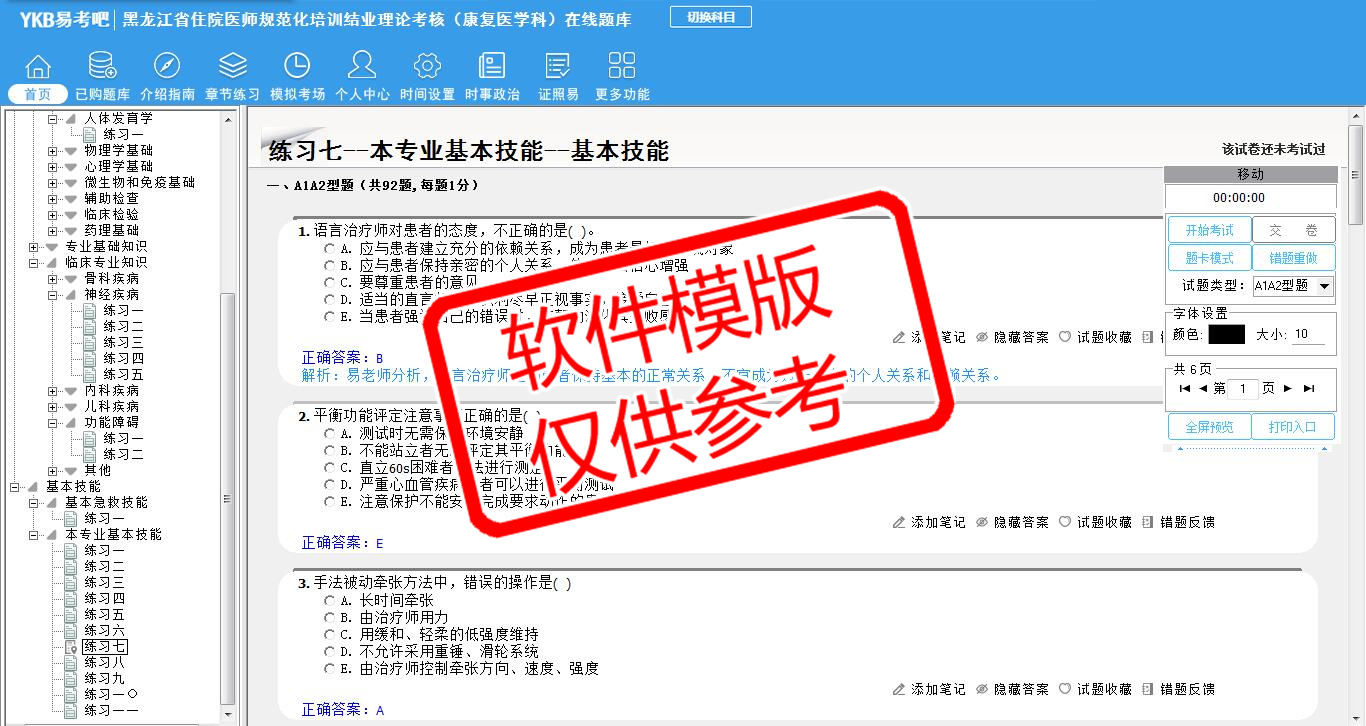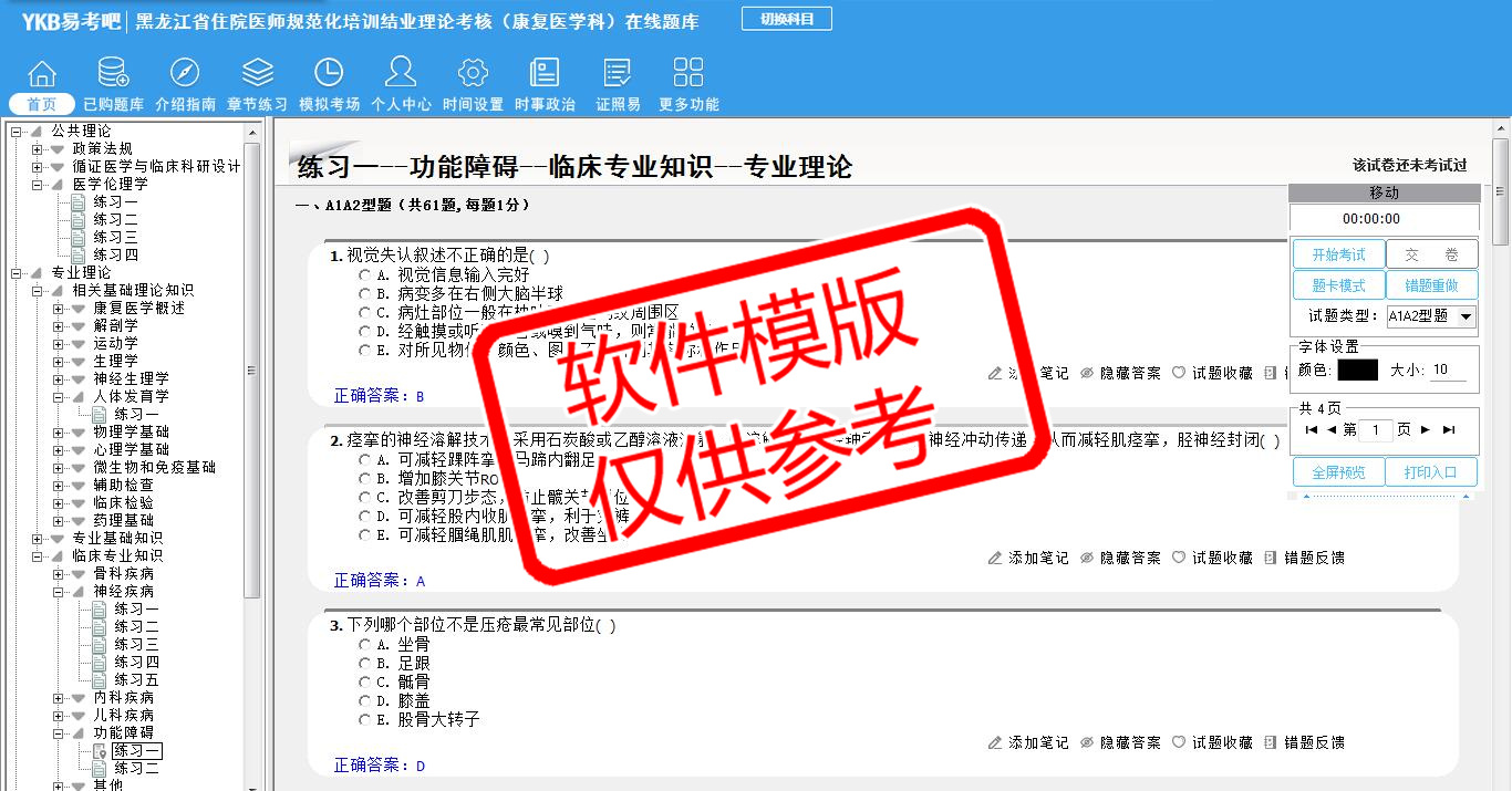 2026年黑龙江省住院医师规范化培训结业理论考核(康复医学科)易考宝典软件(手机/网页版)是《易考宝典》考试系列软件之一,是专门为参加“住院医师职业资格考试”的朋友量身定做的自我测试系统,是个人、培训学校进行考试前训练、备考冲刺的提分技巧考试平台,题型丰富,图文并茂,内容全面,题库设计符合考试新大纲,海量试题。软件包括了富有价值的模拟考场,有计时打分等功能,就像亲身体会考试一样。