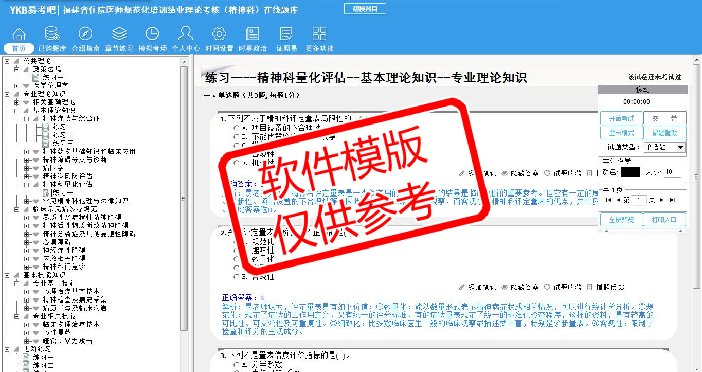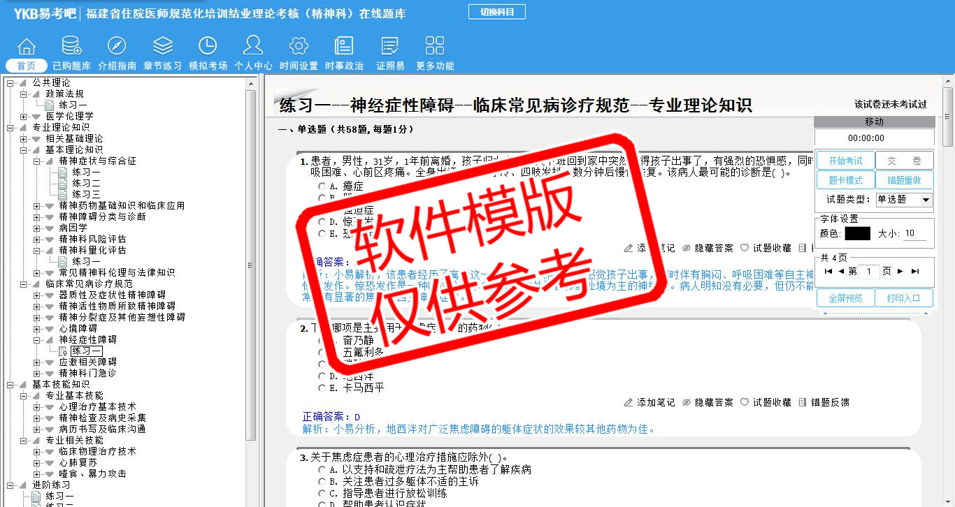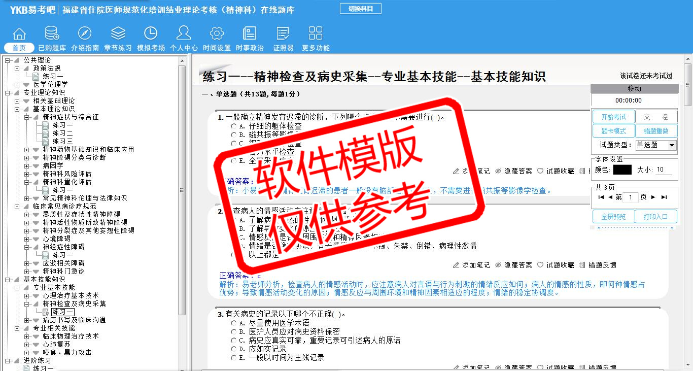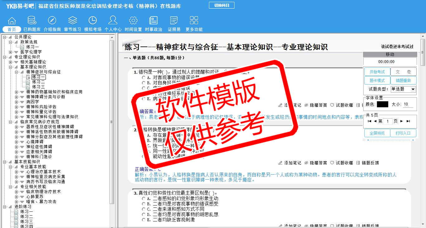 2026年福建省住院医师规范化培训结业理论考核(精神科)易考宝典软件(手机/网页版)是《易考宝典》考试系列软件之一,是专门为参加“住院医师职业资格考试”的朋友量身定做的自我测试系统,是个人、培训学校进行考试前训练、备考冲刺的提分技巧考试平台,题型丰富,图文并茂,内容全面,题库设计符合考试新大纲,海量试题。软件包括了富有价值的模拟考场,有计时打分等功能,就像亲身体会考试一样。
