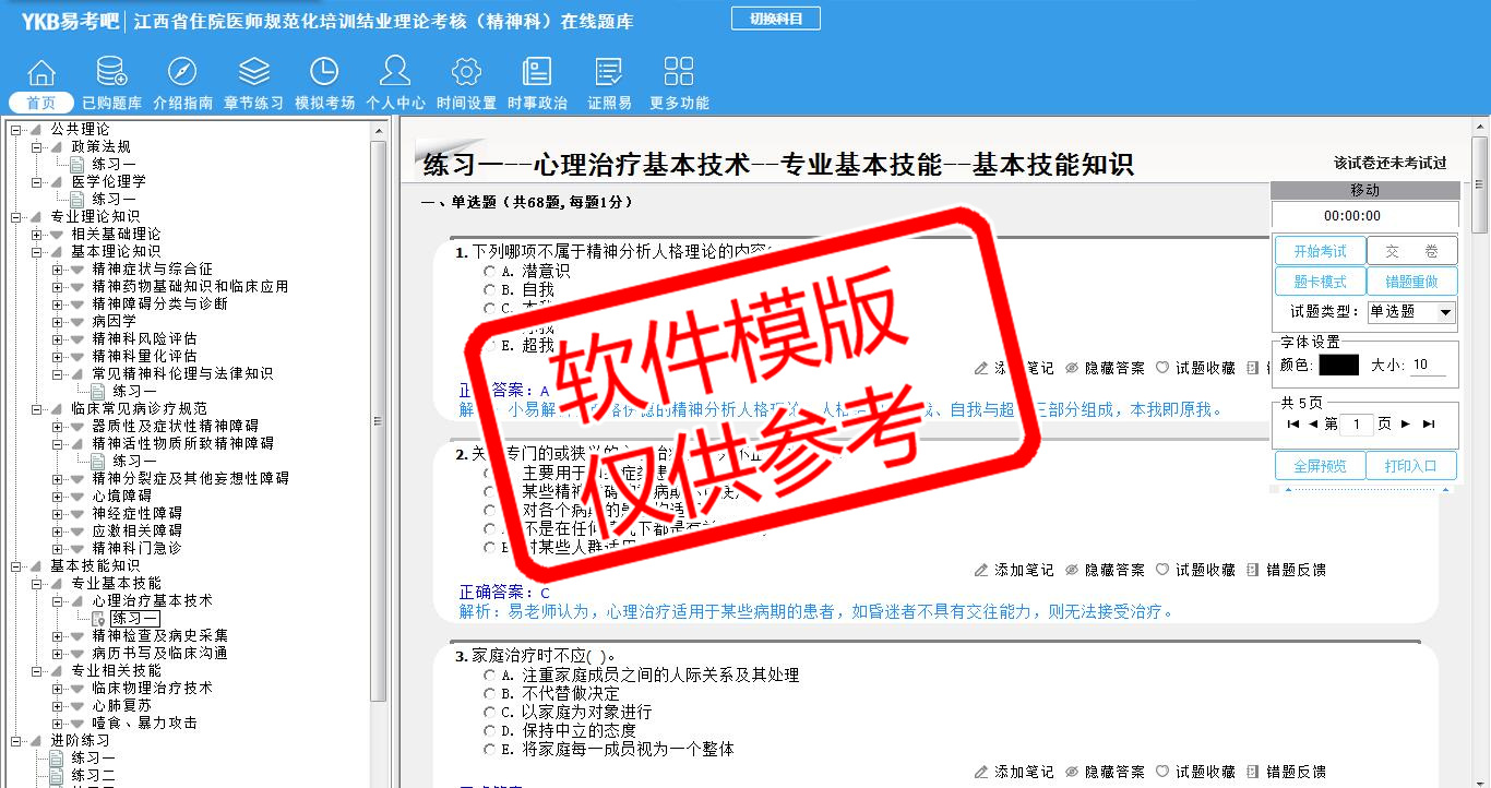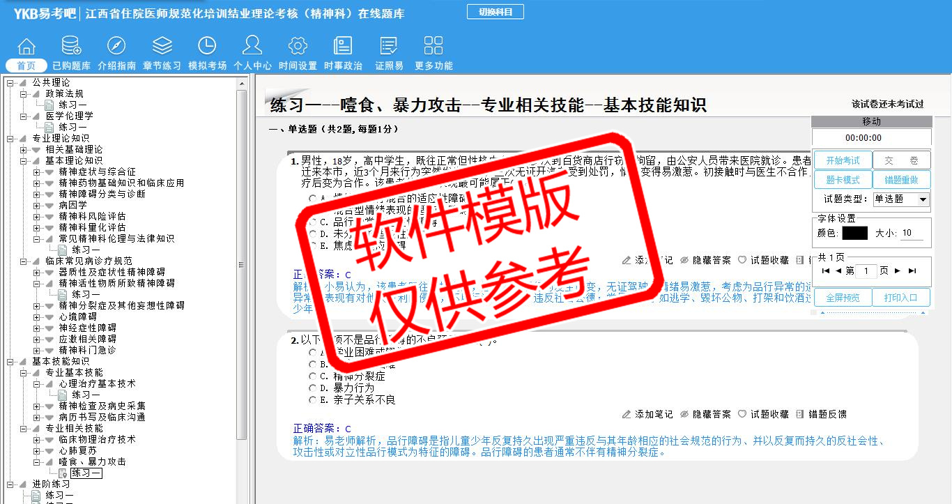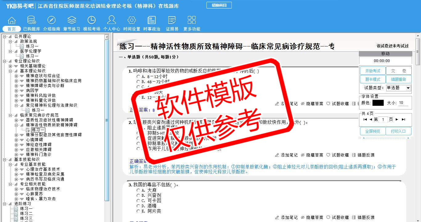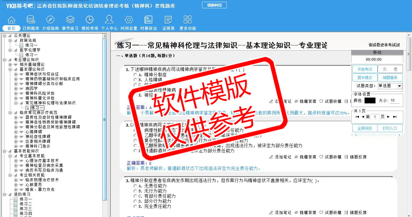 2026年江西省住院医师规范化培训结业理论考核(精神科)易考宝典软件(手机/网页版)是《易考宝典》考试系列软件之一,是专门为参加“住院医师职业资格考试”的朋友量身定做的自我测试系统,是个人、培训学校进行考试前训练、备考冲刺的提分技巧考试平台,题型丰富,图文并茂,内容全面,题库设计符合考试新大纲,海量试题。软件包括了富有价值的模拟考场,有计时打分等功能,就像亲身体会考试一样。
