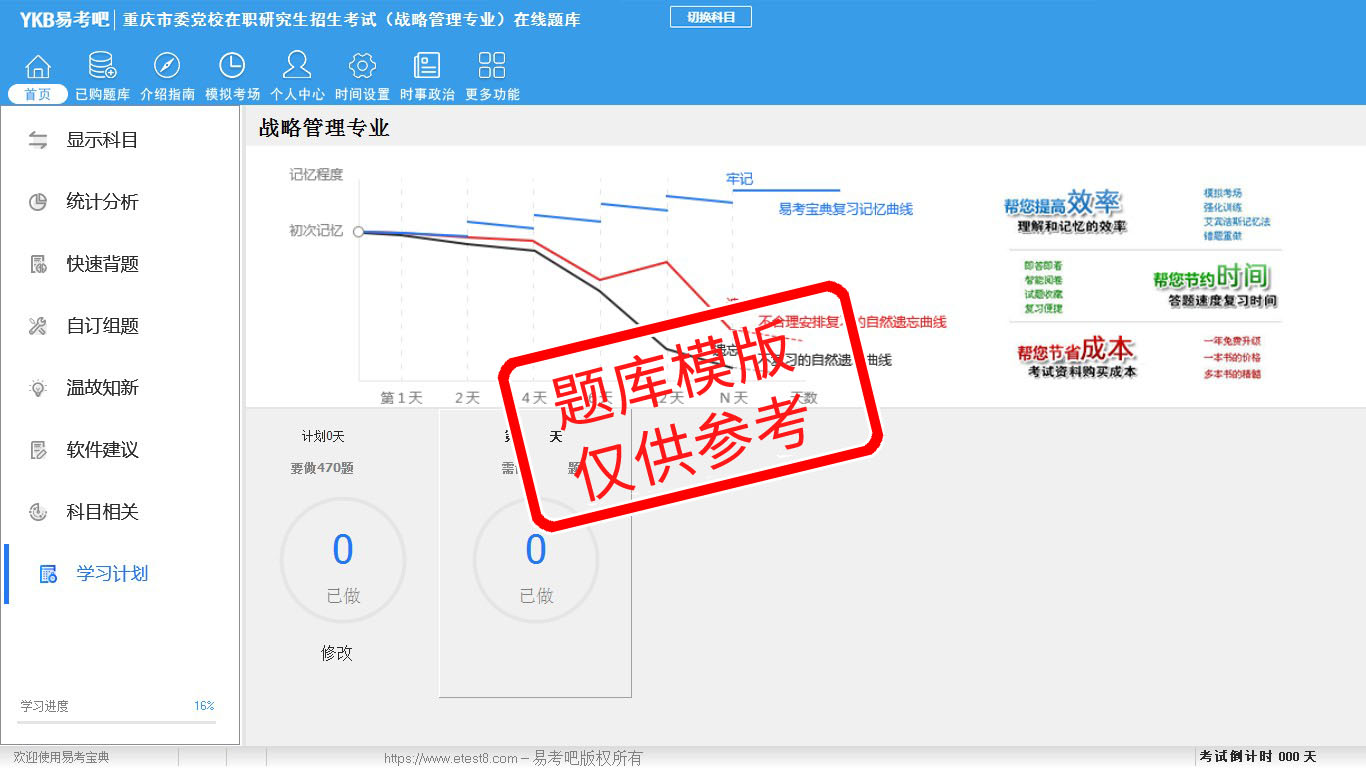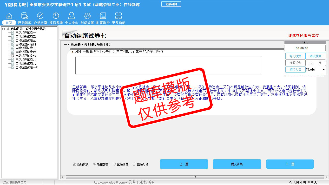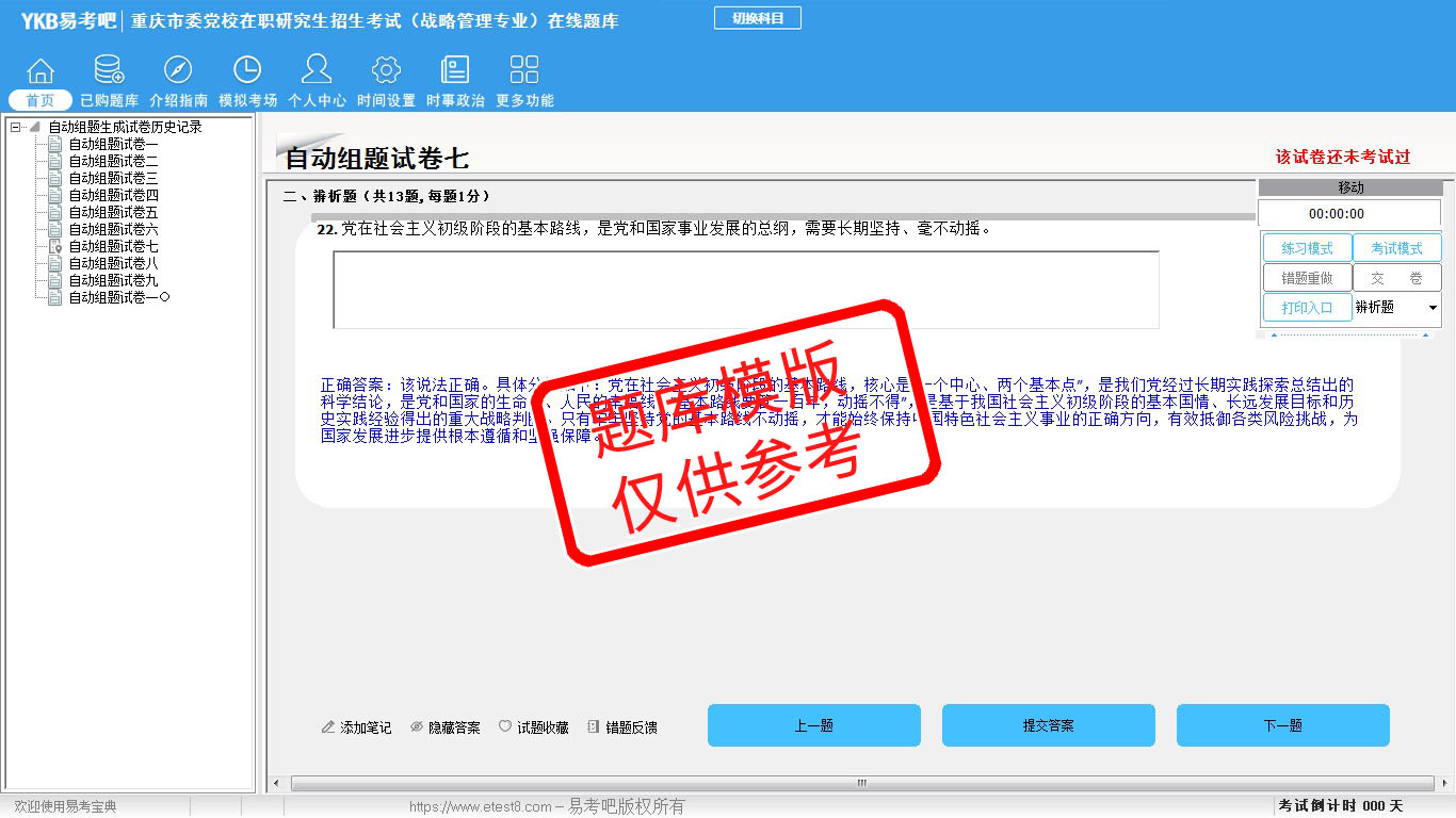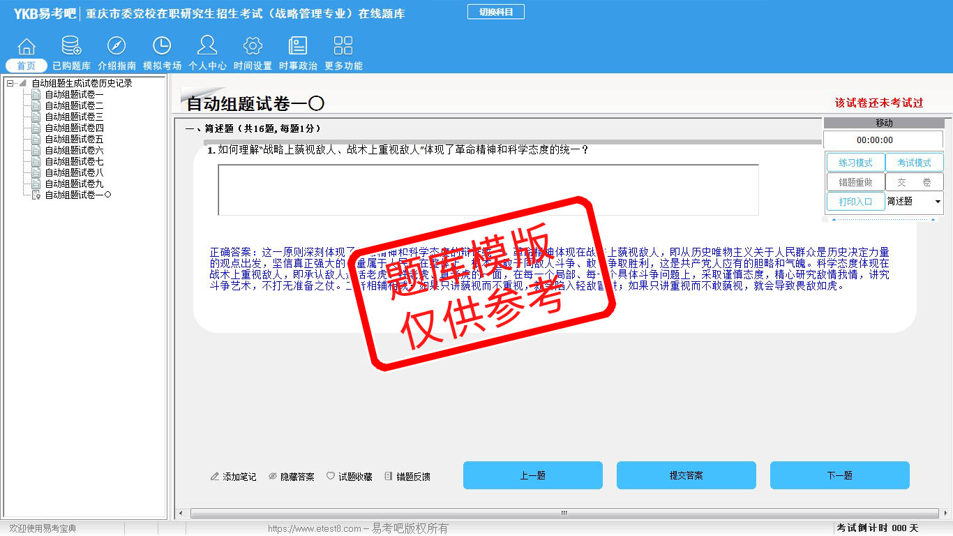 2026年重庆市委党校在职研究生招生考试(战略管理专业)易考宝典软件(手机/网页版)是《易考宝典》考试系列软件之一,是专门为参加“考研考博职业资格考试”的朋友量身定做的自我测试系统,是个人、培训学校进行考试前训练、备考冲刺的提分技巧考试平台,题型丰富,图文并茂,内容全面,题库设计符合考试新大纲,海量试题。软件包括了富有价值的模拟考场,有计时打分等功能,就像亲身体会考试一样。