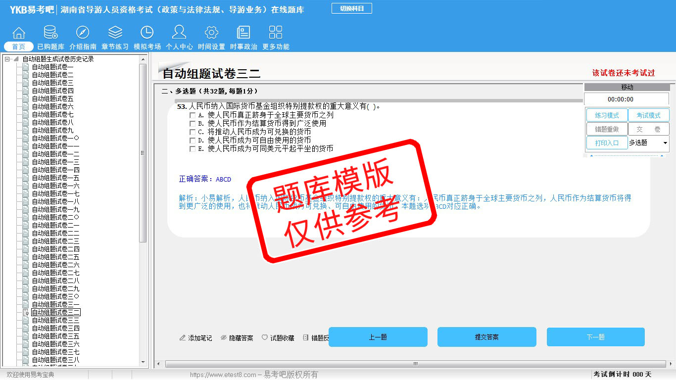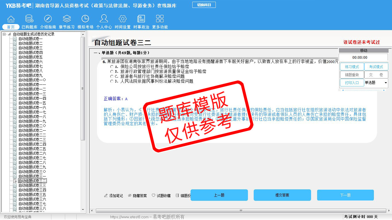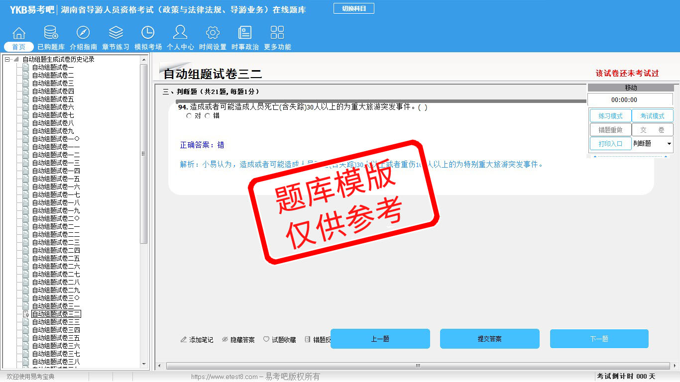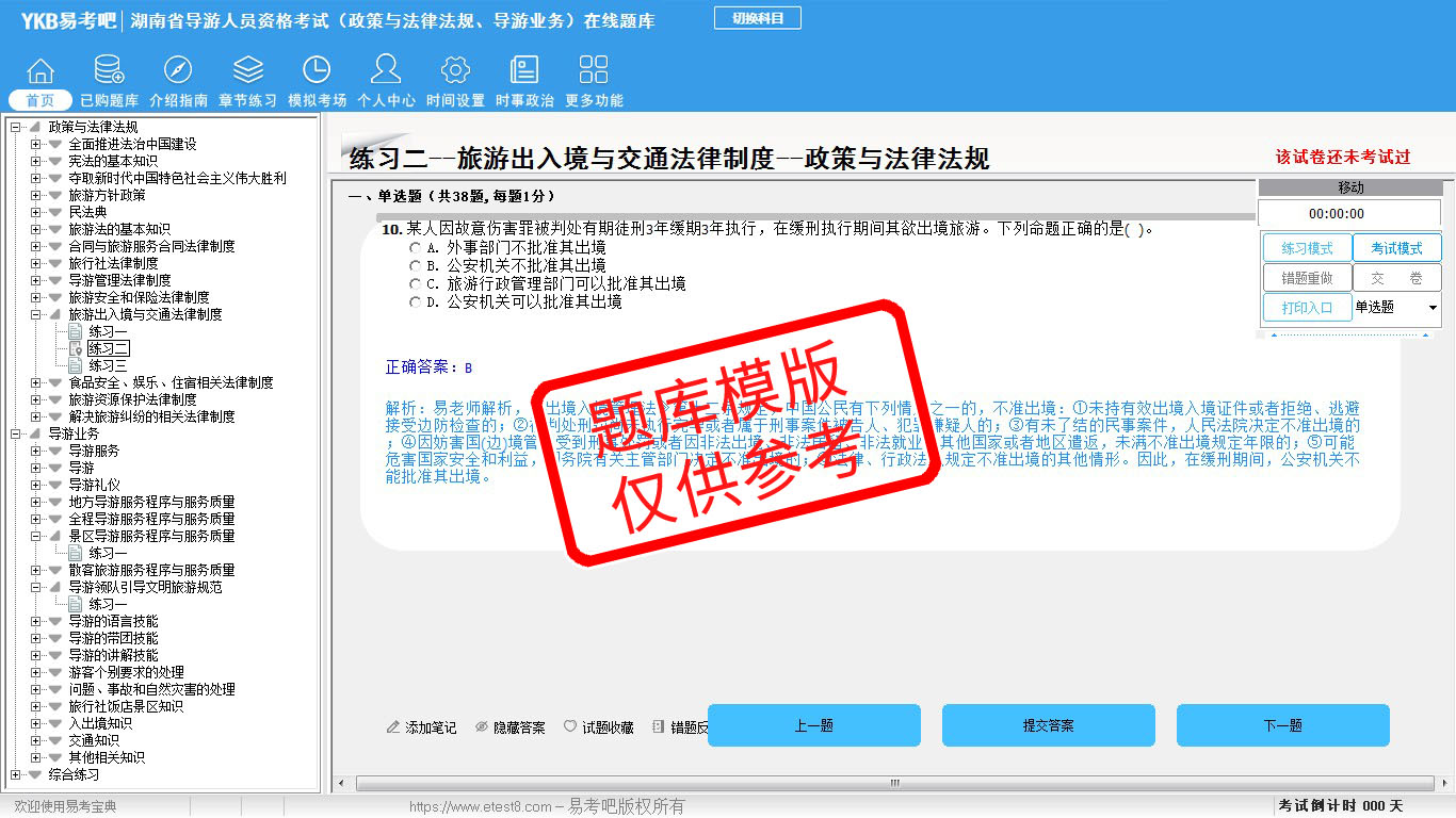 2026年湖南省导游人员资格考试(政策与法律法规、导游业务)易考宝典软件(手机/网页版)是《易考宝典》考试系列软件之一,是专门为参加“导游职业资格考试”的朋友量身定做的自我测试系统,是个人、培训学校进行考试前训练、备考冲刺的提分技巧考试平台,题型丰富,图文并茂,内容全面,题库设计符合考试新大纲,海量试题。软件包括了富有价值的模拟考场,有计时打分等功能,就像亲身体会考试一样。