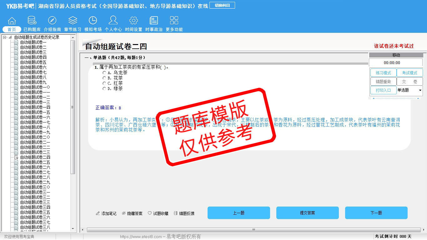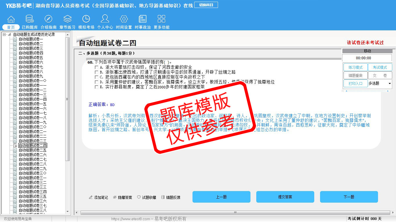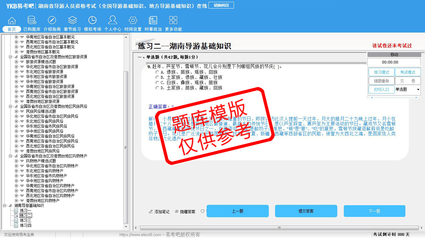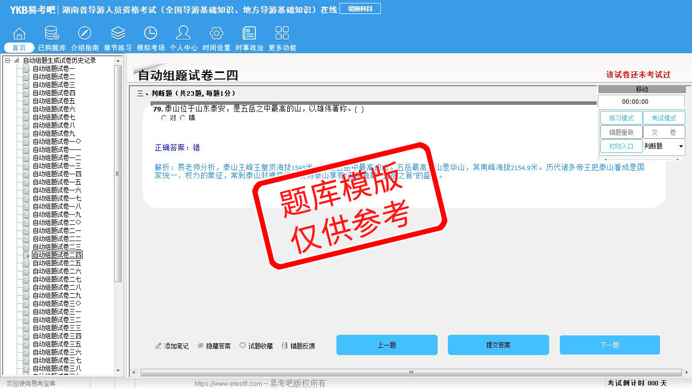 2026年湖南省导游人员资格考试(全国导游基础知识、地方导游基础知识)易考宝典软件(手机/网页版)是《易考宝典》考试系列软件之一,是专门为参加“导游职业资格考试”的朋友量身定做的自我测试系统,是个人、培训学校进行考试前训练、备考冲刺的提分技巧考试平台,题型丰富,图文并茂,内容全面,题库设计符合考试新大纲,海量试题。软件包括了富有价值的模拟考场,有计时打分等功能,就像亲身体会考试一样。
