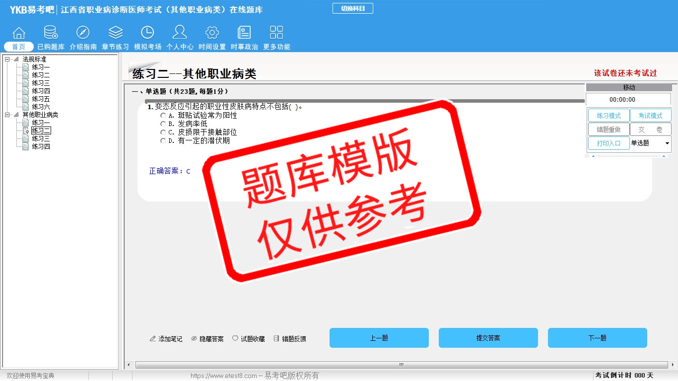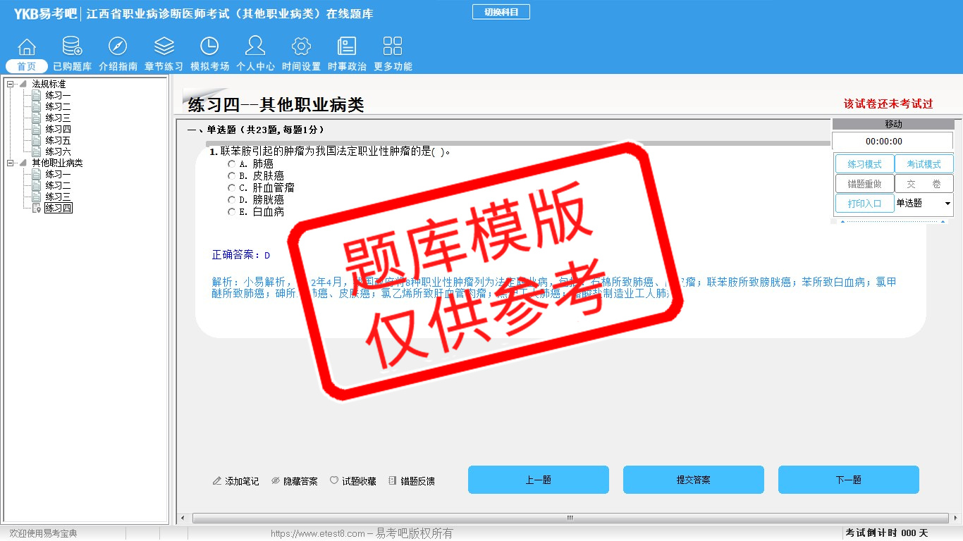 2026年江西省职业病诊断医师考试(其他职业病类)易考宝典软件(手机/网页版)是《易考宝典》考试系列软件之一,是专门为参加“执业医师职业资格考试”的朋友量身定做的自我测试系统,是个人、培训学校进行考试前训练、备考冲刺的提分技巧考试平台,题型丰富,图文并茂,内容全面,题库设计符合考试新大纲,海量试题。软件包括了富有价值的模拟考场,有计时打分等功能,就像亲身体会考试一样。