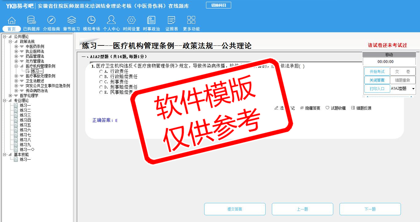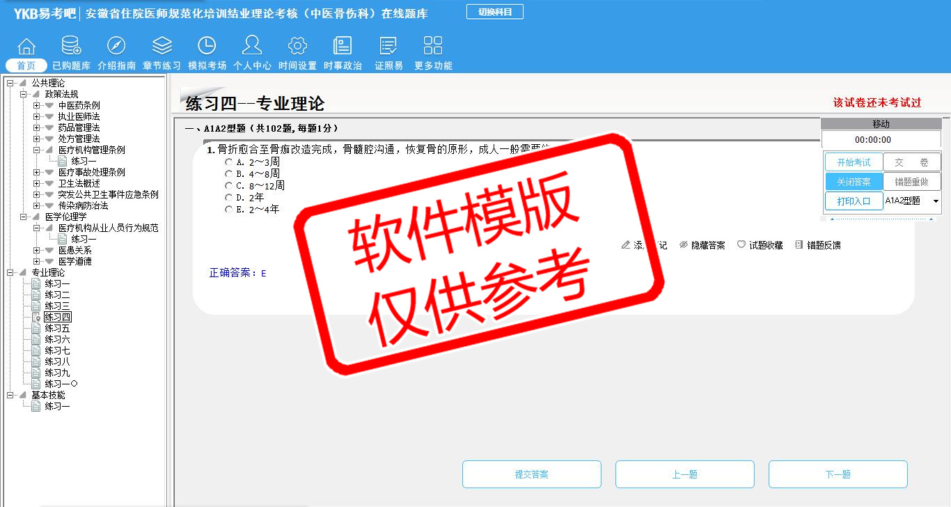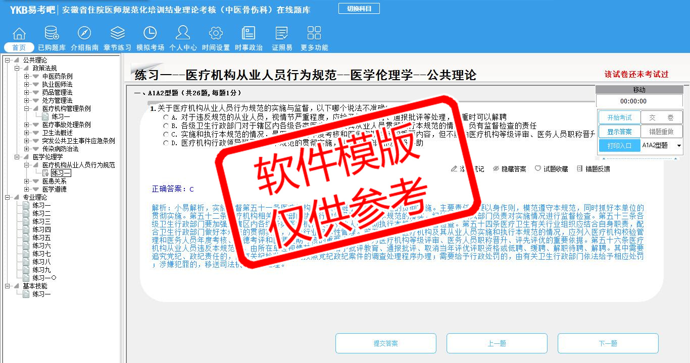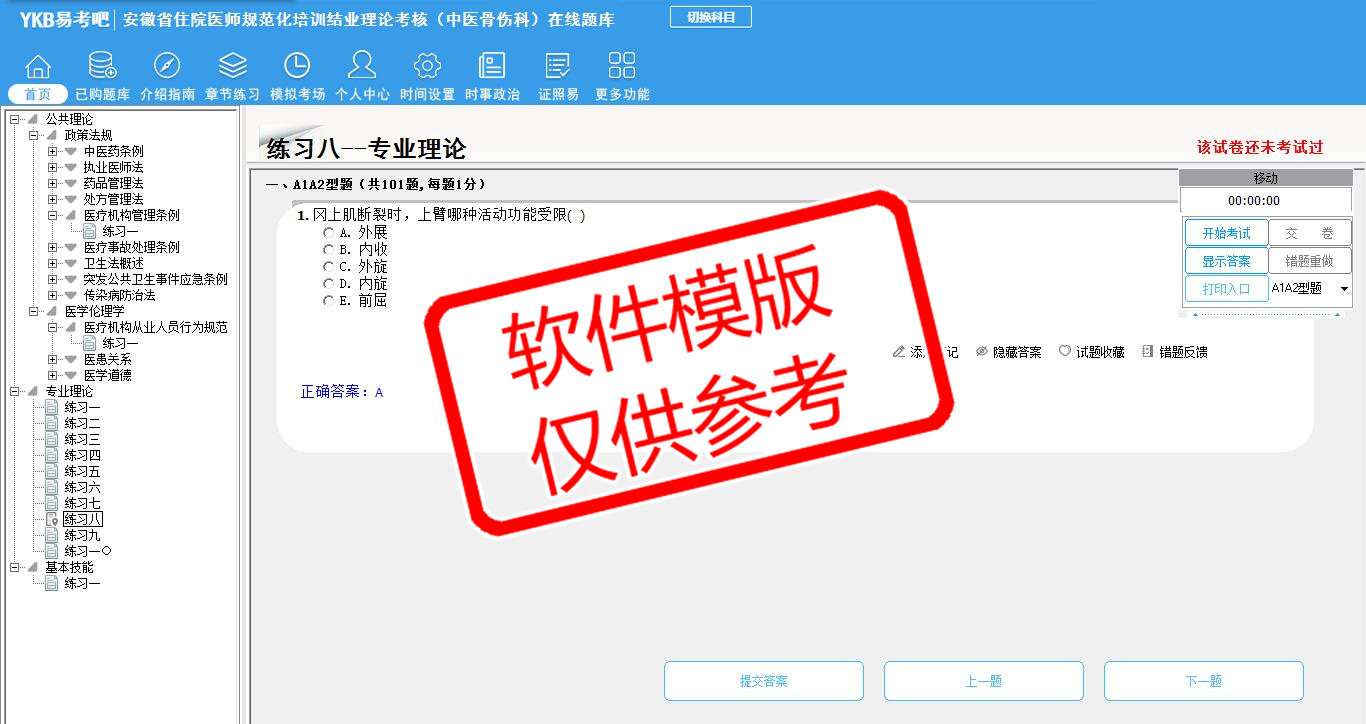 2026年安徽省住院医师规范化培训结业理论考核(中医骨伤科)易考宝典软件(手机/网页版)是《易考宝典》考试系列软件之一,是专门为参加“住院医师职业资格考试”的朋友量身定做的自我测试系统,是个人、培训学校进行考试前训练、备考冲刺的提分技巧考试平台,题型丰富,图文并茂,内容全面,题库设计符合考试新大纲,海量试题。软件包括了富有价值的模拟考场,有计时打分等功能,就像亲身体会考试一样。