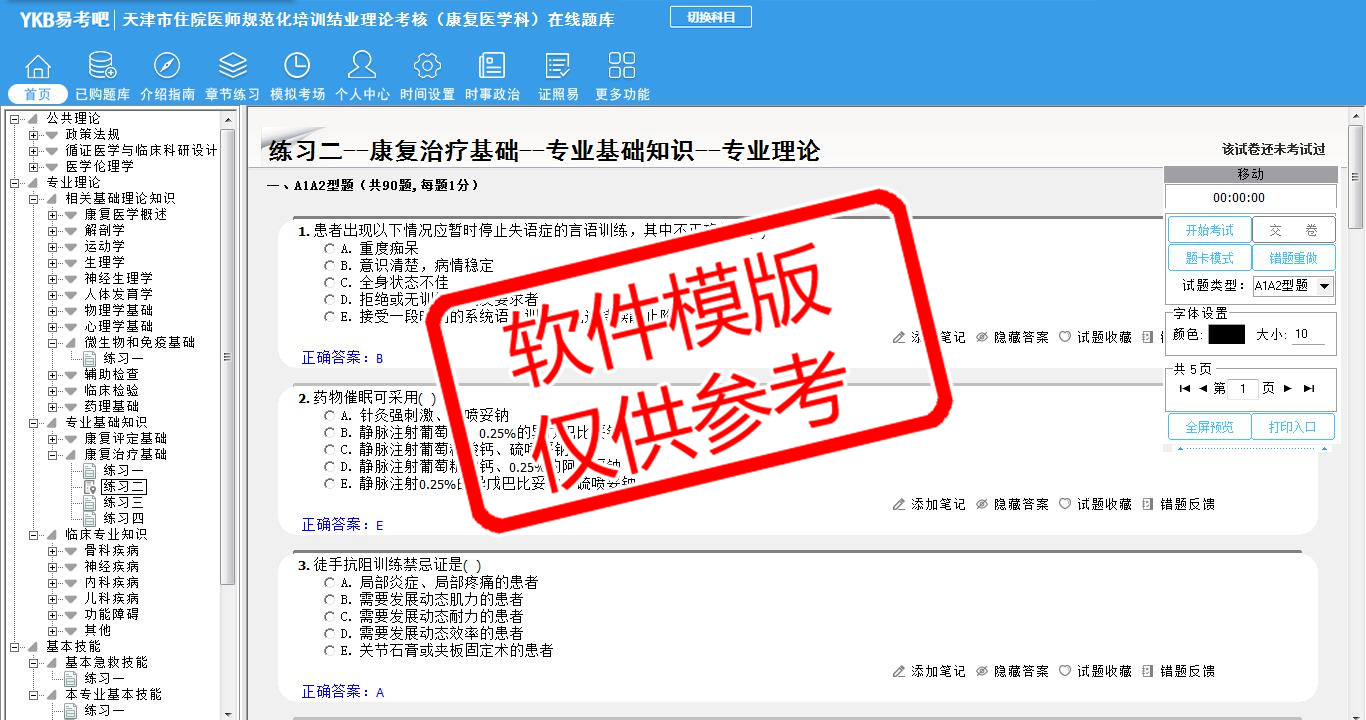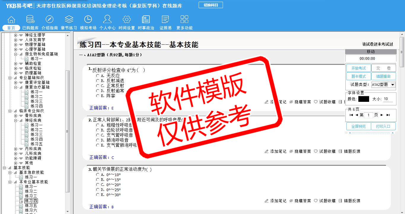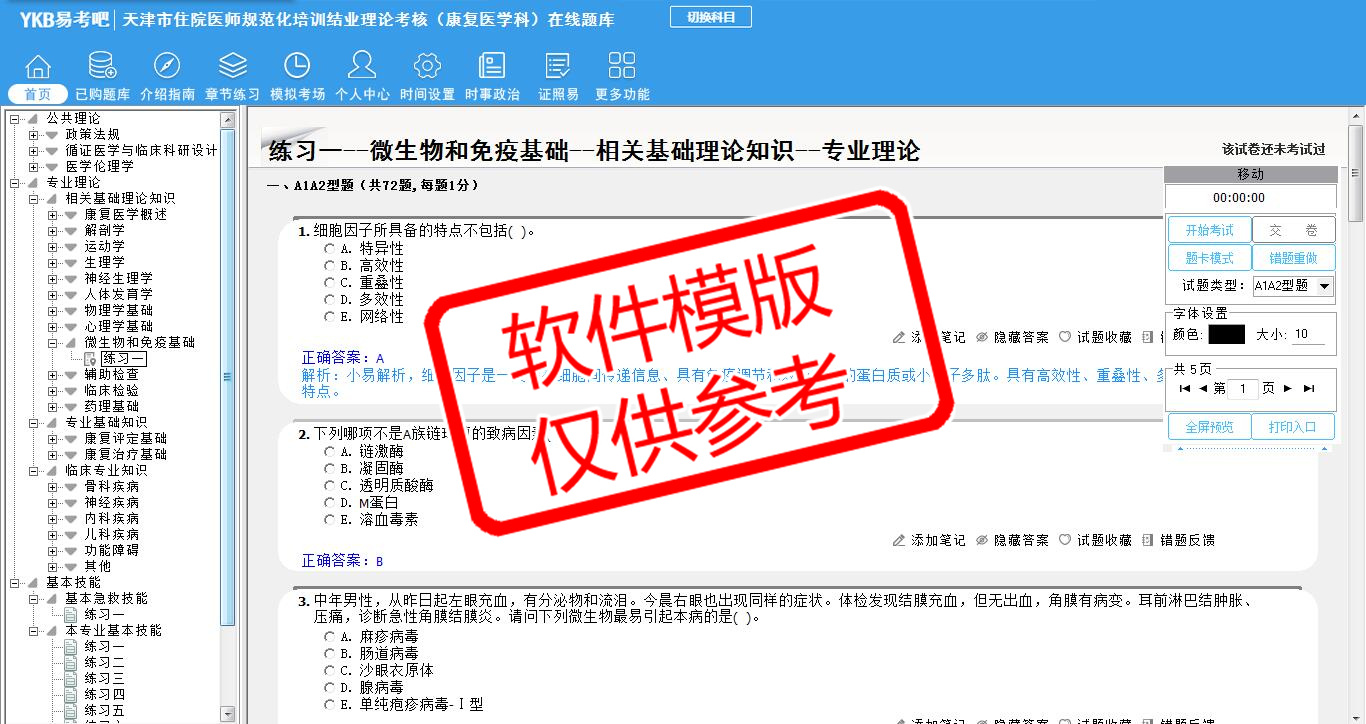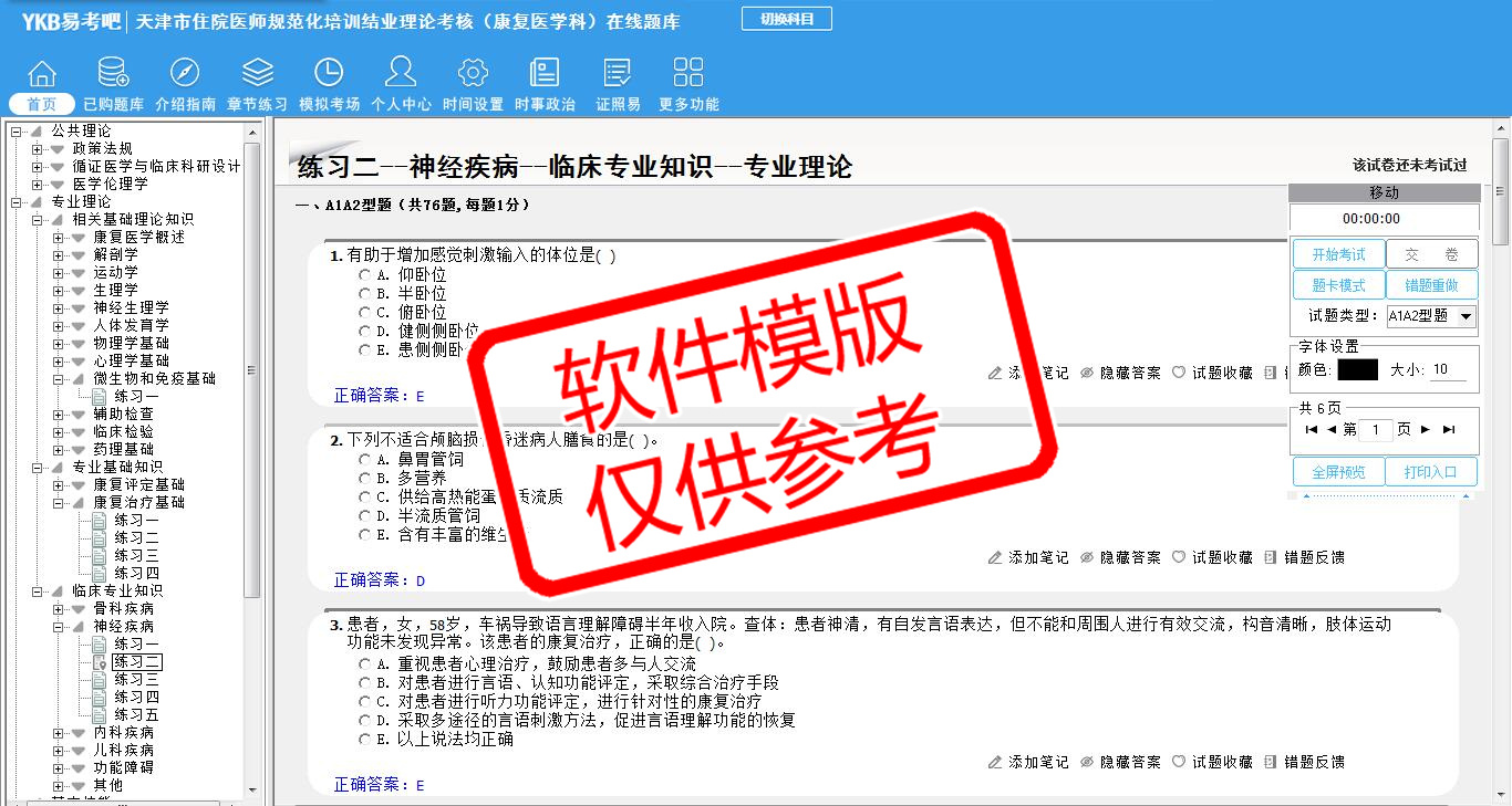 2026年天津市住院医师规范化培训结业理论考核(康复医学科)易考宝典软件(手机/网页版)是《易考宝典》考试系列软件之一,是专门为参加“住院医师职业资格考试”的朋友量身定做的自我测试系统,是个人、培训学校进行考试前训练、备考冲刺的提分技巧考试平台,题型丰富,图文并茂,内容全面,题库设计符合考试新大纲,海量试题。软件包括了富有价值的模拟考场,有计时打分等功能,就像亲身体会考试一样。