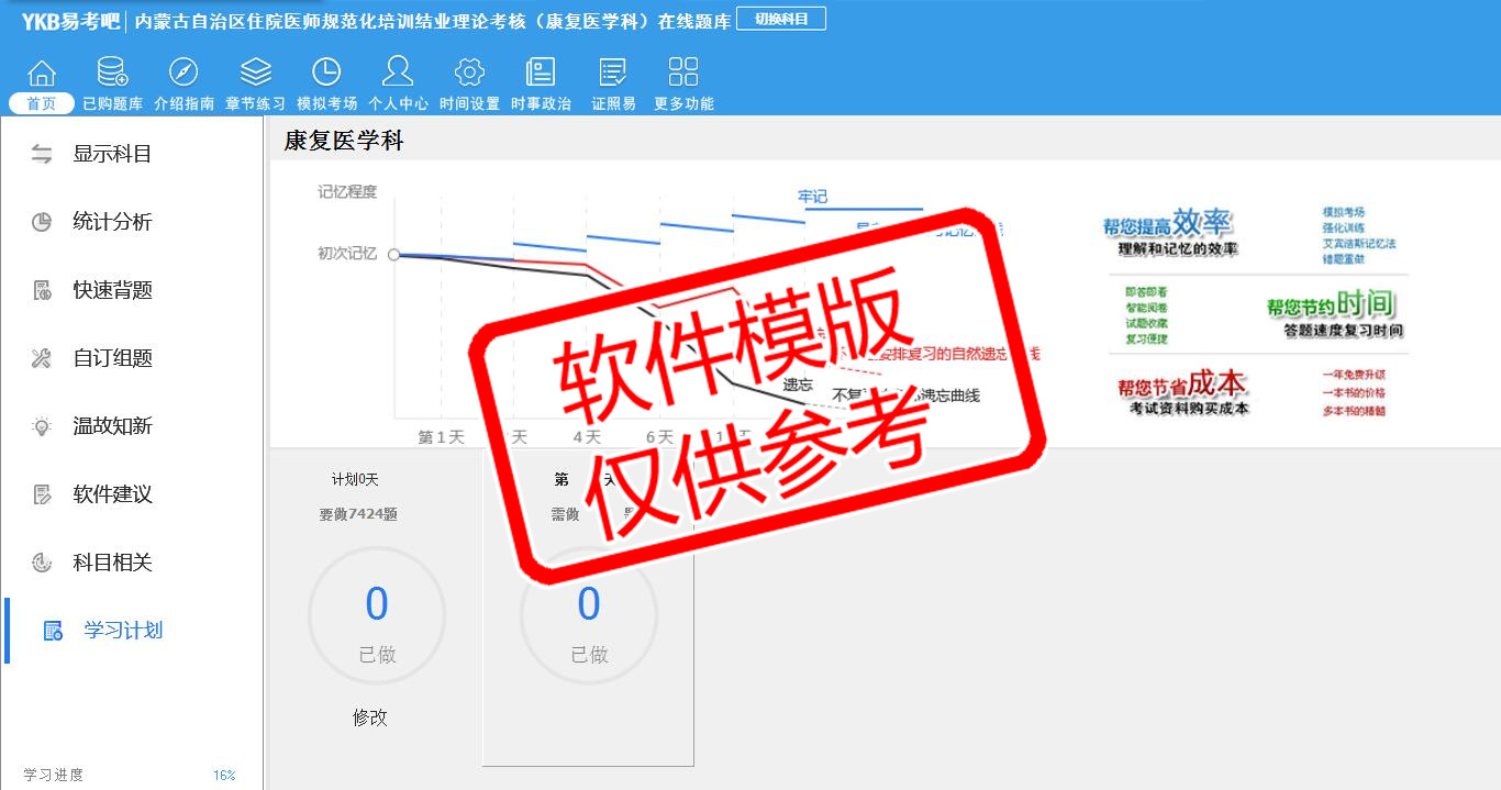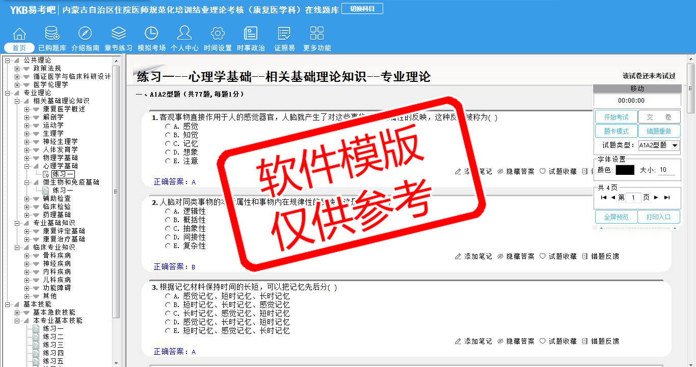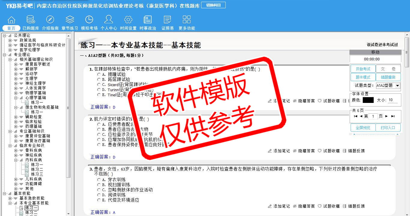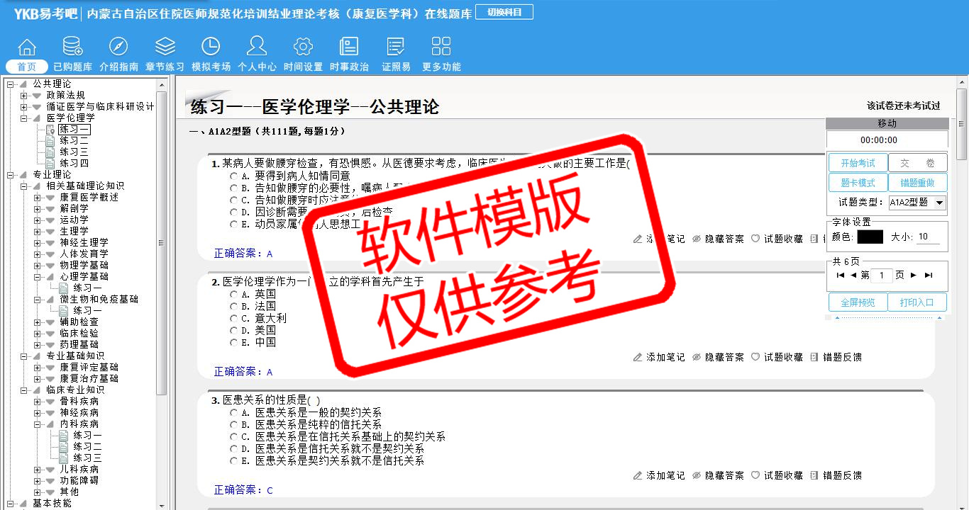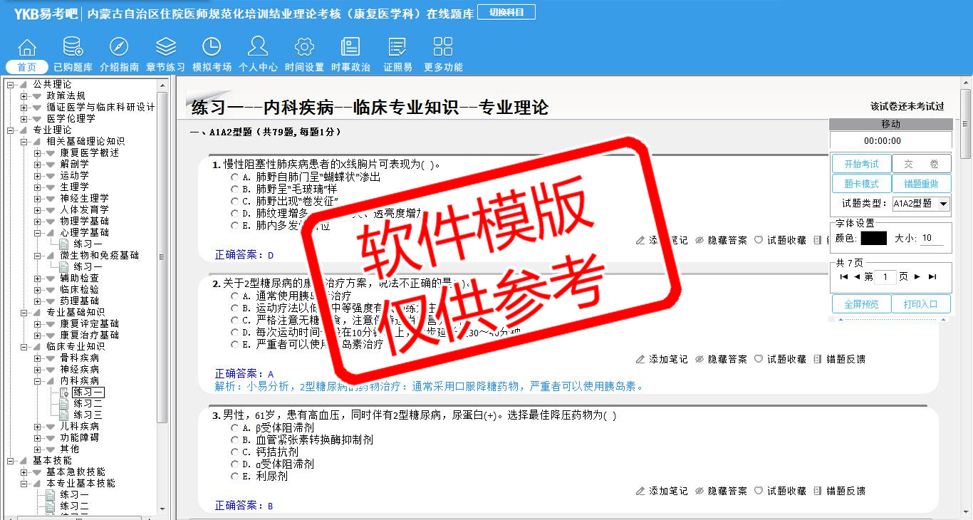 2026年内蒙古自治区住院医师规范化培训结业理论考核(康复医学科)易考宝典软件(手机/网页版)是《易考宝典》考试系列软件之一,是专门为参加“住院医师职业资格考试”的朋友量身定做的自我测试系统,是个人、培训学校进行考试前训练、备考冲刺的提分技巧考试平台,题型丰富,图文并茂,内容全面,题库设计符合考试新大纲,海量试题。软件包括了富有价值的模拟考场,有计时打分等功能,就像亲身体会考试一样。