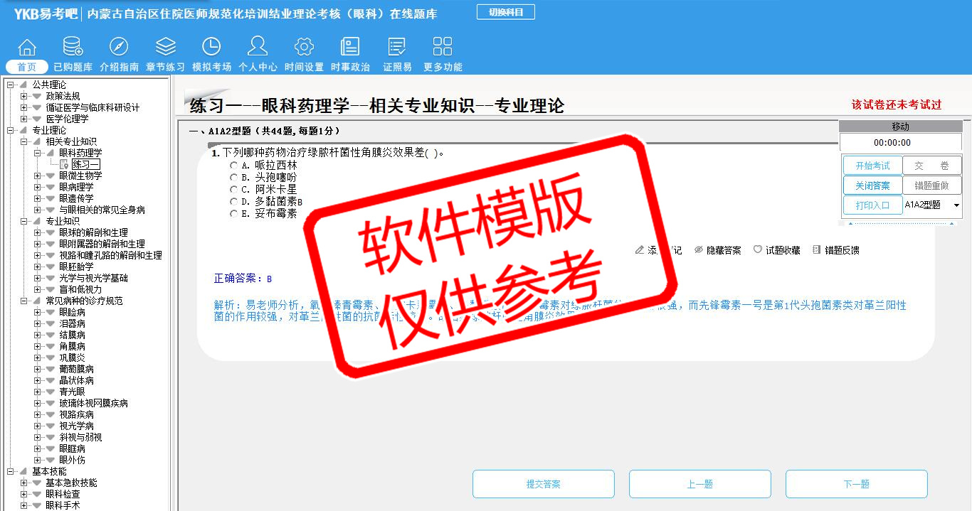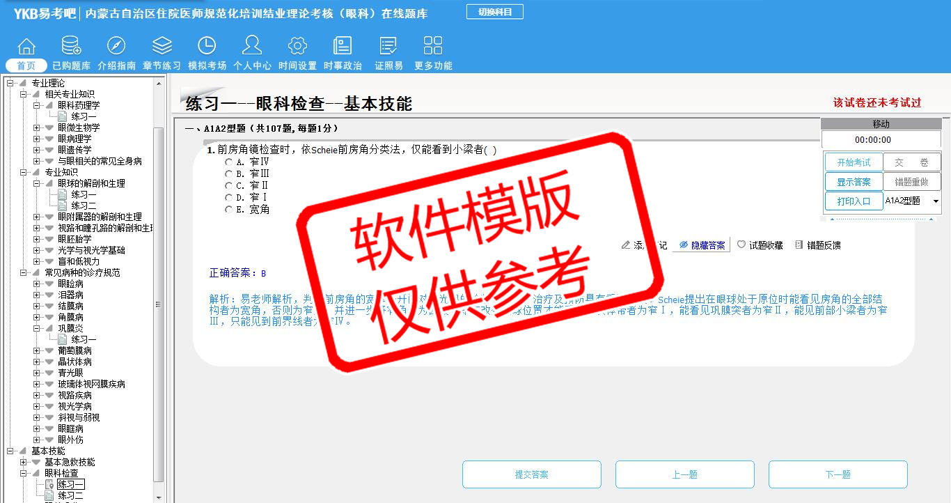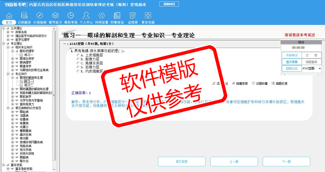 2026年内蒙古自治区住院医师规范化培训结业理论考核(眼科)易考宝典软件(手机/网页版)是《易考宝典》考试系列软件之一,是专门为参加“住院医师职业资格考试”的朋友量身定做的自我测试系统,是个人、培训学校进行考试前训练、备考冲刺的提分技巧考试平台,题型丰富,图文并茂,内容全面,题库设计符合考试新大纲,海量试题。软件包括了富有价值的模拟考场,有计时打分等功能,就像亲身体会考试一样。