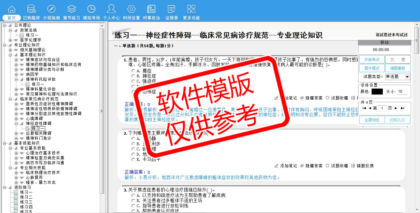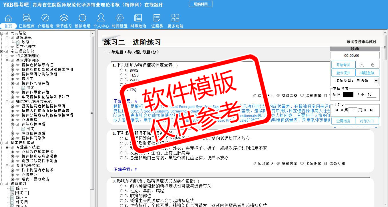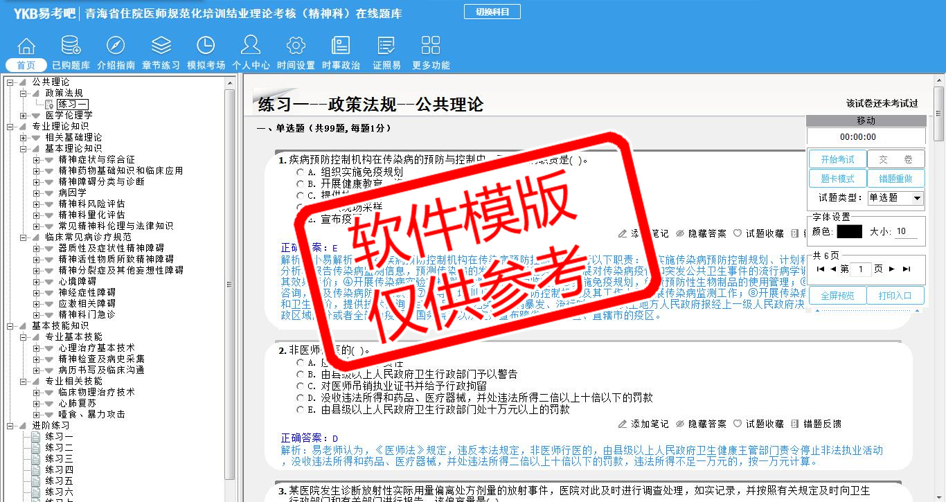 2026年青海省住院医师规范化培训结业理论考核(精神科)易考宝典软件(手机/网页版)是《易考宝典》考试系列软件之一,是专门为参加“住院医师职业资格考试”的朋友量身定做的自我测试系统,是个人、培训学校进行考试前训练、备考冲刺的提分技巧考试平台,题型丰富,图文并茂,内容全面,题库设计符合考试新大纲,海量试题。软件包括了富有价值的模拟考场,有计时打分等功能,就像亲身体会考试一样。