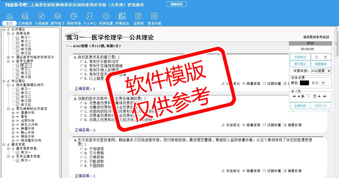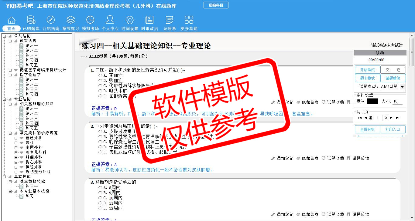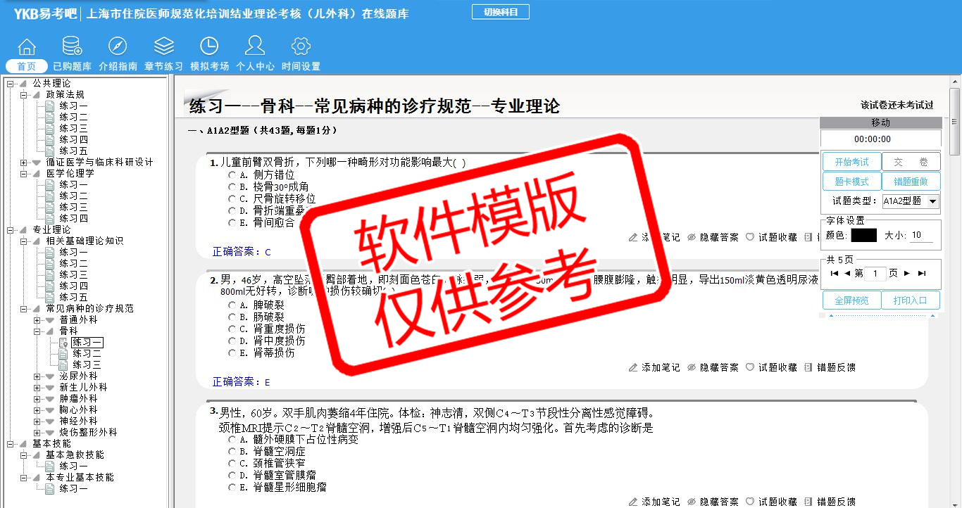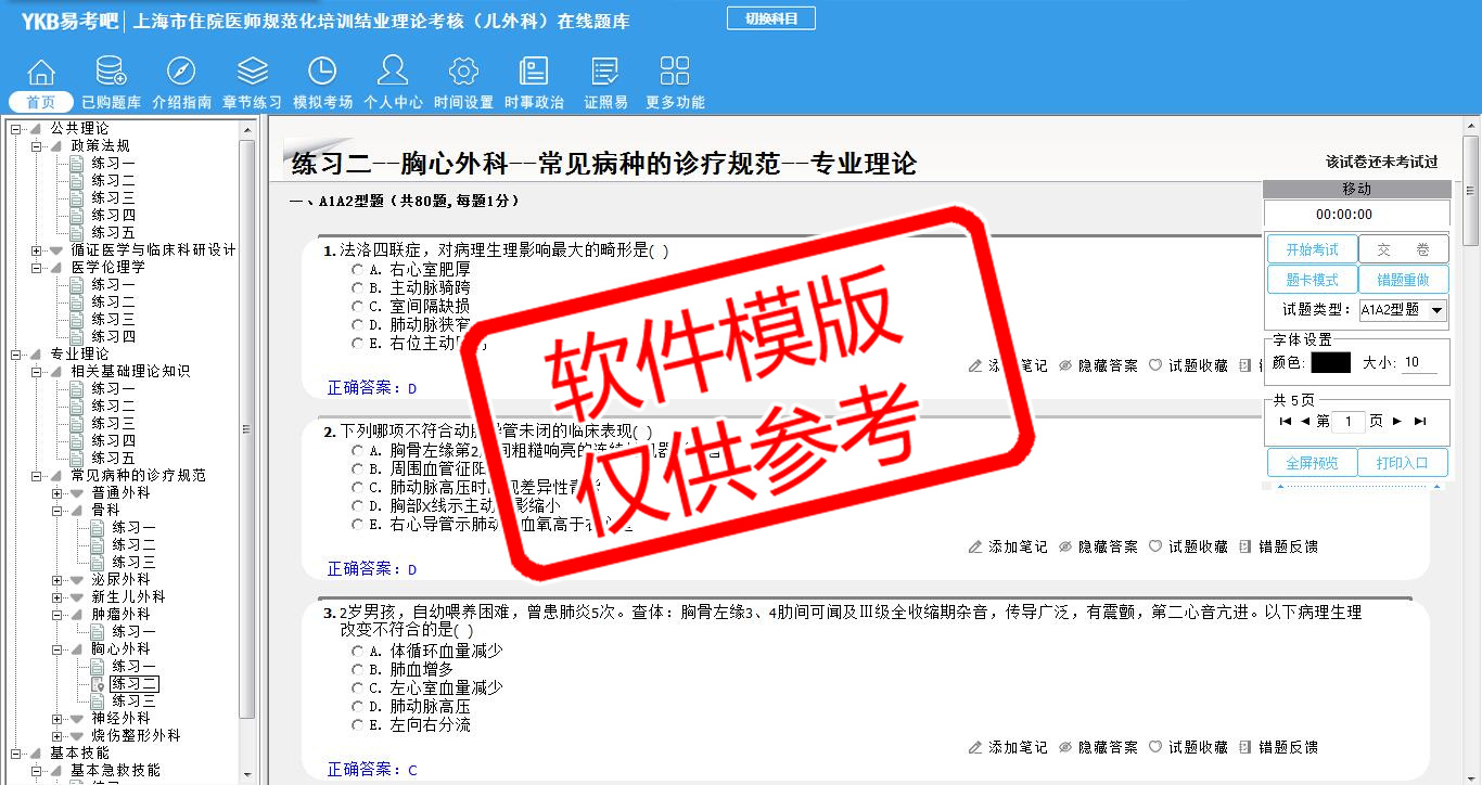 2026年上海市住院医师规范化培训结业理论考核(儿外科)易考宝典软件(手机/网页版)是《易考宝典》考试系列软件之一,是专门为参加“住院医师职业资格考试”的朋友量身定做的自我测试系统,是个人、培训学校进行考试前训练、备考冲刺的提分技巧考试平台,题型丰富,图文并茂,内容全面,题库设计符合考试新大纲,海量试题。软件包括了富有价值的模拟考场,有计时打分等功能,就像亲身体会考试一样。
