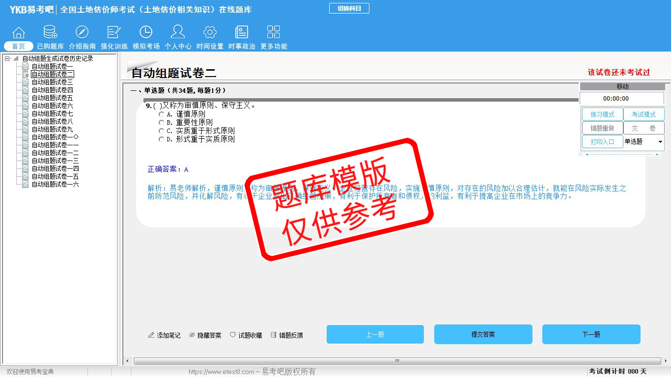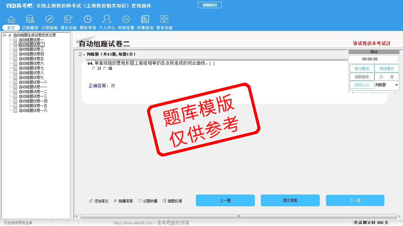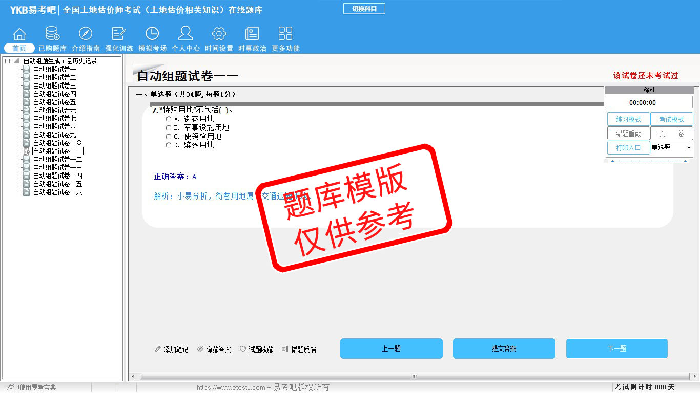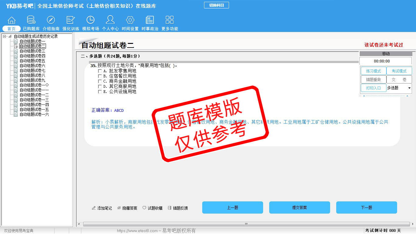2026年全国土地估价师考试(土地估价相关知识)易考宝典软件(手机/网页版)是《易考宝典》考试系列软件之一,是专门为参加“土地估价师职业资格考试”的朋友量身定做的自我测试系统,是个人、培训学校进行考试前训练、备考冲刺的提分技巧考试平台,题型丰富,图文并茂,内容全面,题库设计符合考试新大纲,海量试题。软件包括了富有价值的模拟考场,有计时打分等功能,就像亲身体会考试一样。