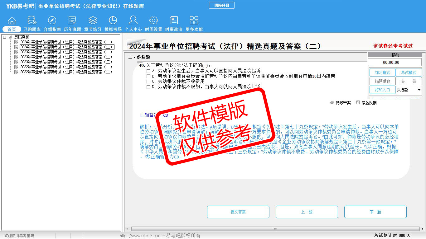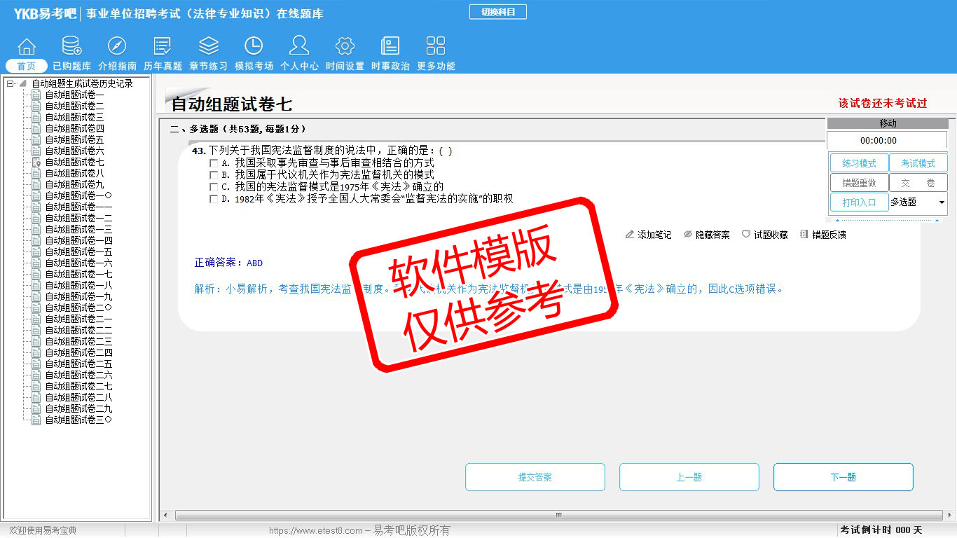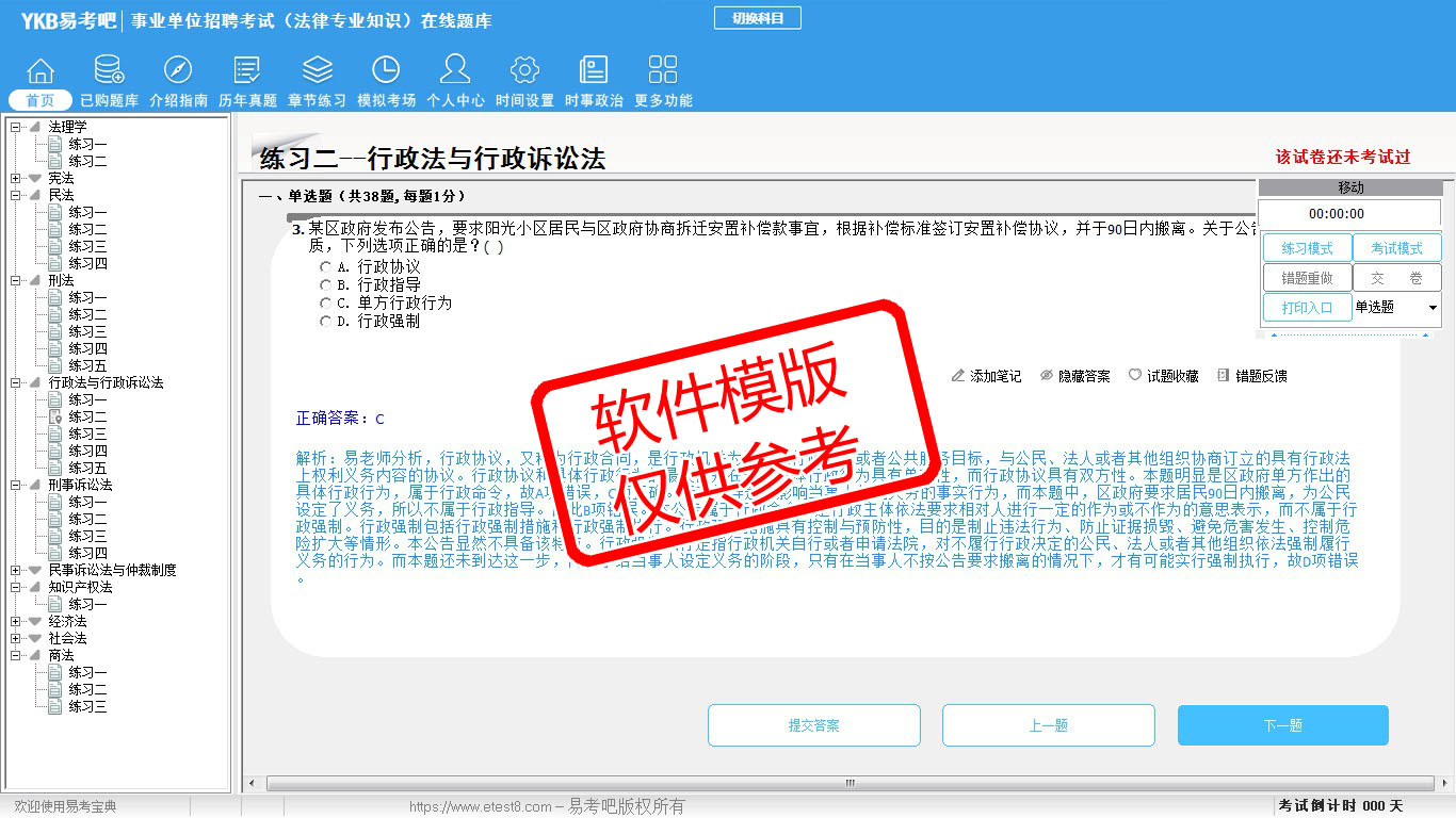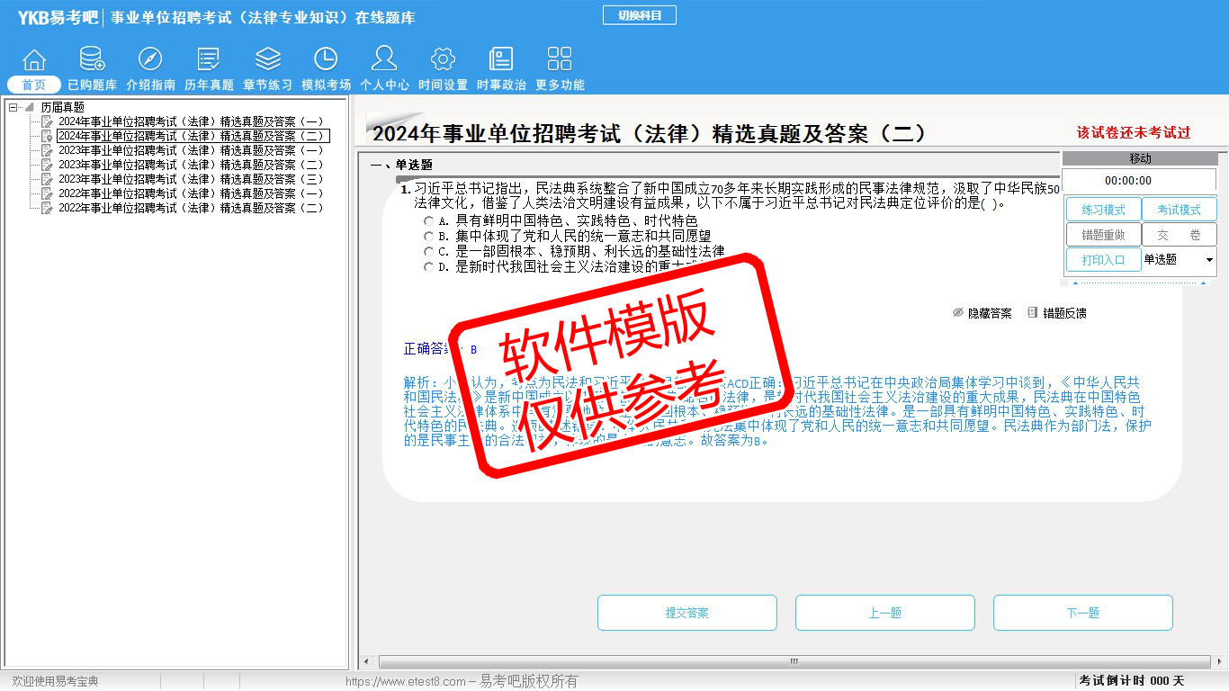2026年事业单位招聘考试(法律专业知识)易考宝典软件(手机/网页版)是《易考宝典》考试系列软件之一,是专门为参加“事业单位职业资格考试”的朋友量身定做的自我测试系统,是个人、培训学校进行考试前训练、备考冲刺的提分技巧考试平台,题型丰富,图文并茂,内容全面,题库设计符合考试新大纲,海量试题。软件包括了富有价值的模拟考场,有计时打分等功能,就像亲身体会考试一样。