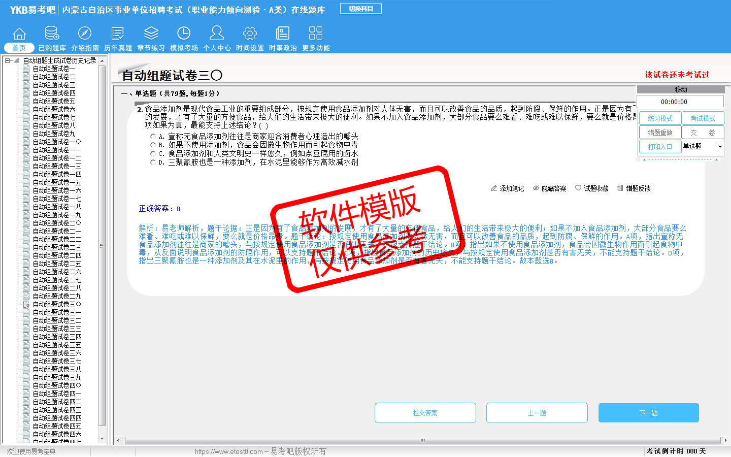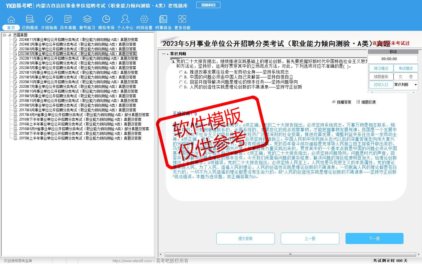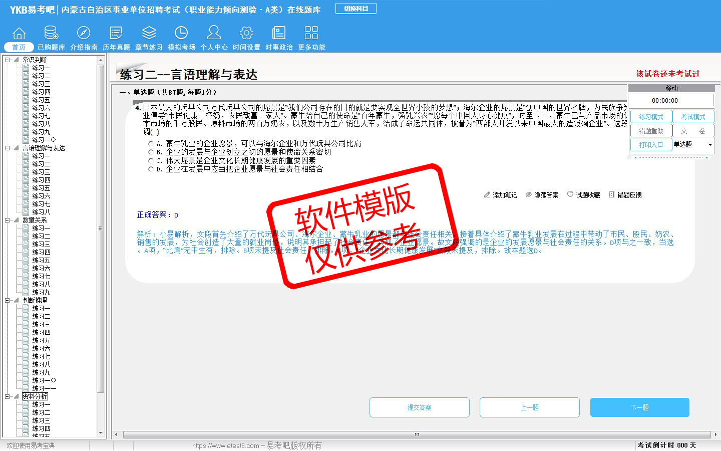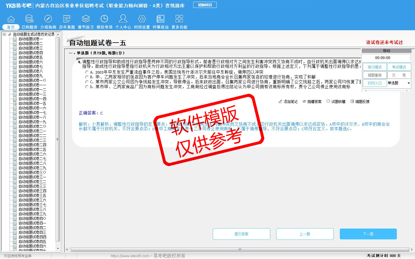 2026年内蒙古自治区事业单位招聘考试(综合管理类·A类)易考宝典软件(含2科)(手机/网页版)是《易考宝典》考试系列软件之一,是专门为参加“事业单位职业资格考试”的朋友量身定做的自我测试系统,是个人、培训学校进行考试前训练、备考冲刺的提分技巧考试平台,题型丰富,图文并茂,内容全面,题库设计符合考试新大纲,海量试题。软件包括了富有价值的模拟考场,有计时打分等功能,就像亲身体会考试一样。