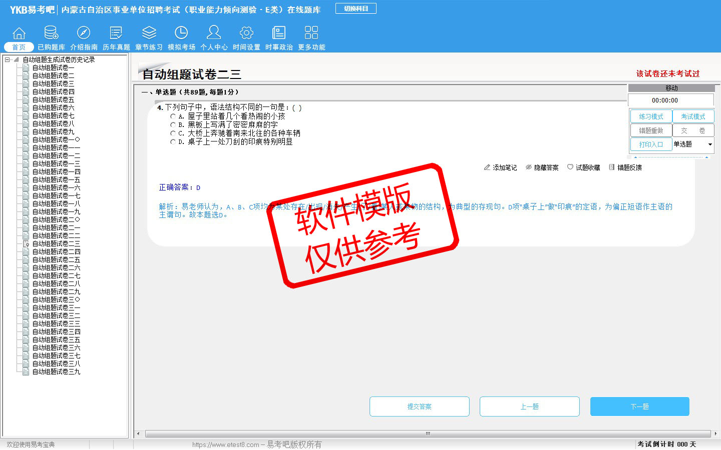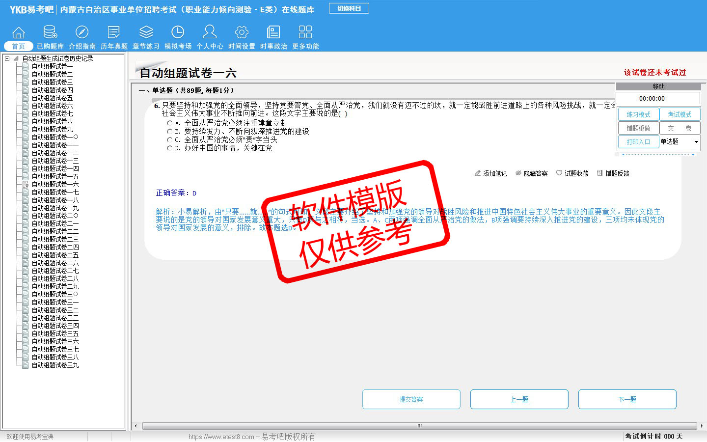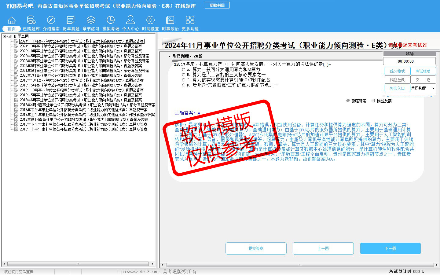 2026年内蒙古自治区事业单位招聘考试(医疗卫生类·E类)易考宝典软件(含2科)(手机/网页版)是《易考宝典》考试系列软件之一,是专门为参加“事业单位职业资格考试”的朋友量身定做的自我测试系统,是个人、培训学校进行考试前训练、备考冲刺的提分技巧考试平台,题型丰富,图文并茂,内容全面,题库设计符合考试新大纲,海量试题。软件包括了富有价值的模拟考场,有计时打分等功能,就像亲身体会考试一样。