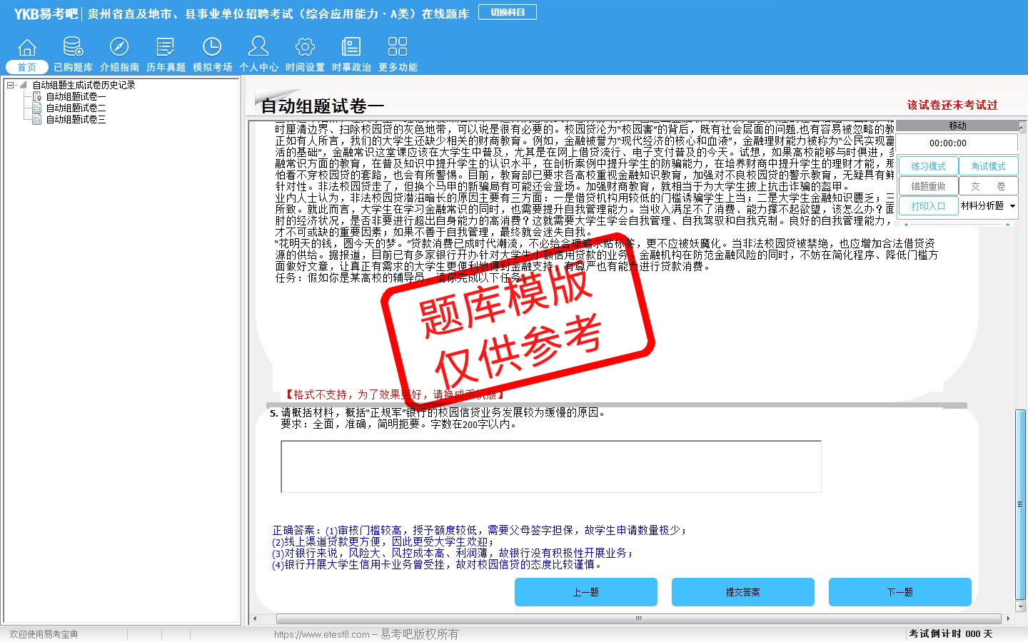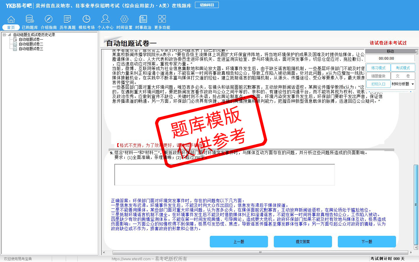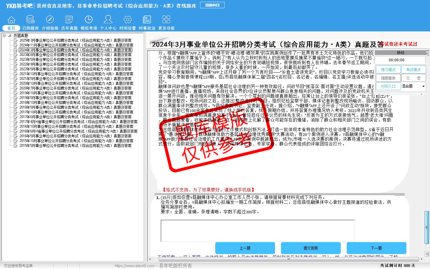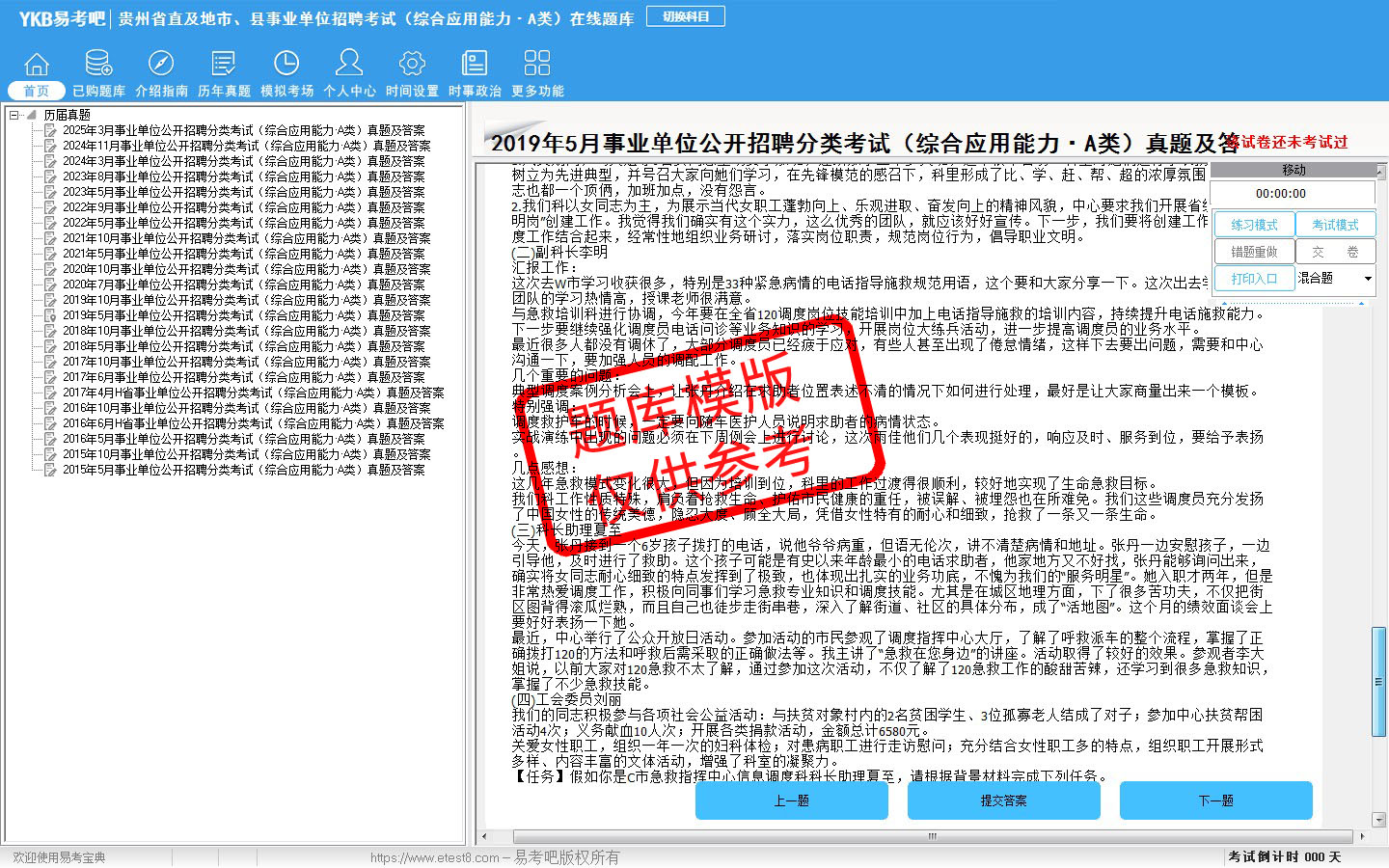 2026年贵州省直及地市、县事业单位招聘考试(综合管理类·A类)易考宝典软件(含2科)(手机/网页版)是《易考宝典》考试系列软件之一,是专门为参加“事业单位职业资格考试”的朋友量身定做的自我测试系统,是个人、培训学校进行考试前训练、备考冲刺的提分技巧考试平台,题型丰富,图文并茂,内容全面,题库设计符合考试新大纲,海量试题。软件包括了富有价值的模拟考场,有计时打分等功能,就像亲身体会考试一样。
