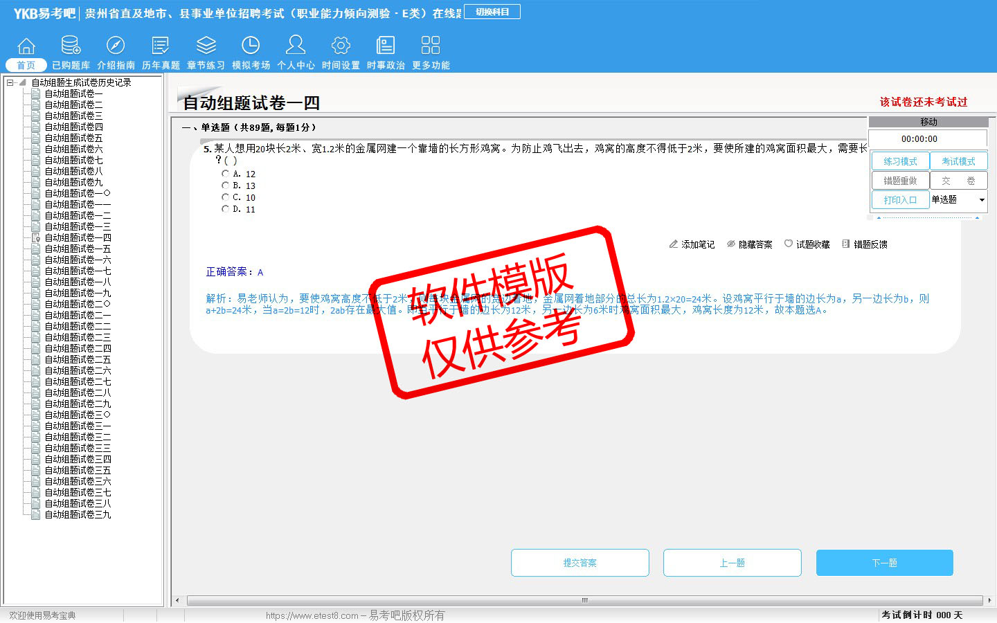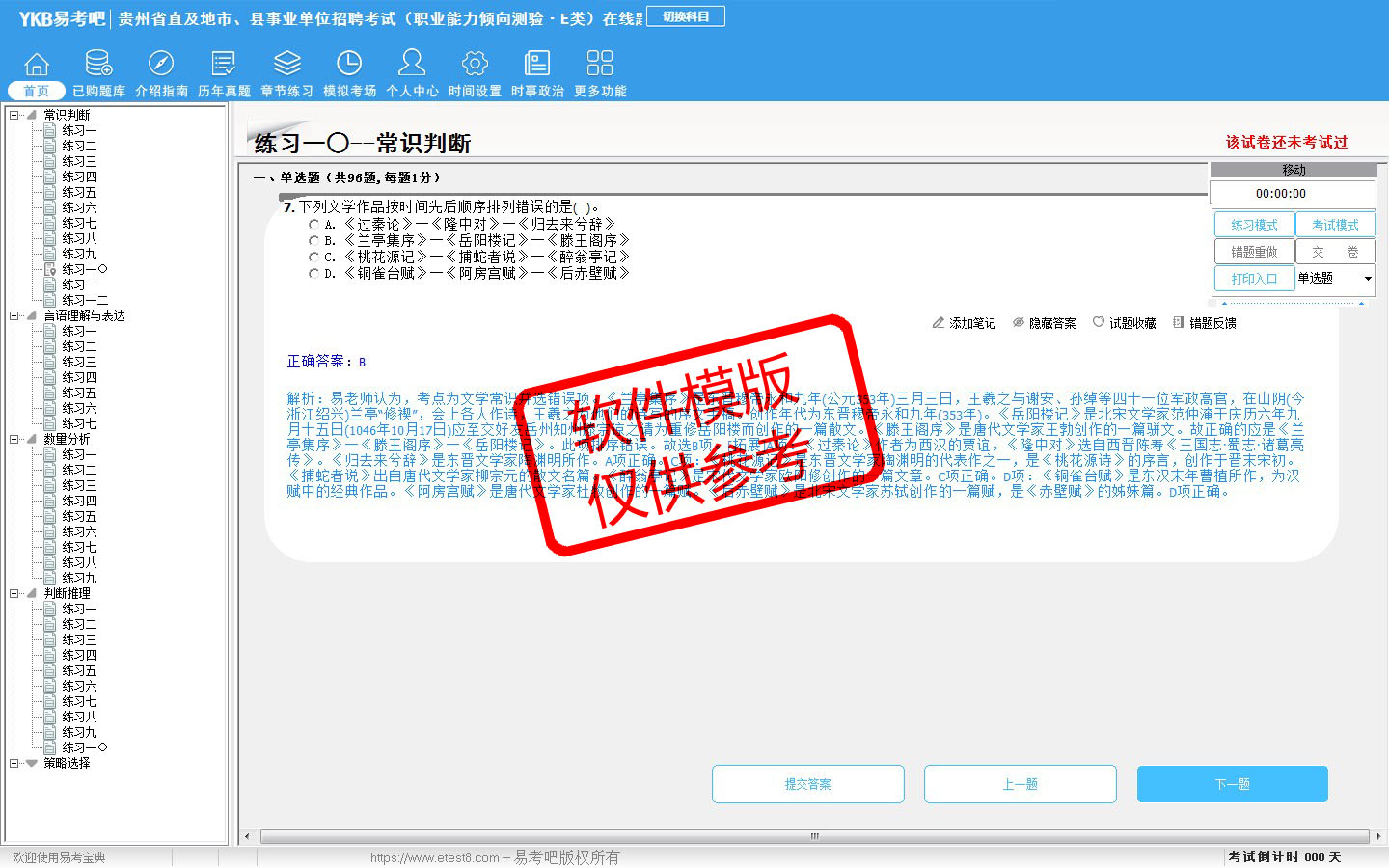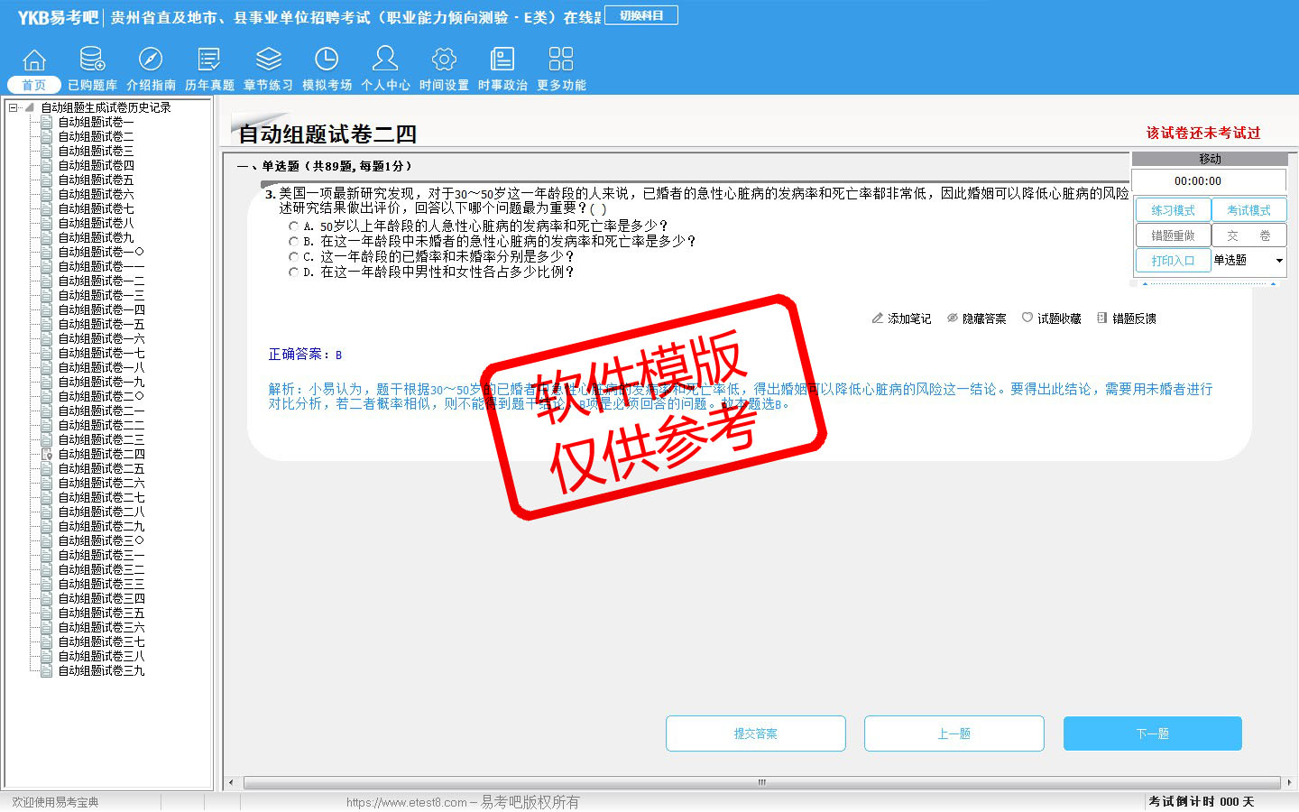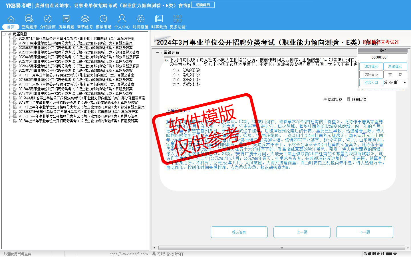 2026年贵州省直及地市、县事业单位招聘考试(医疗卫生类·E类)易考宝典软件(含2科)(手机/网页版)是《易考宝典》考试系列软件之一,是专门为参加“事业单位职业资格考试”的朋友量身定做的自我测试系统,是个人、培训学校进行考试前训练、备考冲刺的提分技巧考试平台,题型丰富,图文并茂,内容全面,题库设计符合考试新大纲,海量试题。软件包括了富有价值的模拟考场,有计时打分等功能,就像亲身体会考试一样。