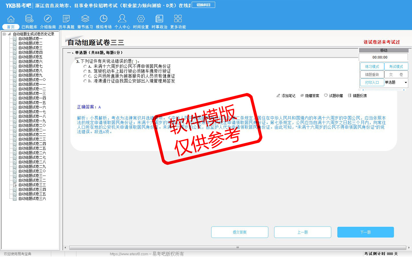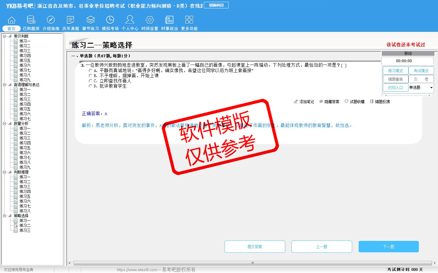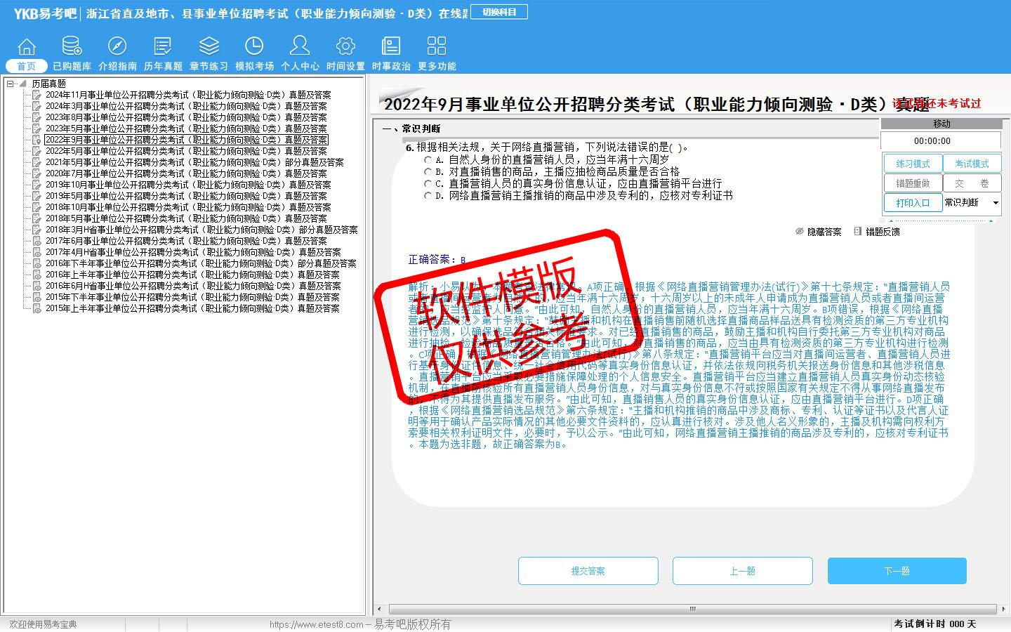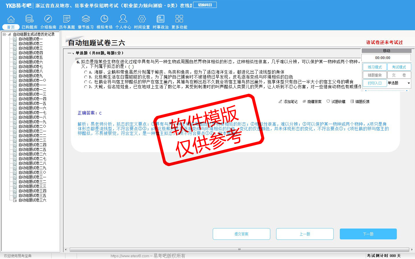 2026年浙江省直及地市、县事业单位招聘考试(中小学教师类·D类)易考宝典软件(含2科)(手机/网页版)是《易考宝典》考试系列软件之一,是专门为参加“事业单位职业资格考试”的朋友量身定做的自我测试系统,是个人、培训学校进行考试前训练、备考冲刺的提分技巧考试平台,题型丰富,图文并茂,内容全面,题库设计符合考试新大纲,海量试题。软件包括了富有价值的模拟考场,有计时打分等功能,就像亲身体会考试一样。