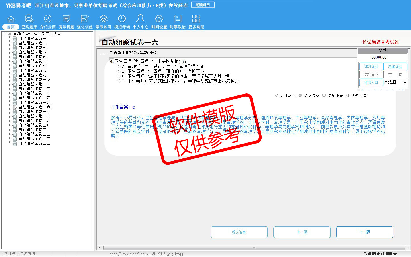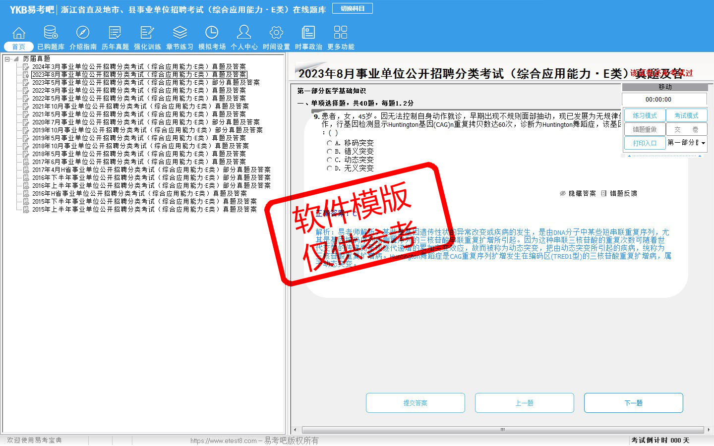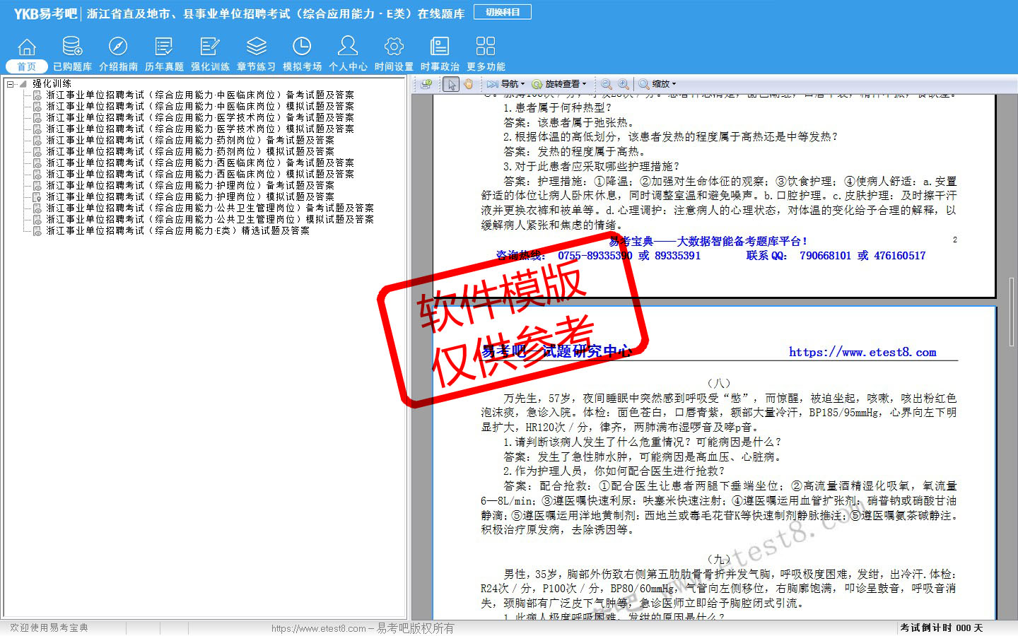2026年浙江省直及地市、县事业单位招聘考试(医疗卫生类·E类)易考宝典软件(含2科)(手机/网页版)是《易考宝典》考试系列软件之一,是专门为参加“事业单位职业资格考试”的朋友量身定做的自我测试系统,是个人、培训学校进行考试前训练、备考冲刺的提分技巧考试平台,题型丰富,图文并茂,内容全面,题库设计符合考试新大纲,海量试题。软件包括了富有价值的模拟考场,有计时打分等功能,就像亲身体会考试一样。