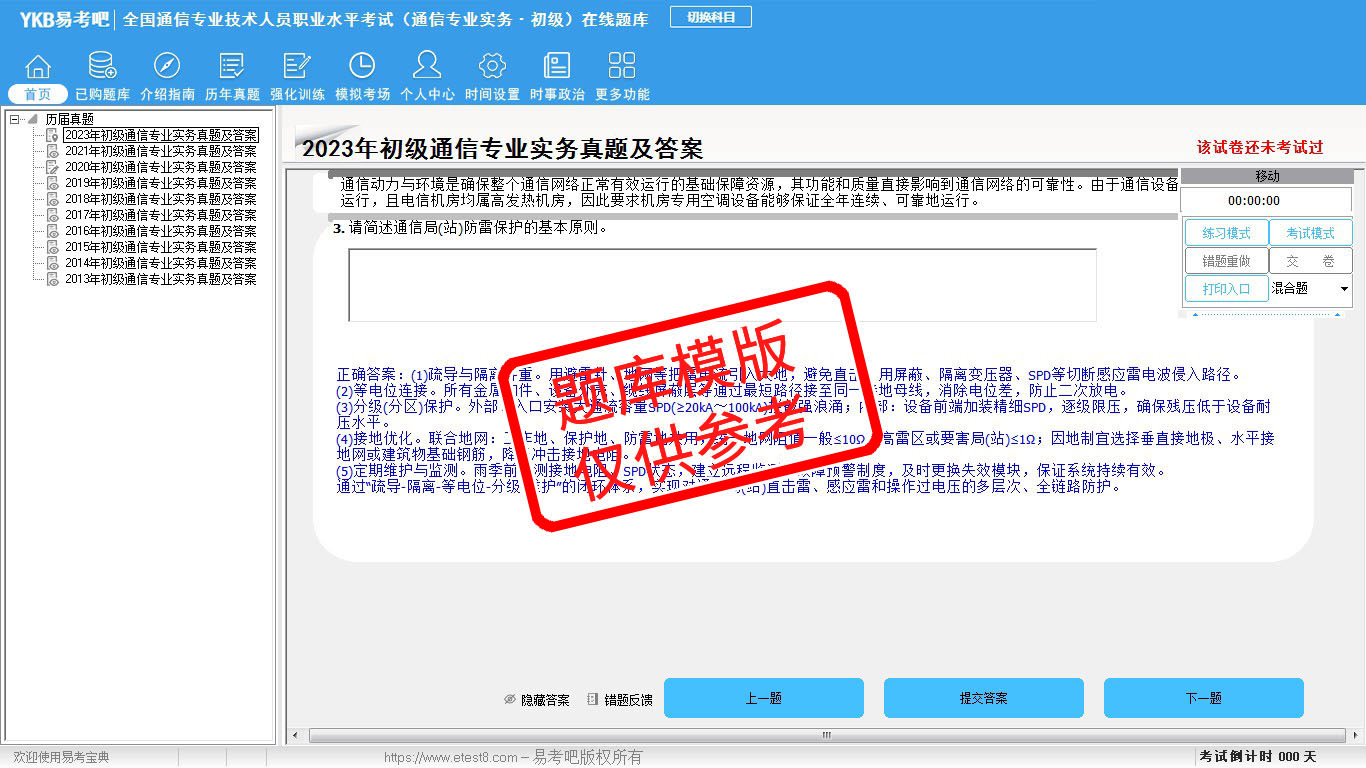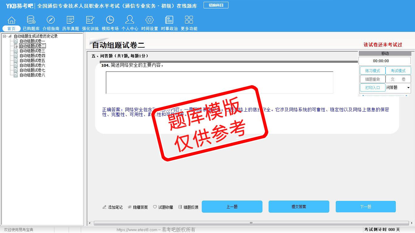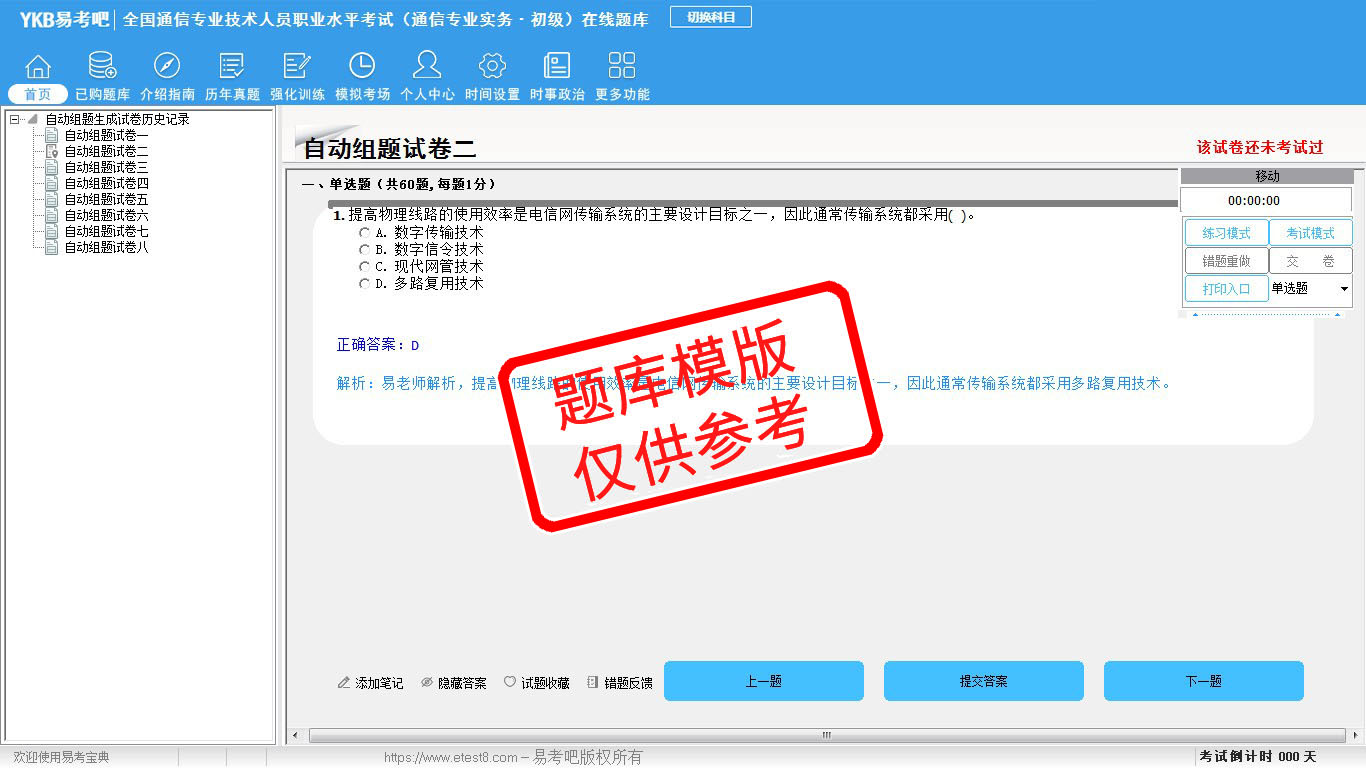 2026年全国通信专业技术人员职业水平考试(初级)易考宝典软件(含2科)(手机/网页版)是《易考宝典》考试系列软件之一,是专门为参加“通信职业资格考试”的朋友量身定做的自我测试系统,是个人、培训学校进行考试前训练、备考冲刺的提分技巧考试平台,题型丰富,图文并茂,内容全面,题库设计符合考试新大纲,海量试题。软件包括了富有价值的模拟考场,有计时打分等功能,就像亲身体会考试一样。