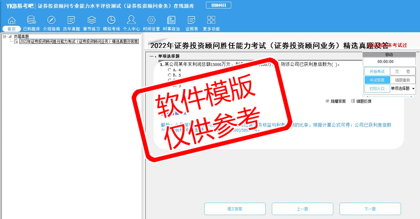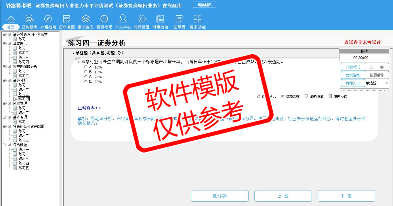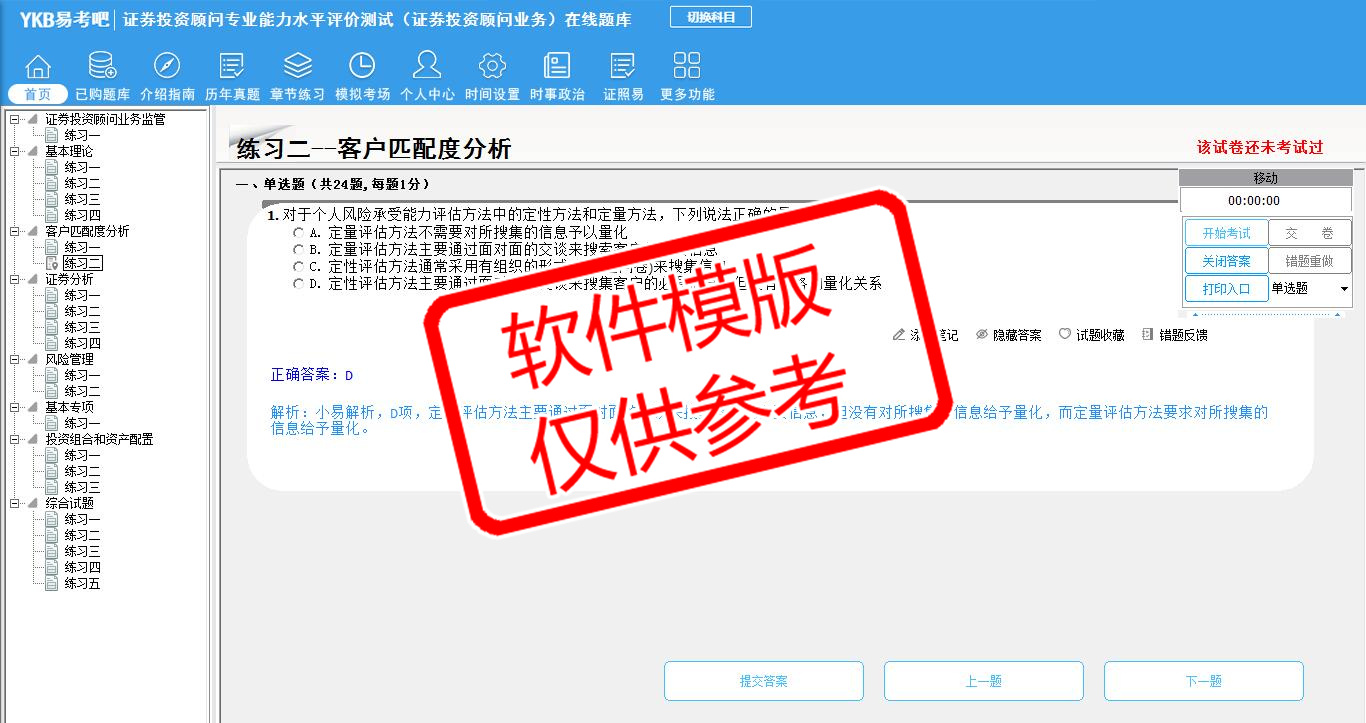 2026年证券投资顾问专业能力水平评价测试(证券投资顾问业务)易考宝典软件(手机/网页版)是《易考宝典》考试系列软件之一,是专门为参加“证券从业职业资格考试”的朋友量身定做的自我测试系统,是个人、培训学校进行考试前训练、备考冲刺的提分技巧考试平台,题型丰富,图文并茂,内容全面,题库设计符合考试新大纲,海量试题。软件包括了富有价值的模拟考场,有计时打分等功能,就像亲身体会考试一样。