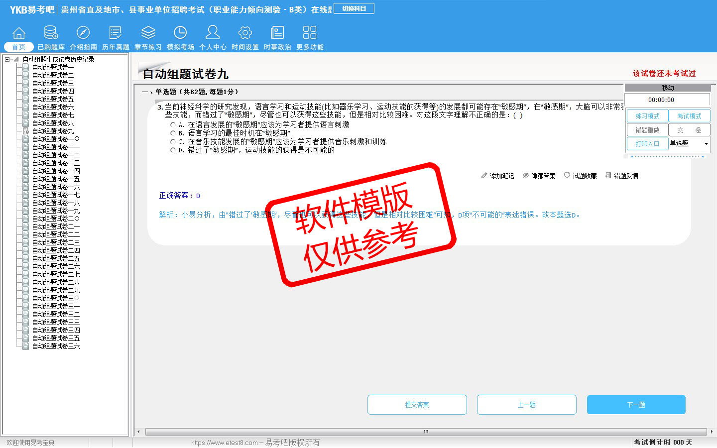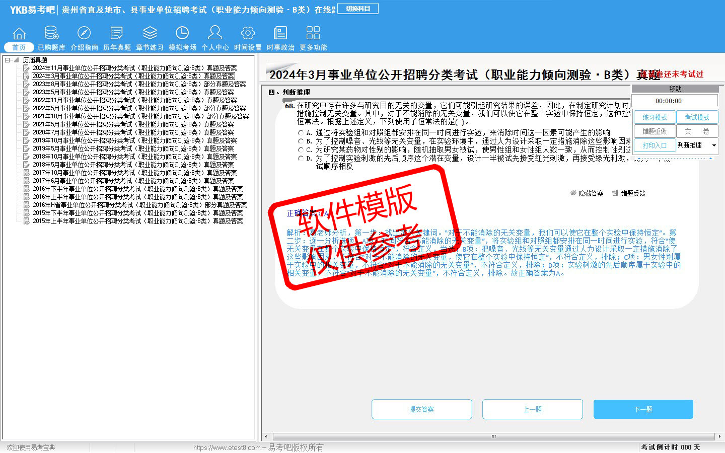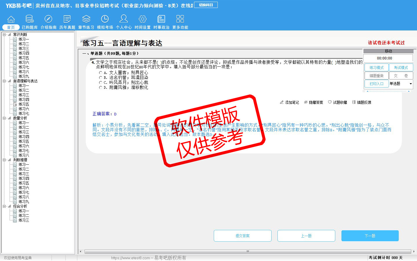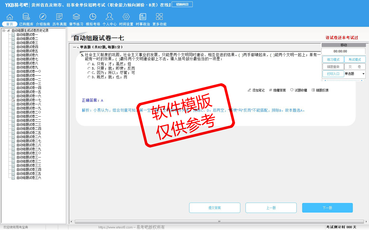 2026年贵州省直及地市、县事业单位招聘考试(社会科学专技类·B类)易考宝典软件(含2科)(手机/网页版)是《易考宝典》考试系列软件之一,是专门为参加“事业单位职业资格考试”的朋友量身定做的自我测试系统,是个人、培训学校进行考试前训练、备考冲刺的提分技巧考试平台,题型丰富,图文并茂,内容全面,题库设计符合考试新大纲,海量试题。软件包括了富有价值的模拟考场,有计时打分等功能,就像亲身体会考试一样。