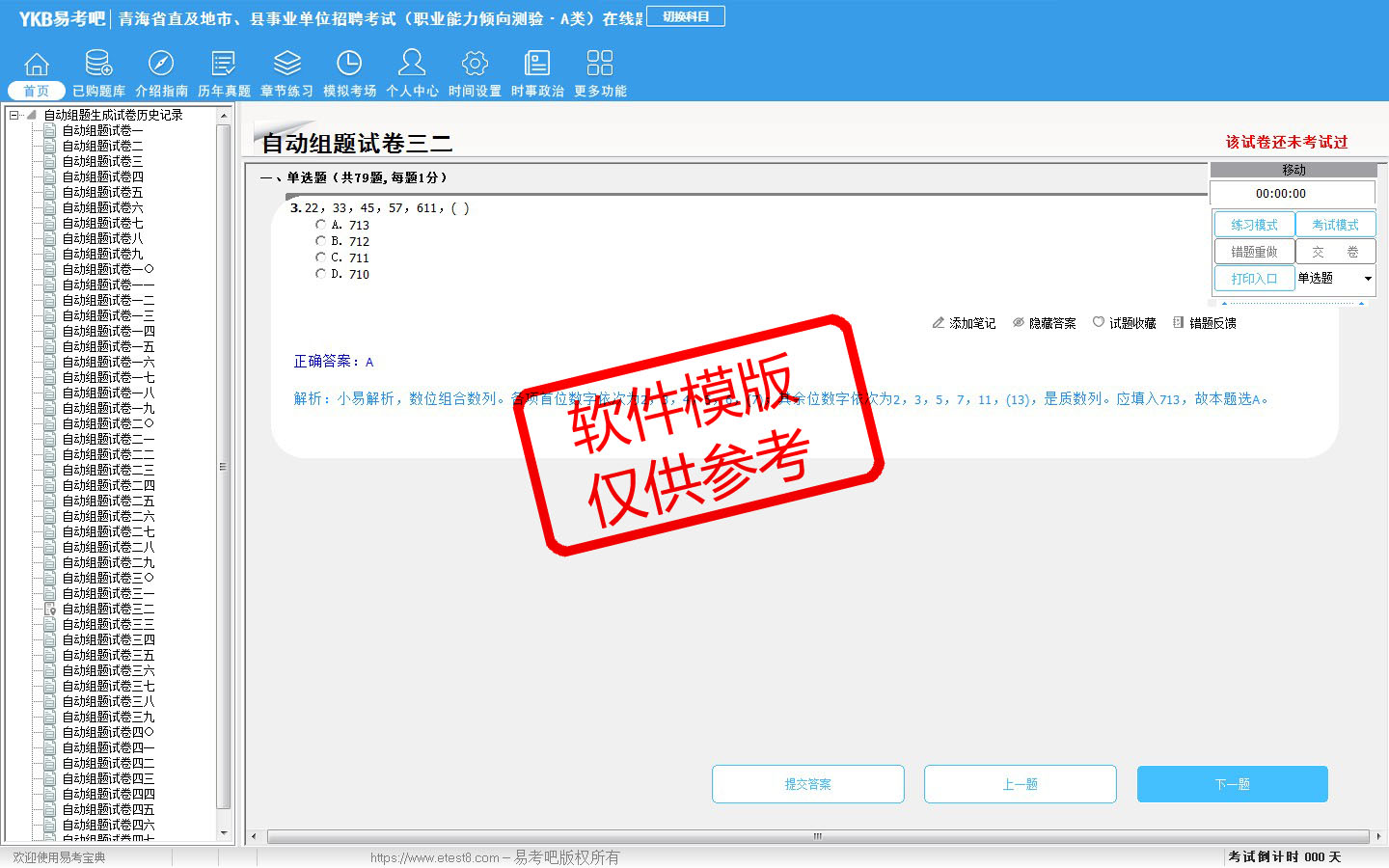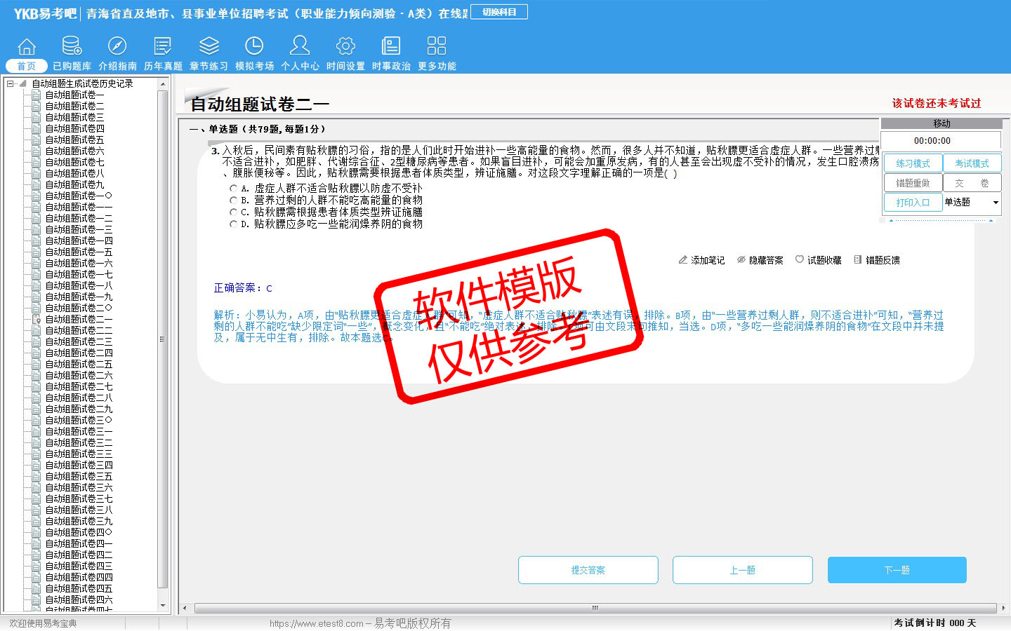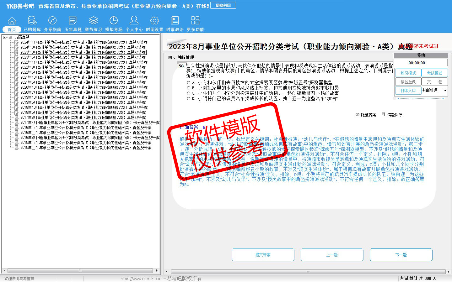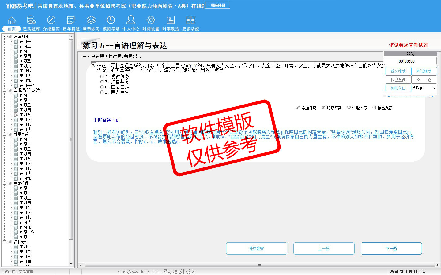 2026年青海省直及地市、县事业单位招聘考试(综合管理类·A类)易考宝典软件(含2科)(手机/网页版)是《易考宝典》考试系列软件之一,是专门为参加“事业单位职业资格考试”的朋友量身定做的自我测试系统,是个人、培训学校进行考试前训练、备考冲刺的提分技巧考试平台,题型丰富,图文并茂,内容全面,题库设计符合考试新大纲,海量试题。软件包括了富有价值的模拟考场,有计时打分等功能,就像亲身体会考试一样。