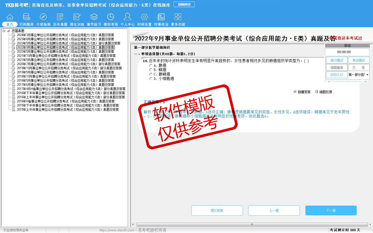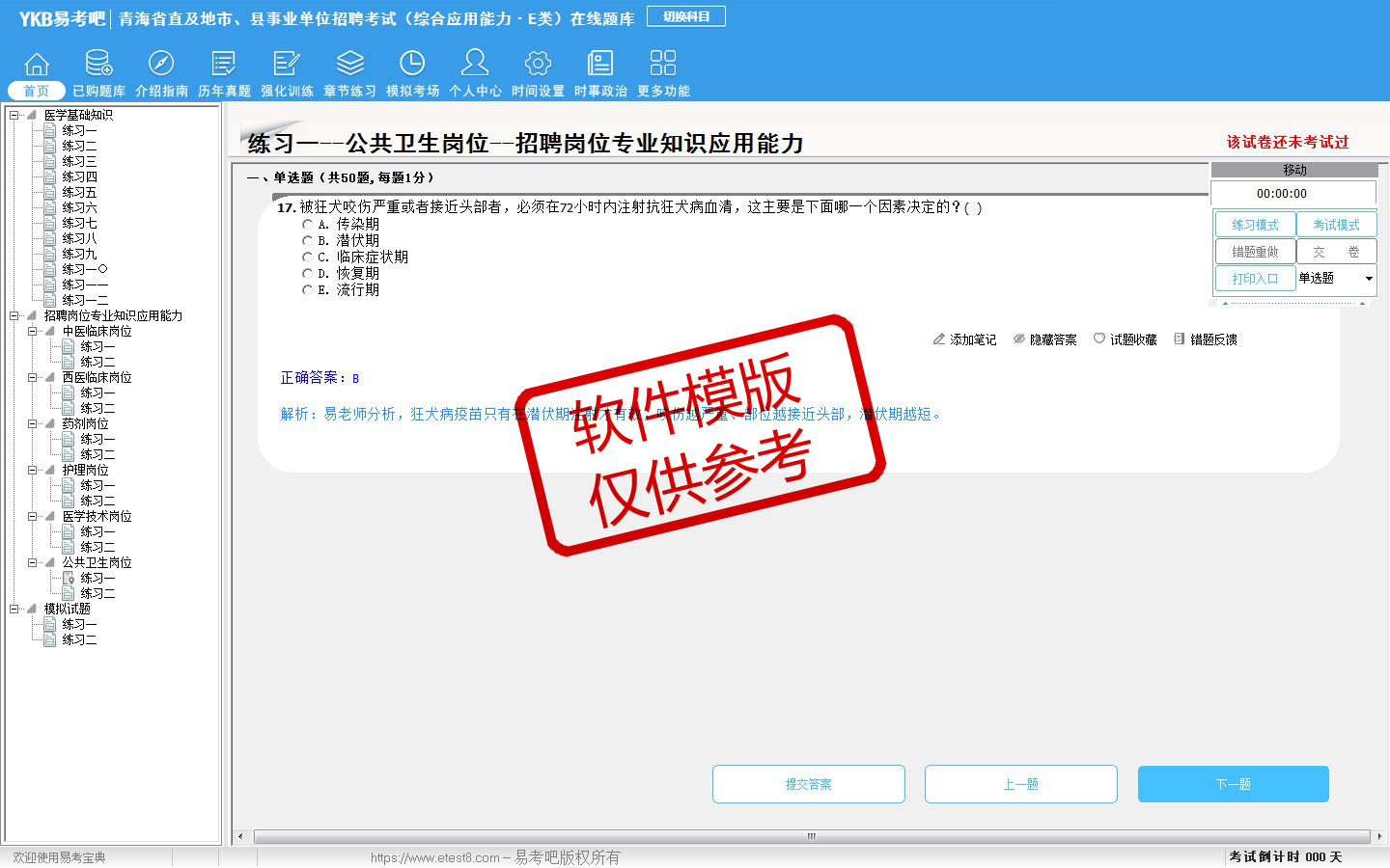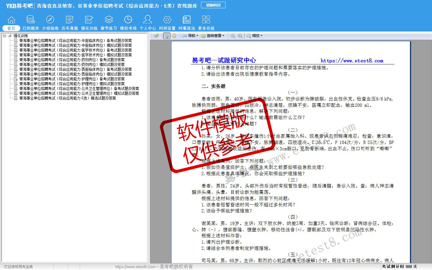 2026年青海省直及地市、县事业单位招聘考试(医疗卫生类·E类)易考宝典软件(含2科)(手机/网页版)是《易考宝典》考试系列软件之一,是专门为参加“事业单位职业资格考试”的朋友量身定做的自我测试系统,是个人、培训学校进行考试前训练、备考冲刺的提分技巧考试平台,题型丰富,图文并茂,内容全面,题库设计符合考试新大纲,海量试题。软件包括了富有价值的模拟考场,有计时打分等功能,就像亲身体会考试一样。
