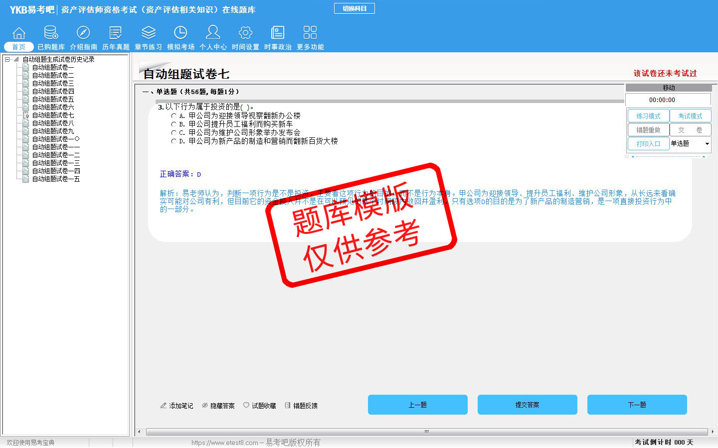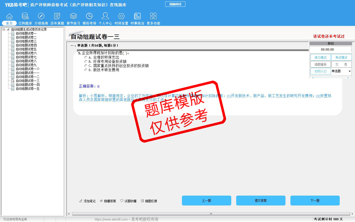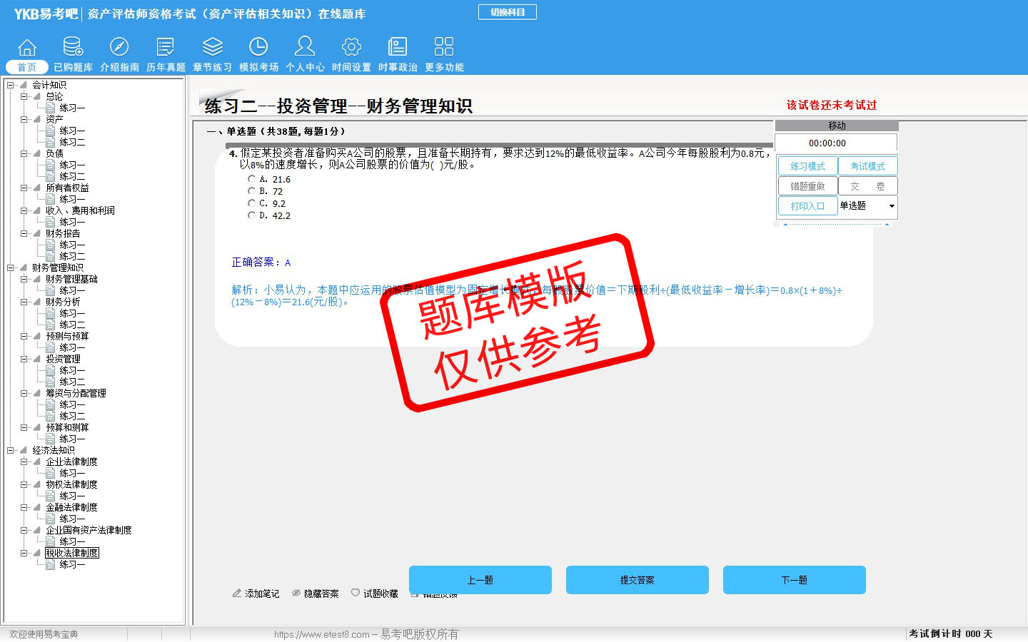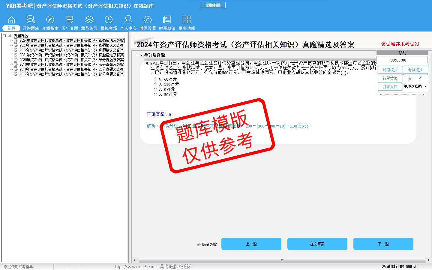 2026年资产评估师资格考试(资产评估相关知识)易考宝典软件(手机/网页版)是《易考宝典》考试系列软件之一,是专门为参加“资产评估师职业资格考试”的朋友量身定做的自我测试系统,是个人、培训学校进行考试前训练、备考冲刺的提分技巧考试平台,题型丰富,图文并茂,内容全面,题库设计符合考试新大纲,海量试题。软件包括了富有价值的模拟考场,有计时打分等功能,就像亲身体会考试一样。