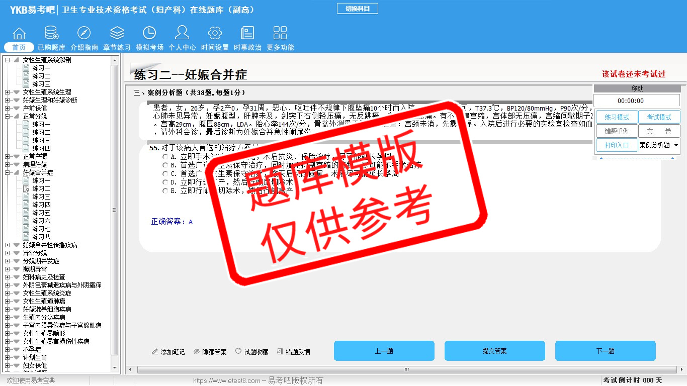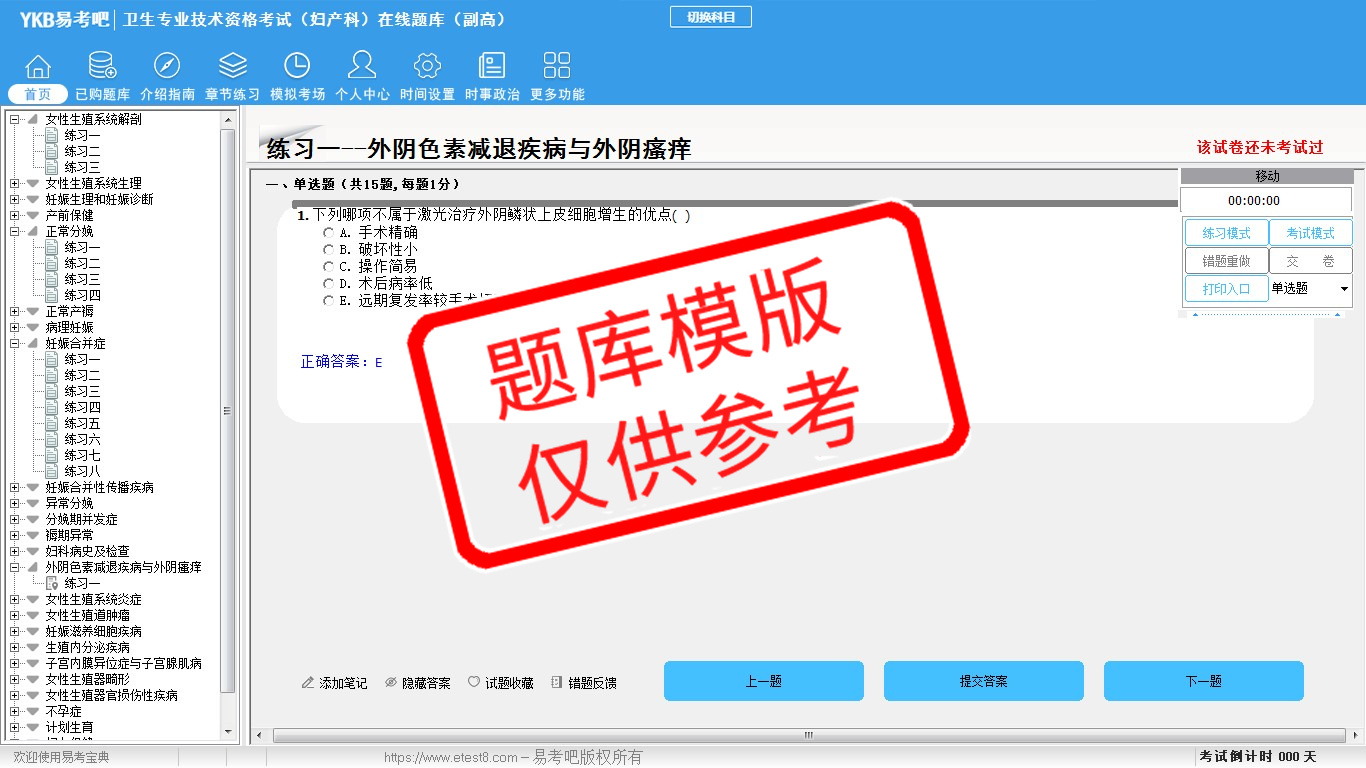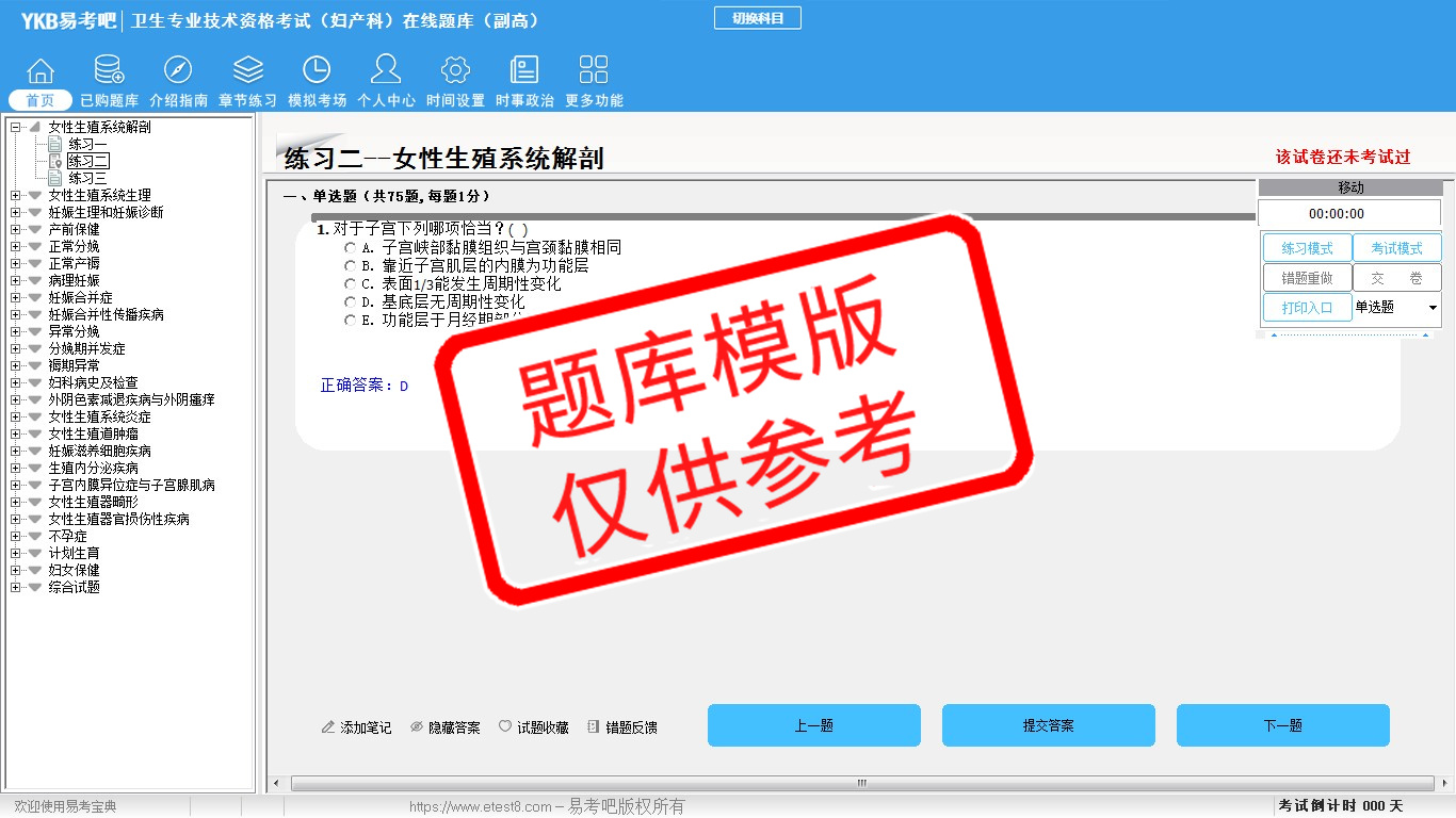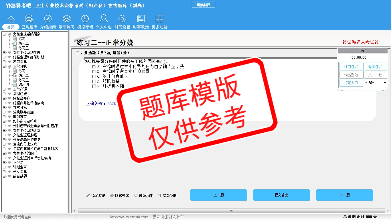 2026年卫生专业技术资格考试(妇产科·代码019)易考宝典软件(副高)(手机/网页版)是《易考宝典》考试系列软件之一,是专门为参加“高级职称职业资格考试”的朋友量身定做的自我测试系统,是个人、培训学校进行考试前训练、备考冲刺的提分技巧考试平台,题型丰富,图文并茂,内容全面,题库设计符合考试新大纲,海量试题。软件包括了富有价值的模拟考场,有计时打分等功能,就像亲身体会考试一样。