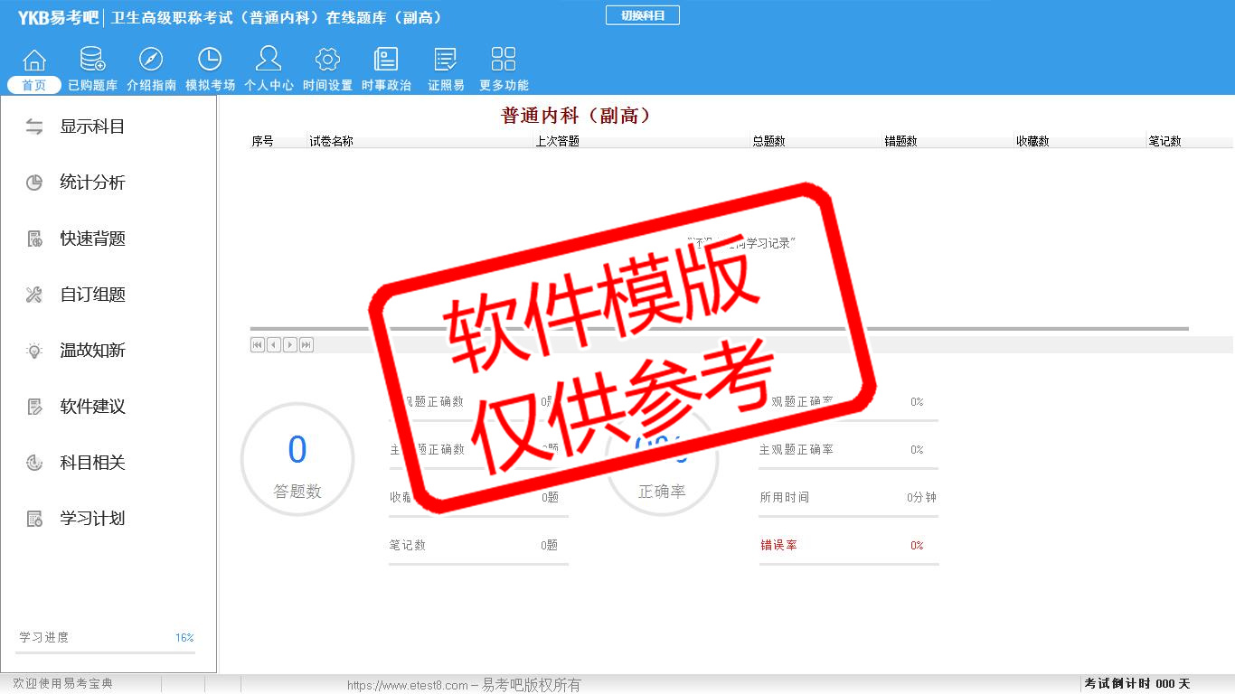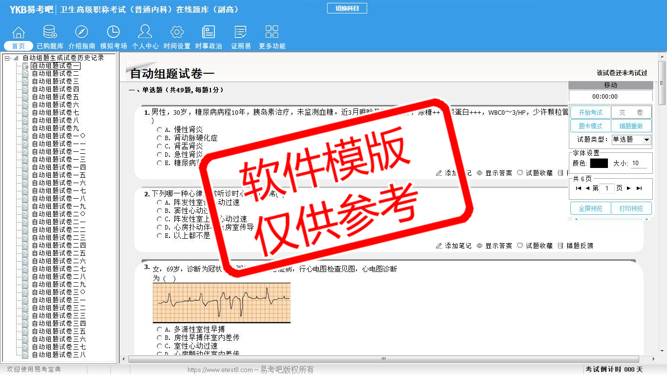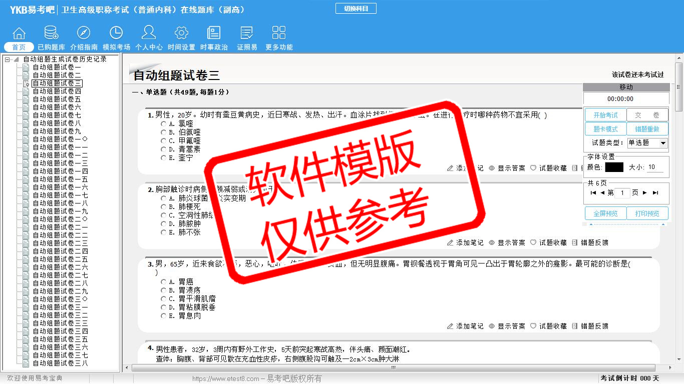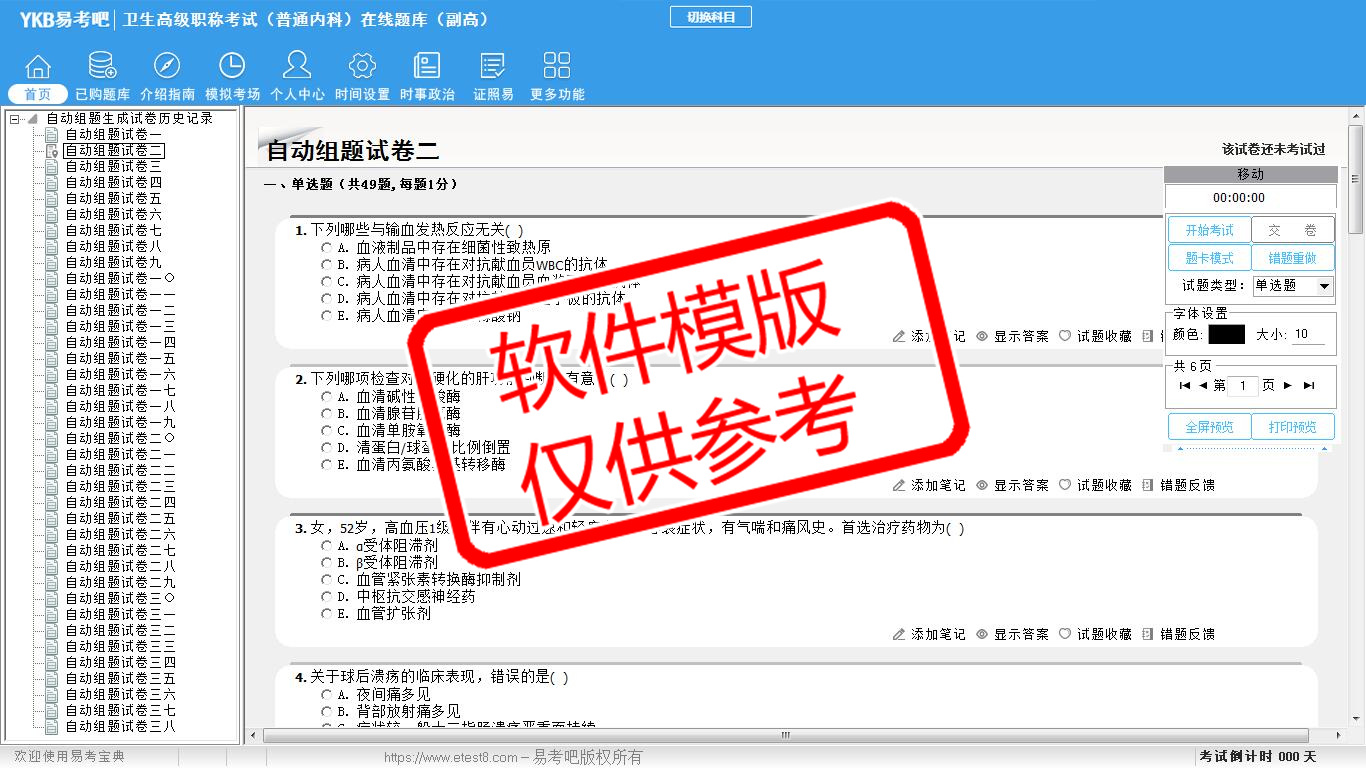 2026年卫生高级职称考试(普通内科·代码063)易考宝典软件(副高)(手机/网页版)是《易考宝典》考试系列软件之一,是专门为参加“高级职称职业资格考试”的朋友量身定做的自我测试系统,是个人、培训学校进行考试前训练、备考冲刺的提分技巧考试平台,题型丰富,图文并茂,内容全面,题库设计符合考试新大纲,海量试题。软件包括了富有价值的模拟考场,有计时打分等功能,就像亲身体会考试一样。