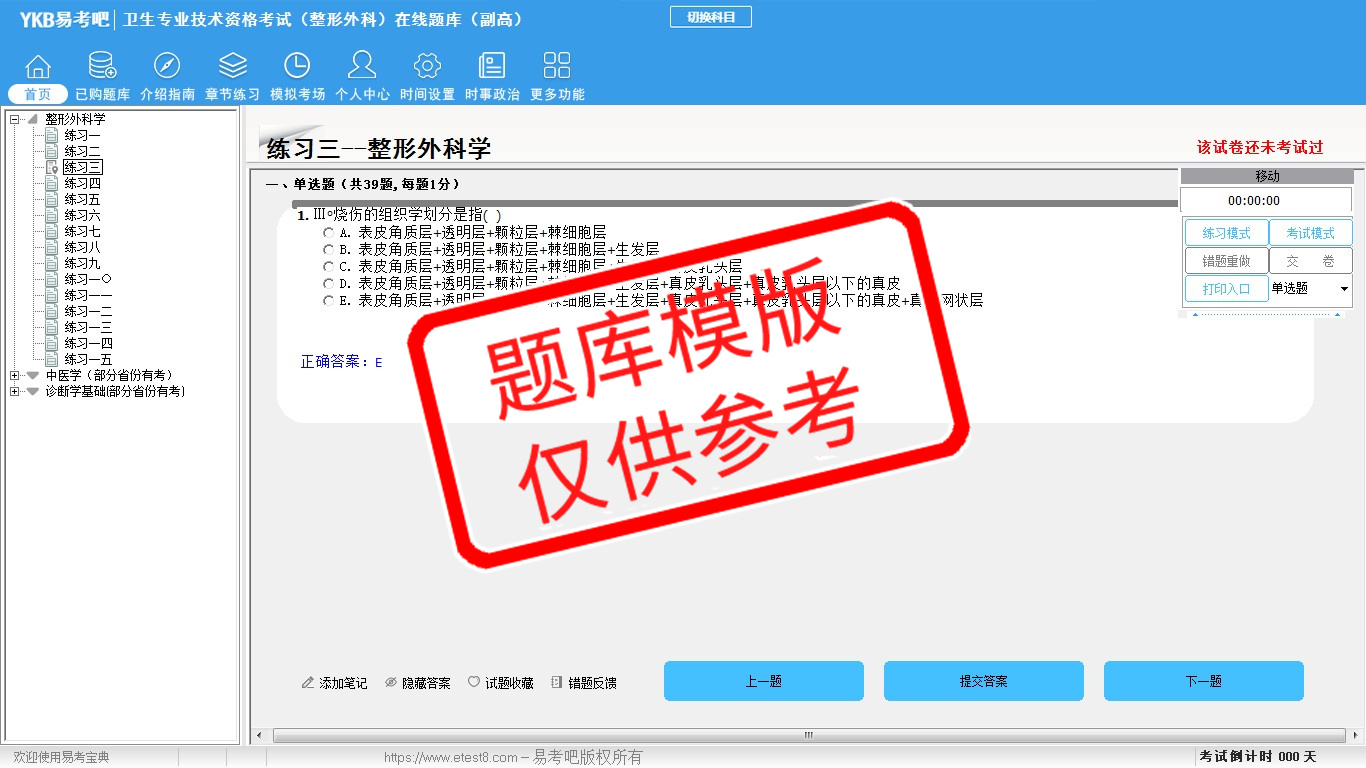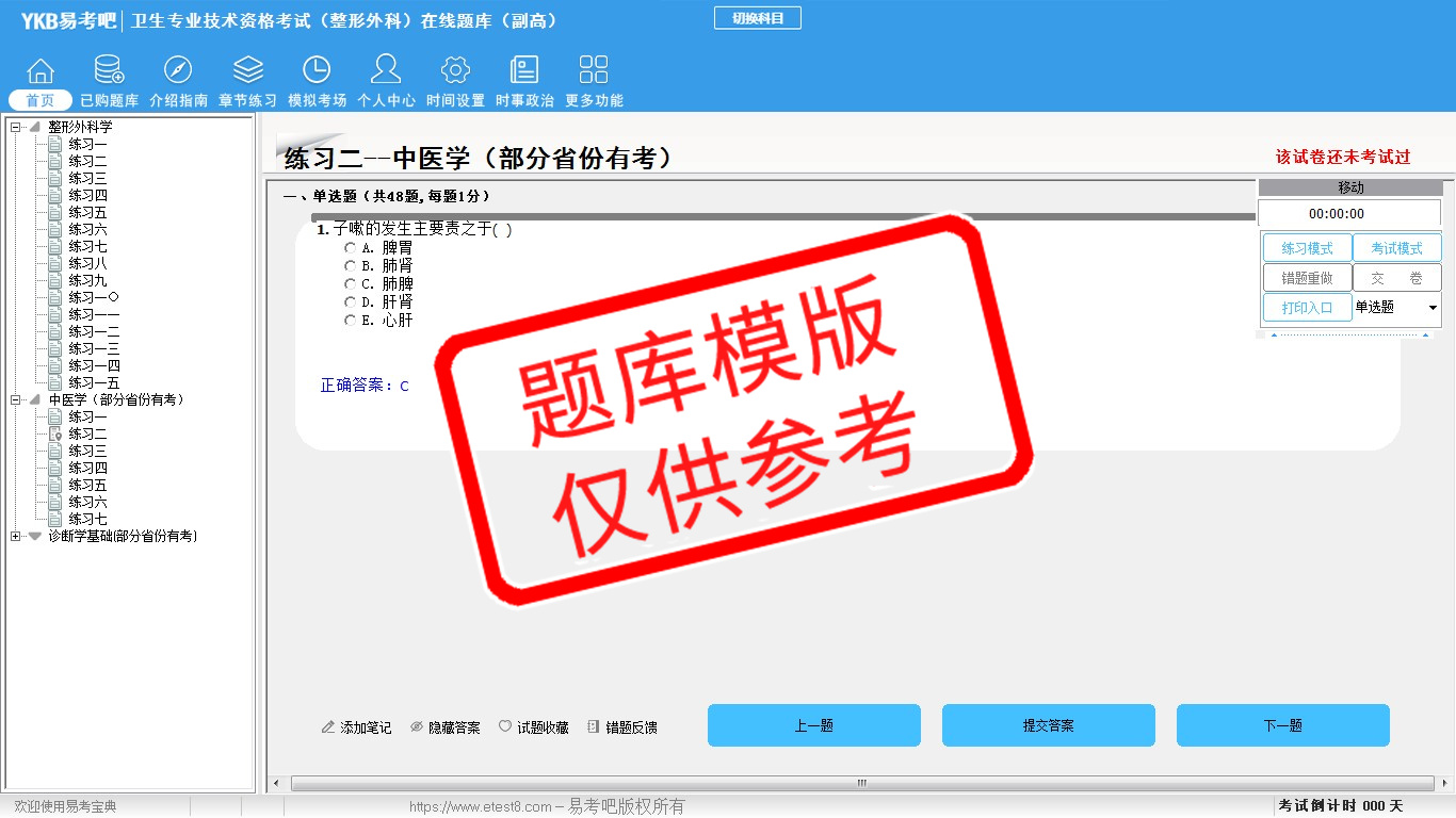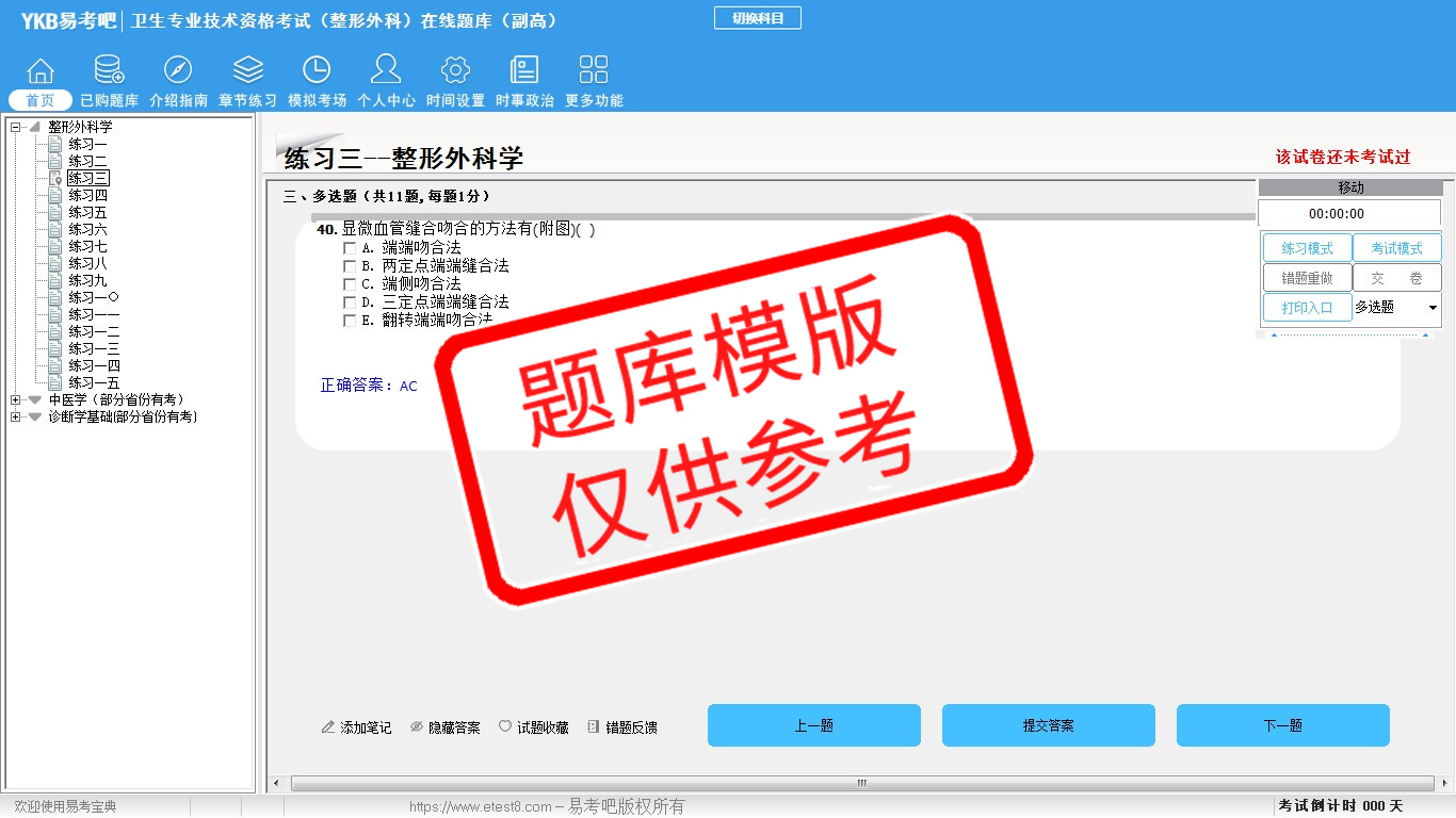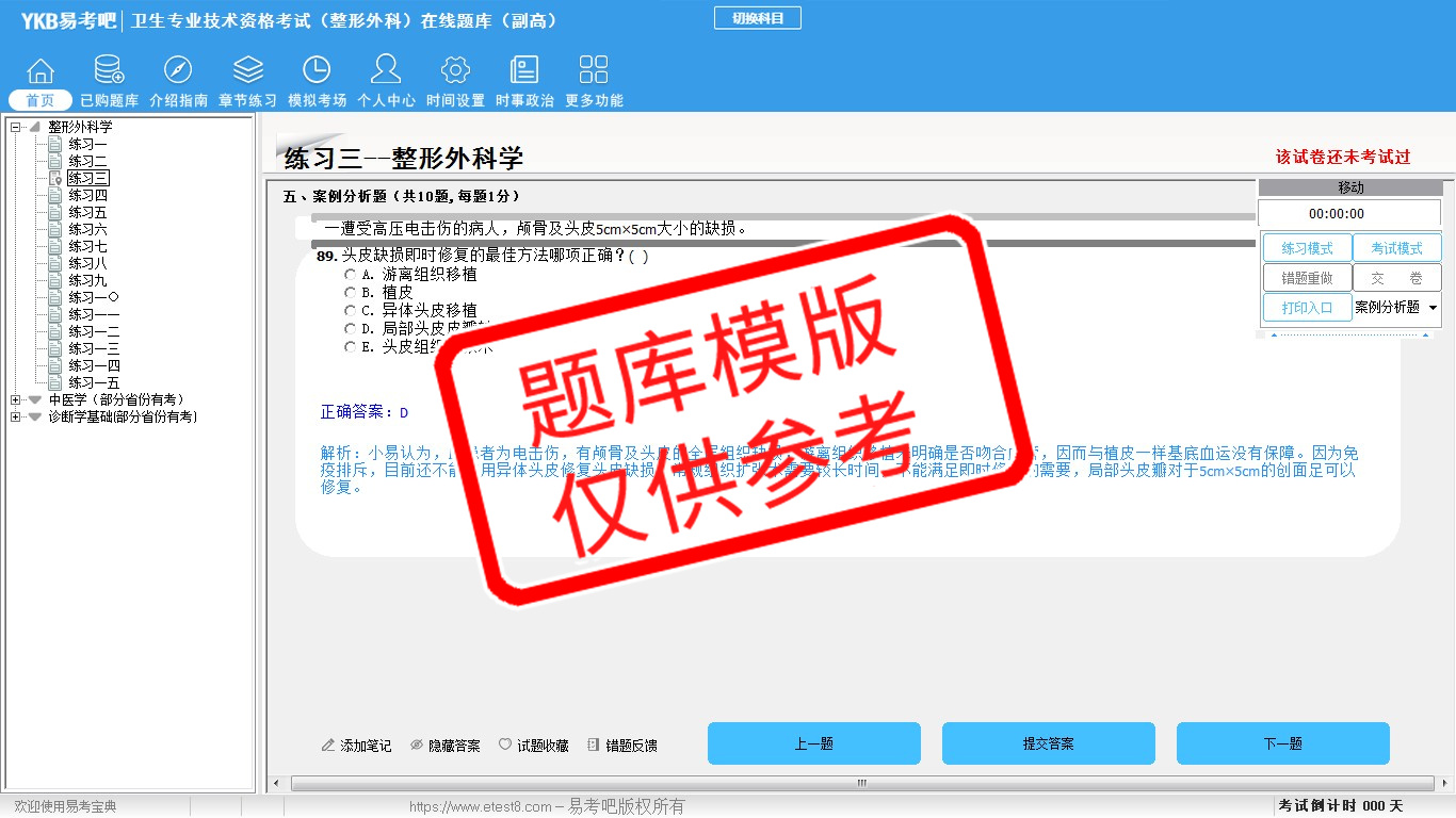 2026年卫生专业技术资格考试(整形外科·代码017)易考宝典软件(副高) (手机/网页版)是《易考宝典》考试系列软件之一,是专门为参加“高级职称职业资格考试”的朋友量身定做的自我测试系统,是个人、培训学校进行考试前训练、备考冲刺的提分技巧考试平台,题型丰富,图文并茂,内容全面,题库设计符合考试新大纲,海量试题。软件包括了富有价值的模拟考场,有计时打分等功能,就像亲身体会考试一样。