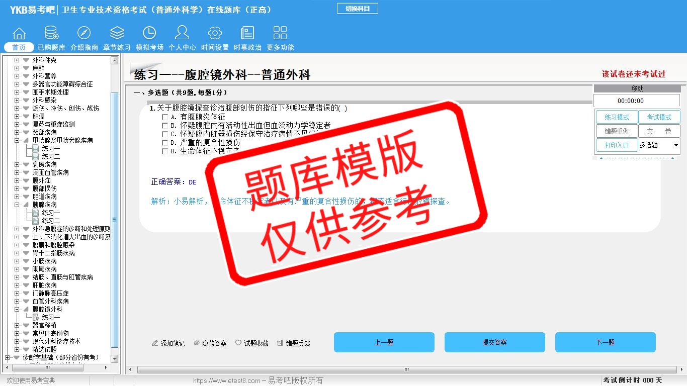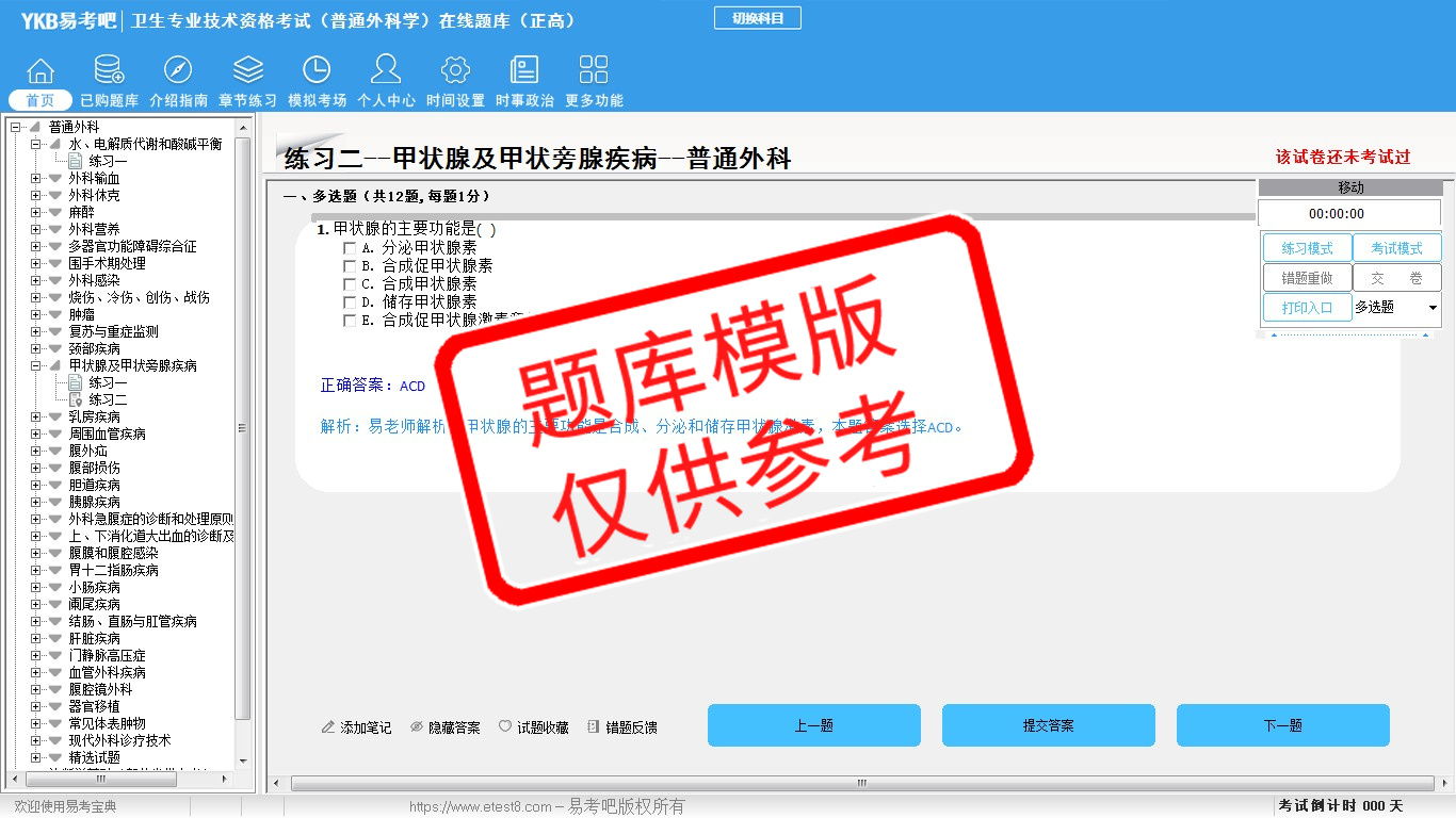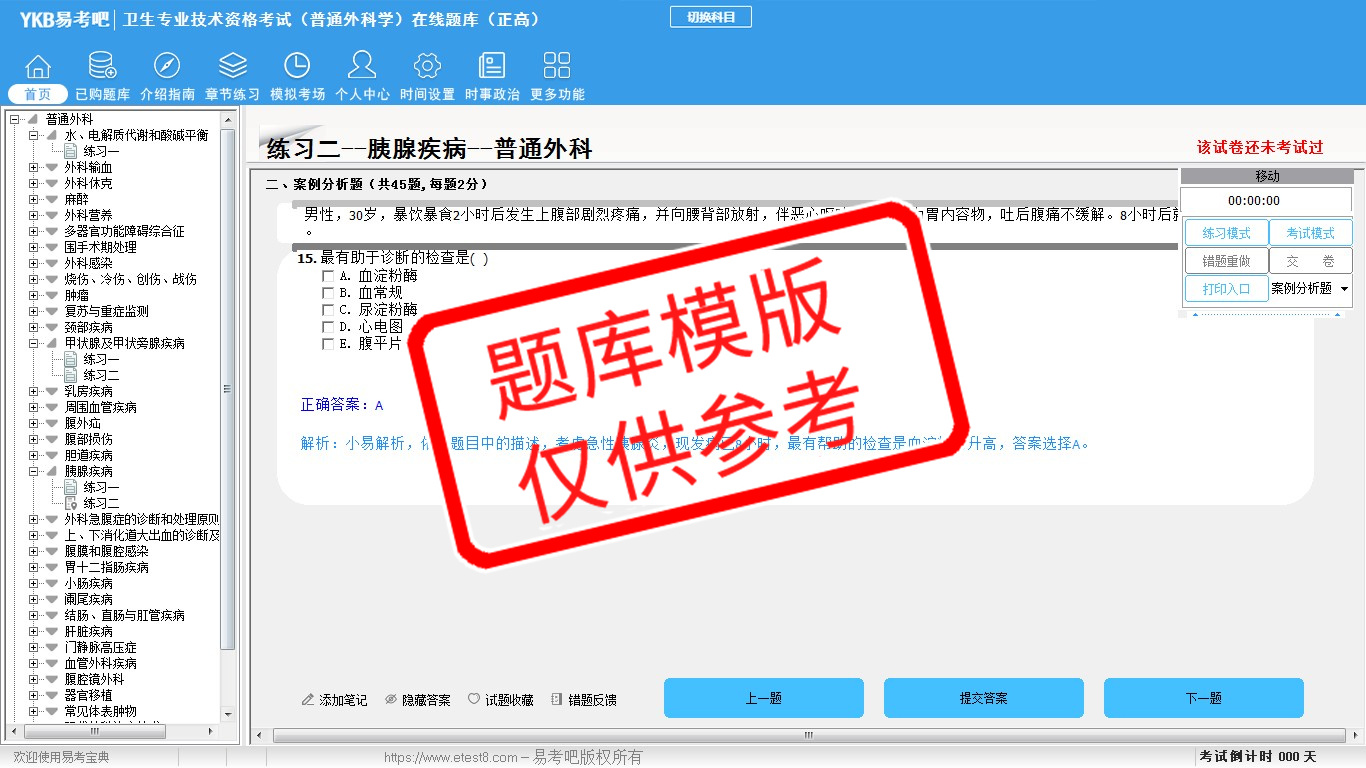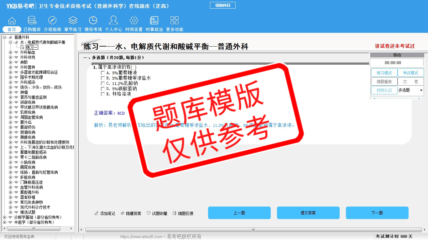 2026年卫生专业技术资格考试(普通外科学·代码011)易考宝典软件(正高)(手机/网页版)是《易考宝典》考试系列软件之一,是专门为参加“高级职称职业资格考试”的朋友量身定做的自我测试系统,是个人、培训学校进行考试前训练、备考冲刺的提分技巧考试平台,题型丰富,图文并茂,内容全面,题库设计符合考试新大纲,海量试题。软件包括了富有价值的模拟考场,有计时打分等功能,就像亲身体会考试一样。